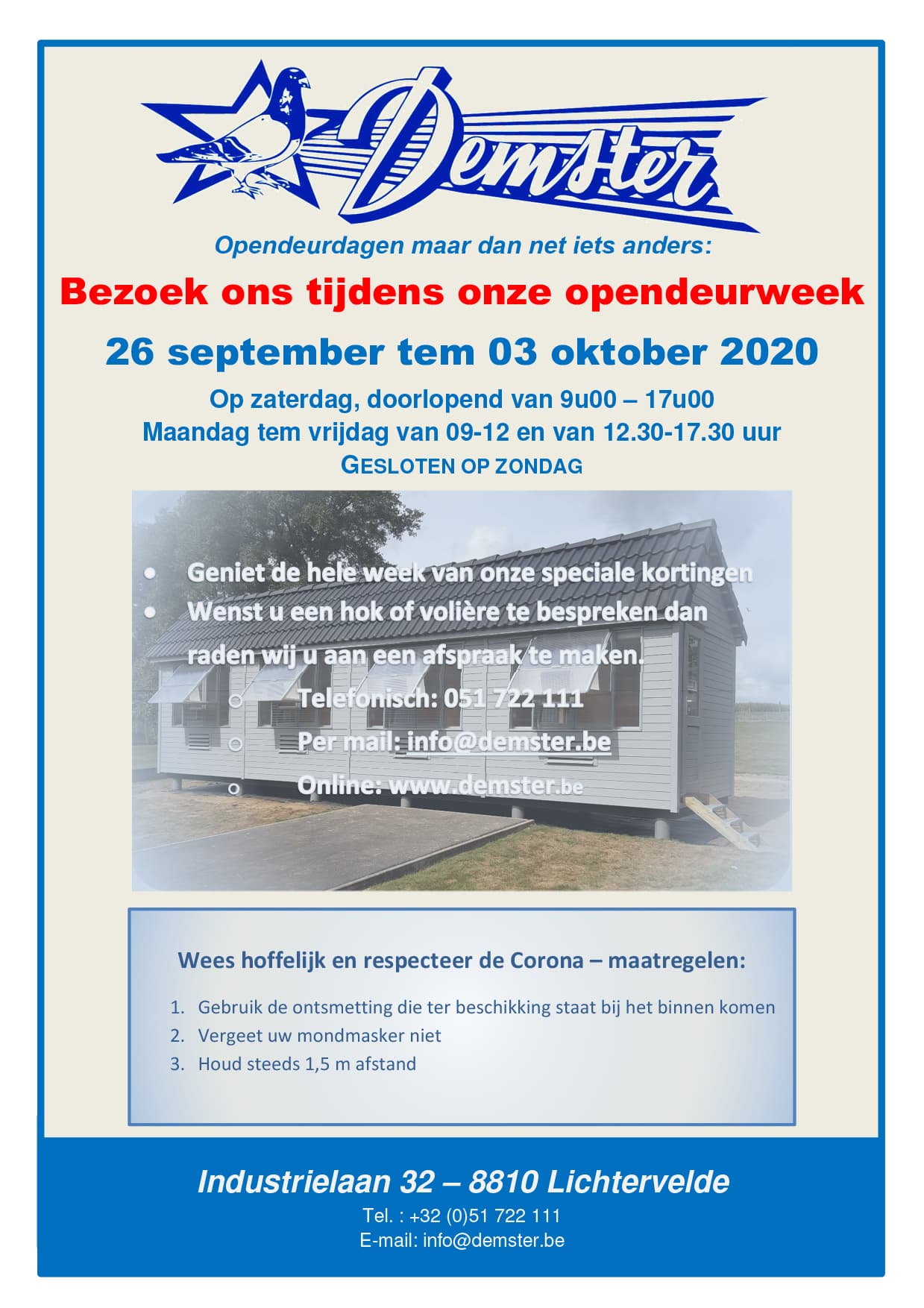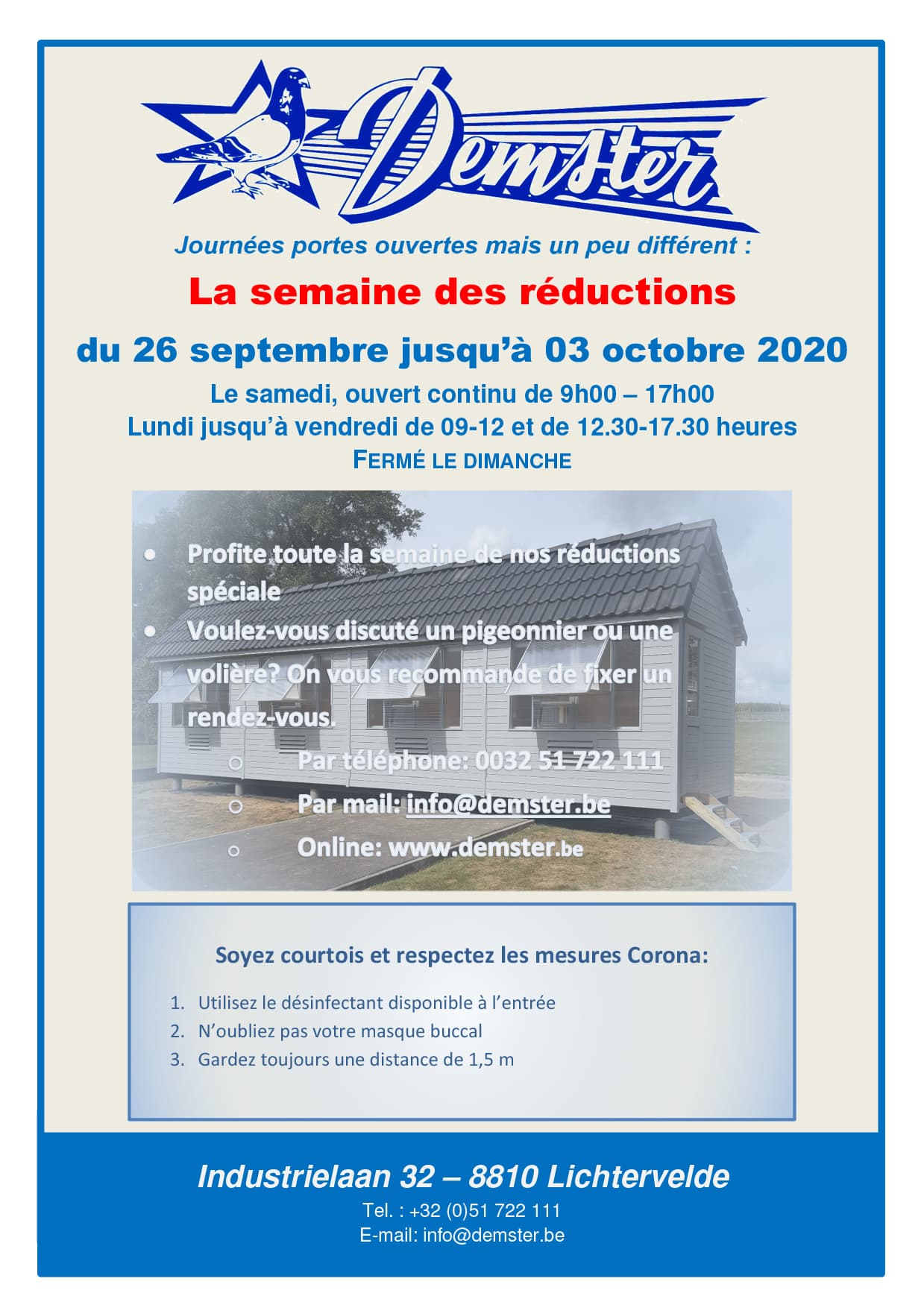 ![]() Meilleur colombophile, Nous vous souhaitons la bienvenue dans notre magasin du samedi 26 septembre au samedi 03 octobre 2020. Au cours de cette semaine, vous pouvez profiter de nos promotions et réductions spéciales, comme chaque année. Si vous souhaitez discuter un pigeonnier ou une volière, nous vous recommandons de prendre rendez-vous. Cela peut être fait par téléphone, e-mail ou en ligne. De cette façon, vous évitez les longs délais d'attente. Soyez le bienvenue ! |