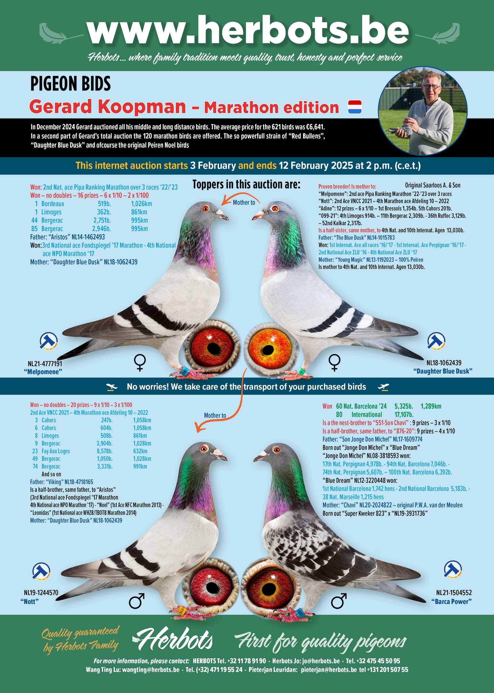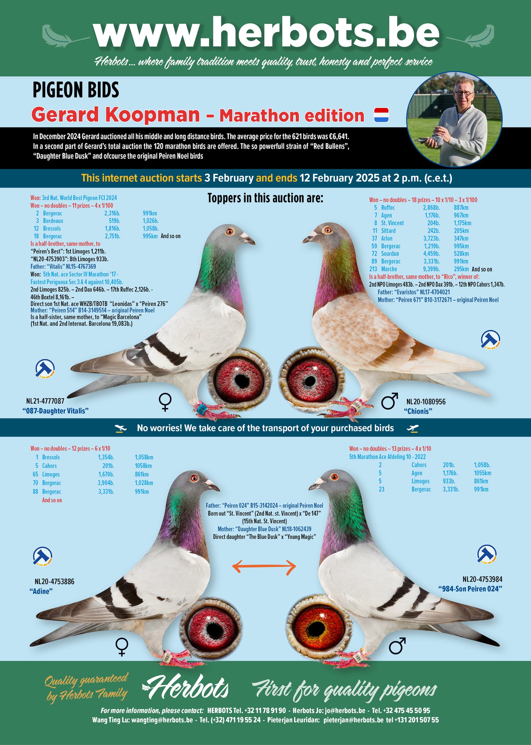 L'équipe Koopman a réalisé l'un des meilleurs résultats des Pays-Bas à Barcelone 2024 (distance de 1 289 km). En national contre 5.325 pigeons, Gerard a gagné : 60-98-162-171-203-365-381-...