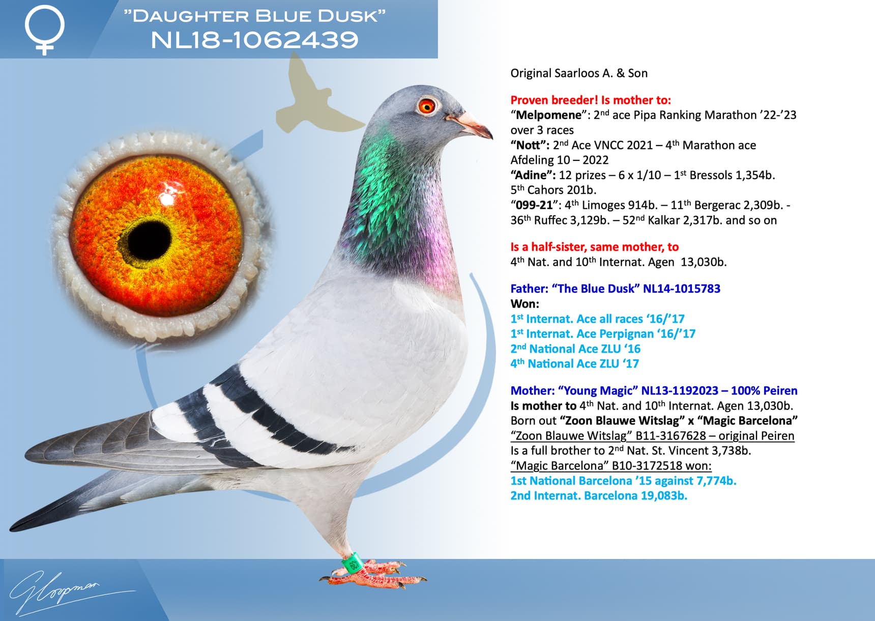 Elle est une fille de « The Blue Dusk » et il s'agit du 1er as international - toutes races » “16/”17 - 1st Internat. Ace Pigeon Perpignan '16/'17. Associée à plusieurs mâles, « Fille Crépuscule Bleu » est devenue la mère de :