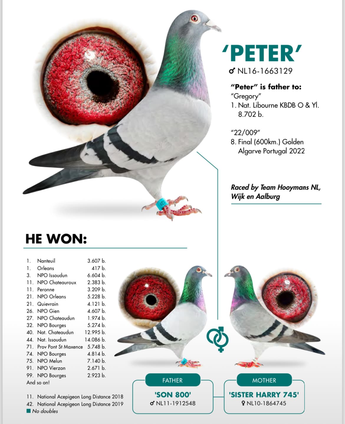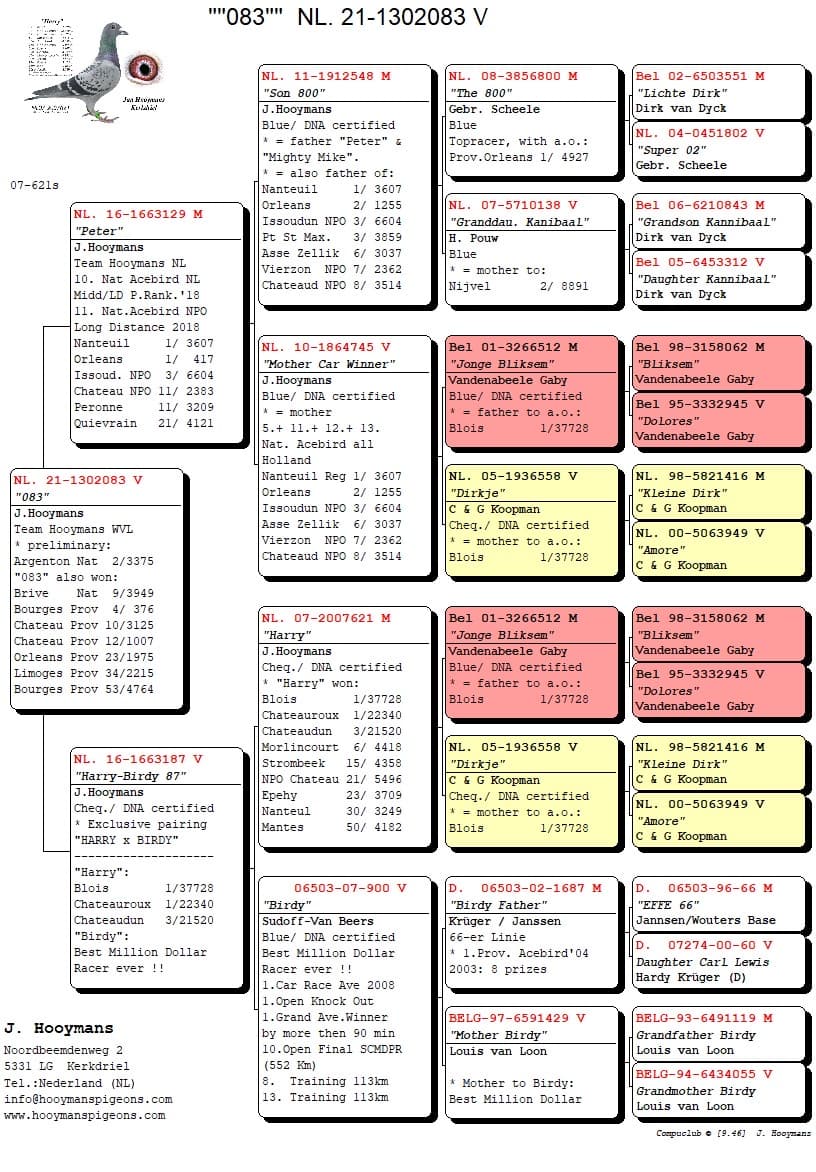 "083" a clairement hérité de la classe de ses parents. Son père, "Peter", était un excellent voyageur au sein de l'équipe Hooymans NL à Wijk et Aalburg avant de trouver sa place dans le pigeonnier d'élévage de Hooymans Pigeons à Kerkdriel. La qualité de cette lignée est confirmée par "Mighty Mike", le frère de "Peter". "Mighty Mike" a non seulement prouvé qu'il était un excellent voyageur, mais il a également produit le 1er Issoudun National Sector III aux Pays-Bas cette saison contre 8.834 pigeons pour l'équipe Hooymans NL à Wijk en Aalburg.