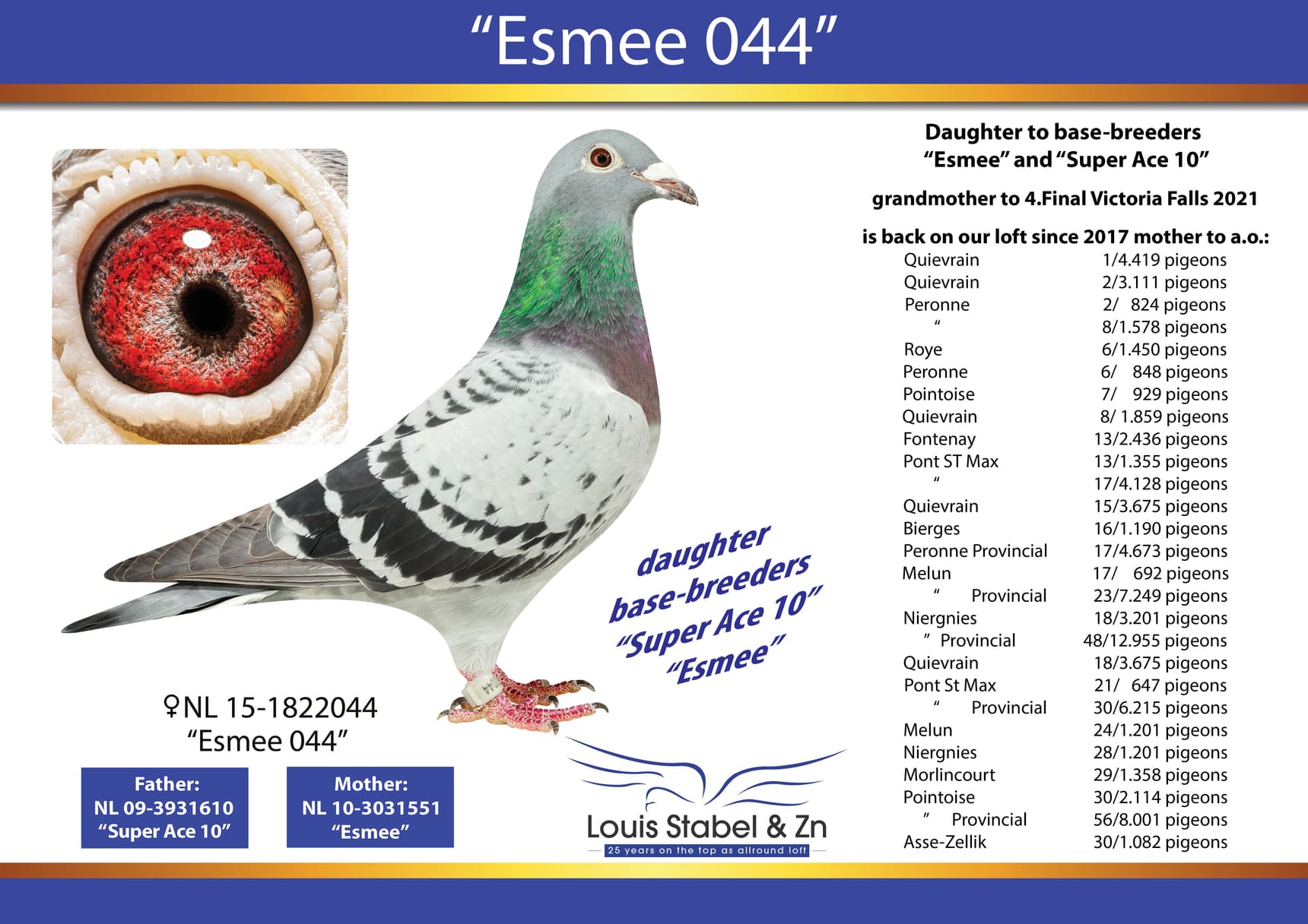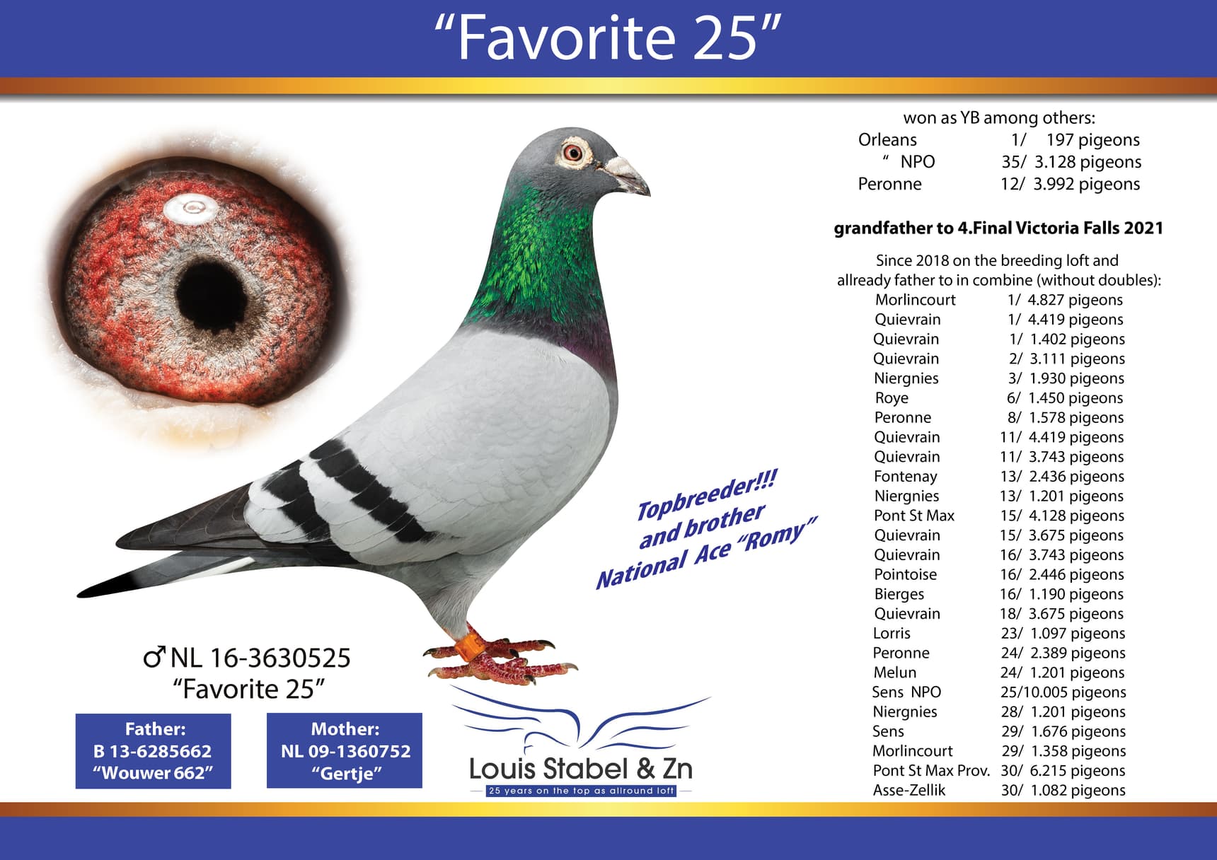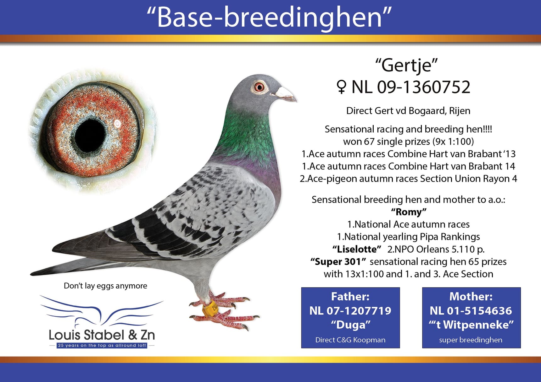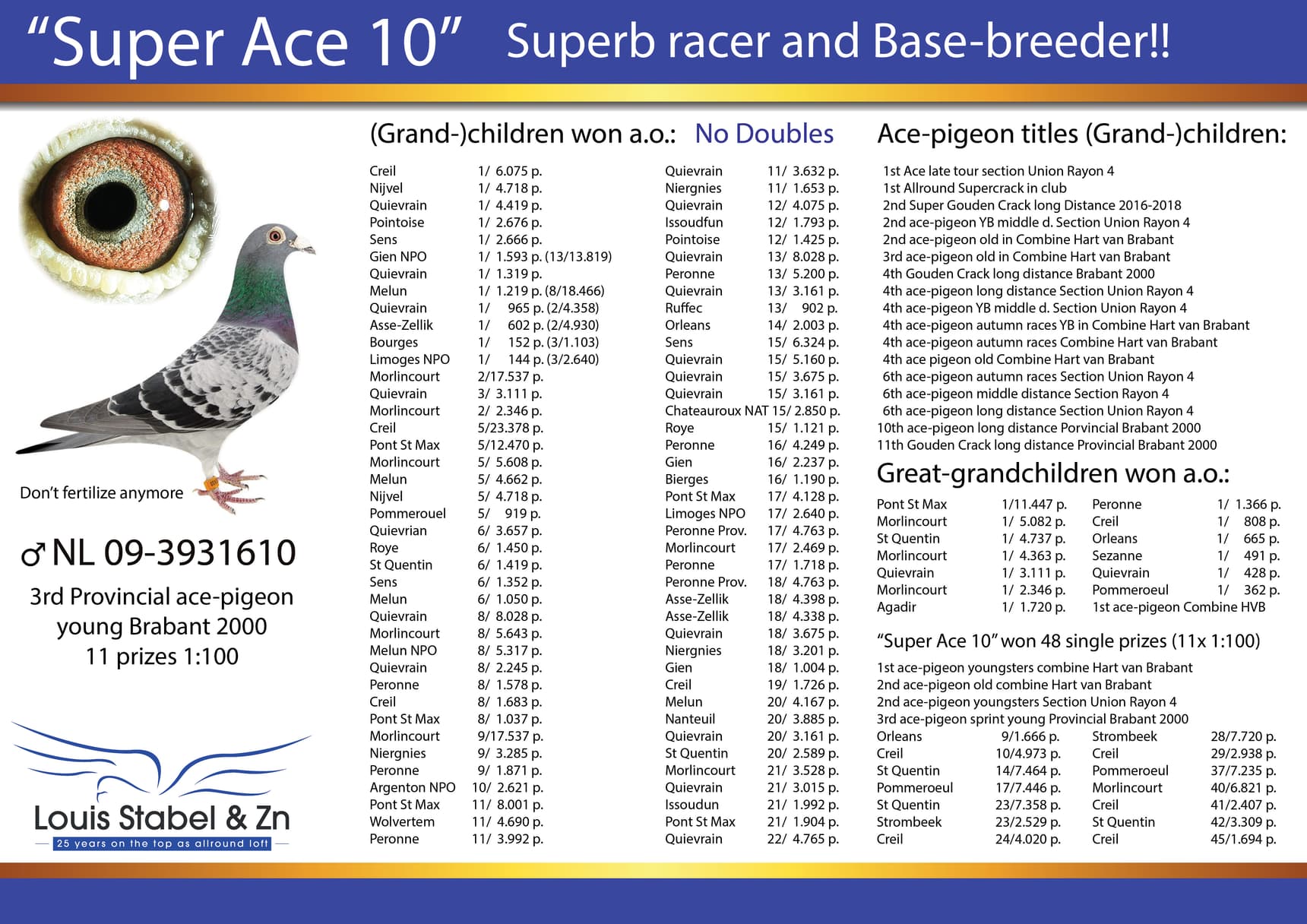 The father (Louis) and son (Eugene) combination is able to be constantly at the top in club and the combines, and also National they have very good results. They take part in all the races organised bij semi-national organisation Brabant 2000 and had on all distances good results but they are on their best on races from 100-650 km.