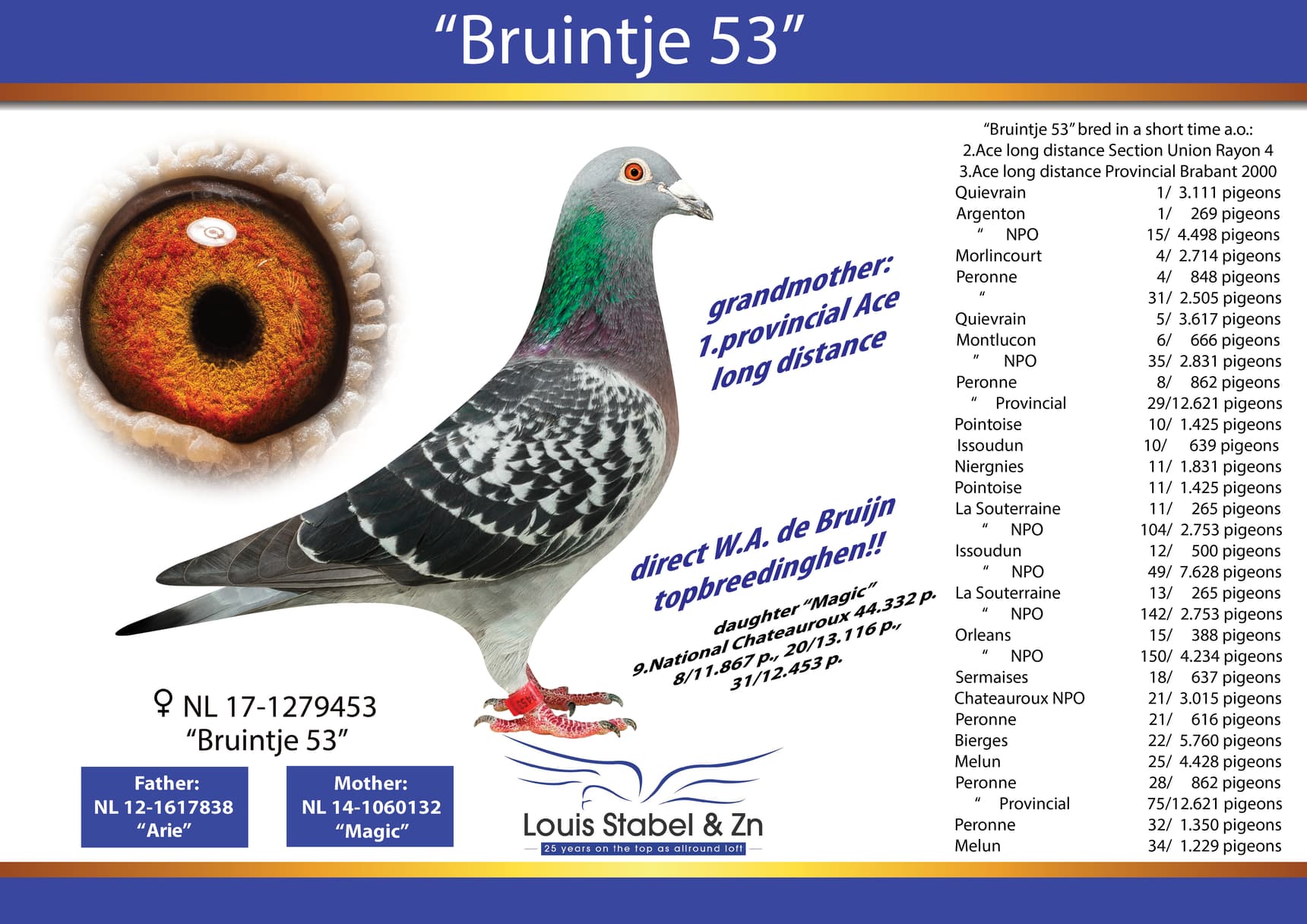 In 1985 the first success came with 3rd prize from Dax against 13,308 pigeons, this hen had previously won 16th National Bergerac, 15,069 pigeons and 7th National St. Vincent, 19,344 pigeons. A year later Louis won 1st National Orleans District 1 against 6,275 pigeons. In each of the following years the results stayed very well.