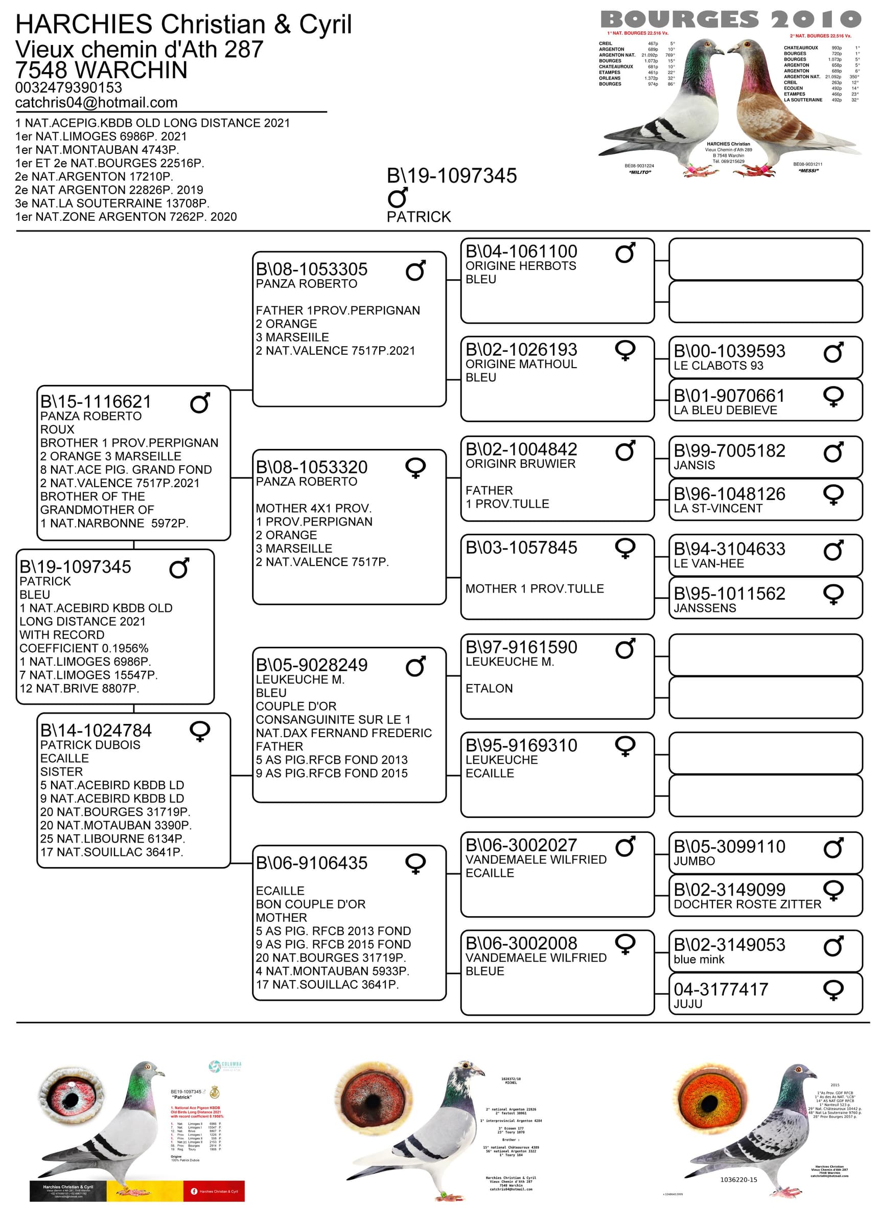 Pour couronner le tout, Patrick Dubois est aussi l’éleveur du fameux crack de Christian Harchies & Cyril de Warchin :  BE19-1097345 nommé d’ailleurs ‘Patrick’ qui tenez-vous bien, presta en 2021 : le 12ème Nat. Brive (8.807P), le 7ème National Limoges I (15.547P) et finira en beauté sa saison avec le 1er National Limoges II (6.986P). Ce ‘PATRICK’ est devenu 1er As-Pigeon National Fond RFCB 2021, en réalisant un coefficient ‘incroyable et record’ de 0,1956%, pulvérisant ainsi le meilleur coefficient belge de tous les temps (0,2396%) détenu jusque-là par le célèbre pigeon ‘ARMANDO’ (1 er As-Pigeon National Fond RFCB 2018) de Joël Verschoot et inutile de vous dire que le coefficient record de ‘PATRICK’ sera très difficile à battre.