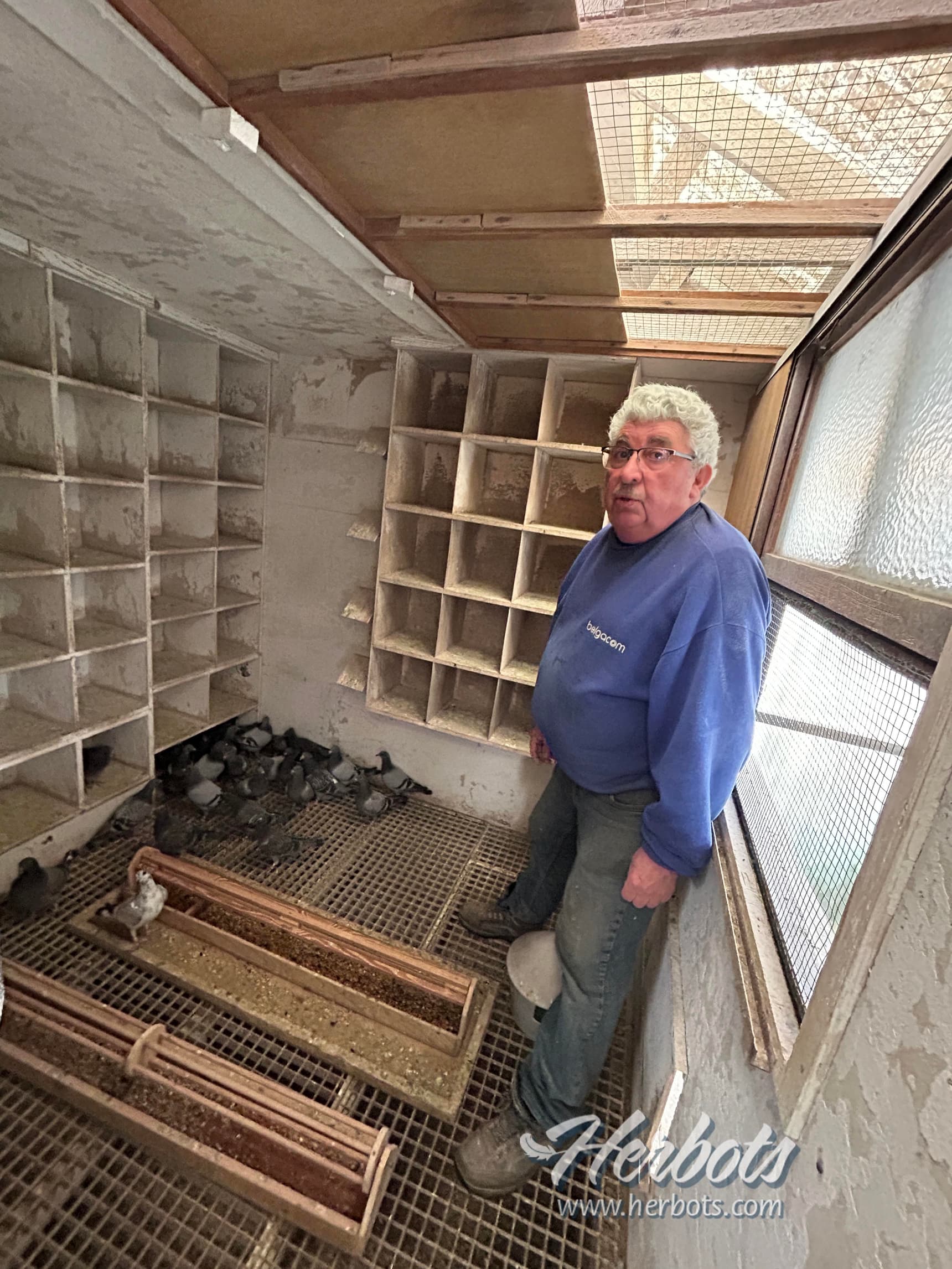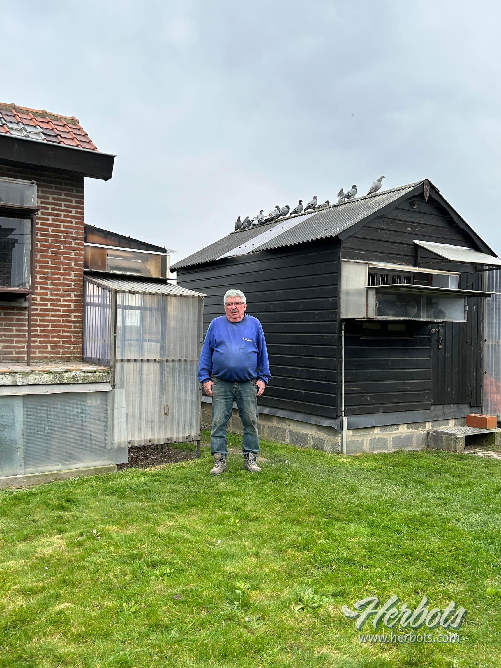 C’est dans le village de Gaurain-Ramecroix (commune de l’entité de Tournai), juste à côté des carrières exploitées par la société cimentière CBR, que résident Patrick Dubois et son épouse Françoise. Patrick, aujourd’hui âgé de 71 ans, retraité Belgacom depuis 2002, originaire de Kain est venu s’installer en 1977 dans ce village où il y a construit de ses propres mains, son pigeonnier et tout a été pensé pour le bien être des pigeons, le côté pratique n’a pas été oublié car tout est très fonctionnel et l’espace a été utilisé avec ingéniosité par Patrick. En effet, le pigeonnier est bâti en briques, sur 2 niveaux : au rez-de-chaussée/sous-sol (1er niveau), sont logés l’ensemble des reproducteurs, et à l’étage (second niveau), nous trouvons les voyageurs (vieux et yearlings), ainsi que les volières des femelles accolées derrière le pigeonnier. A côté de ce pigeonnier en brique, se trouve un abri en bois, ou sont logés et joués les pigeonneaux, après sevrage.