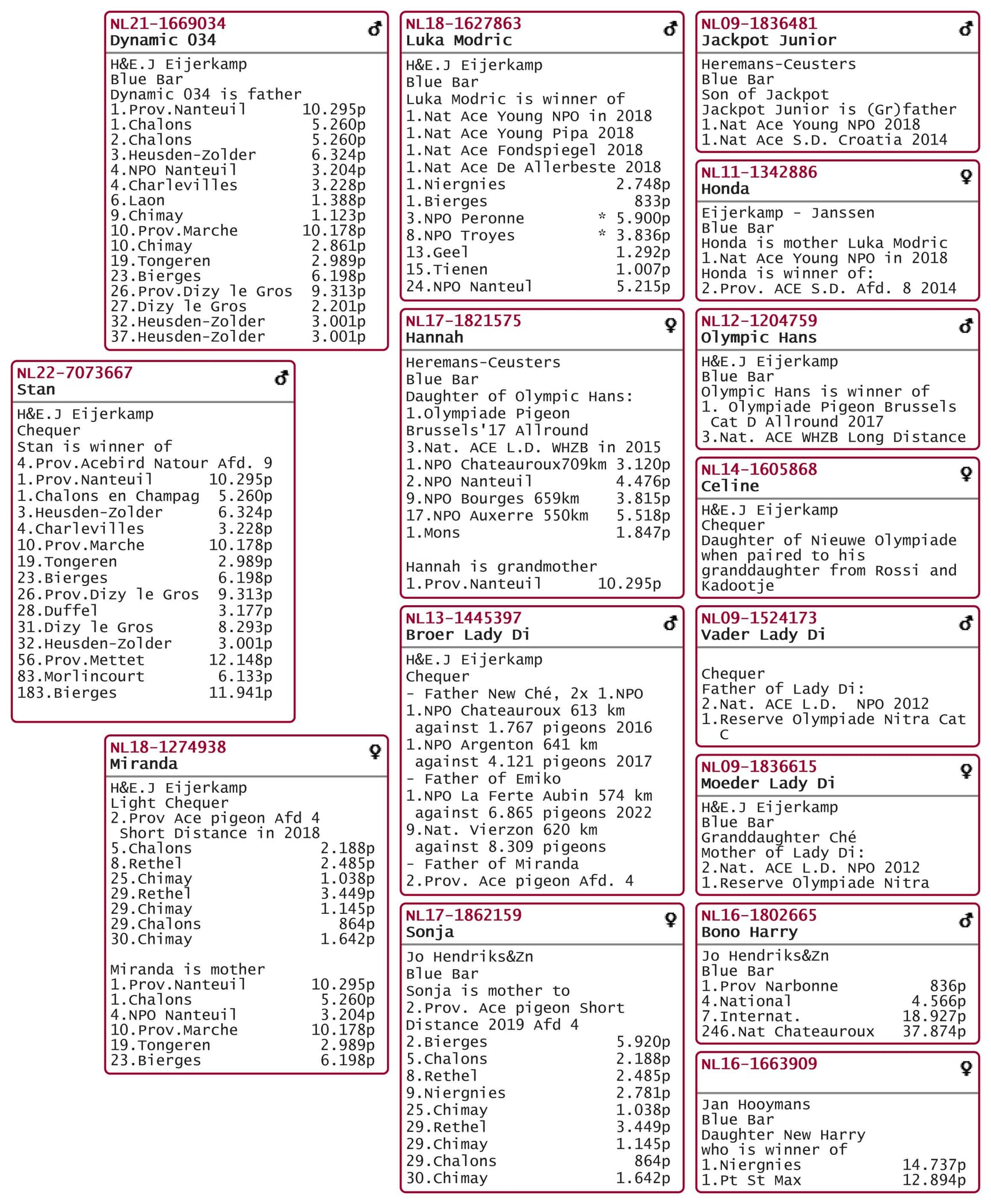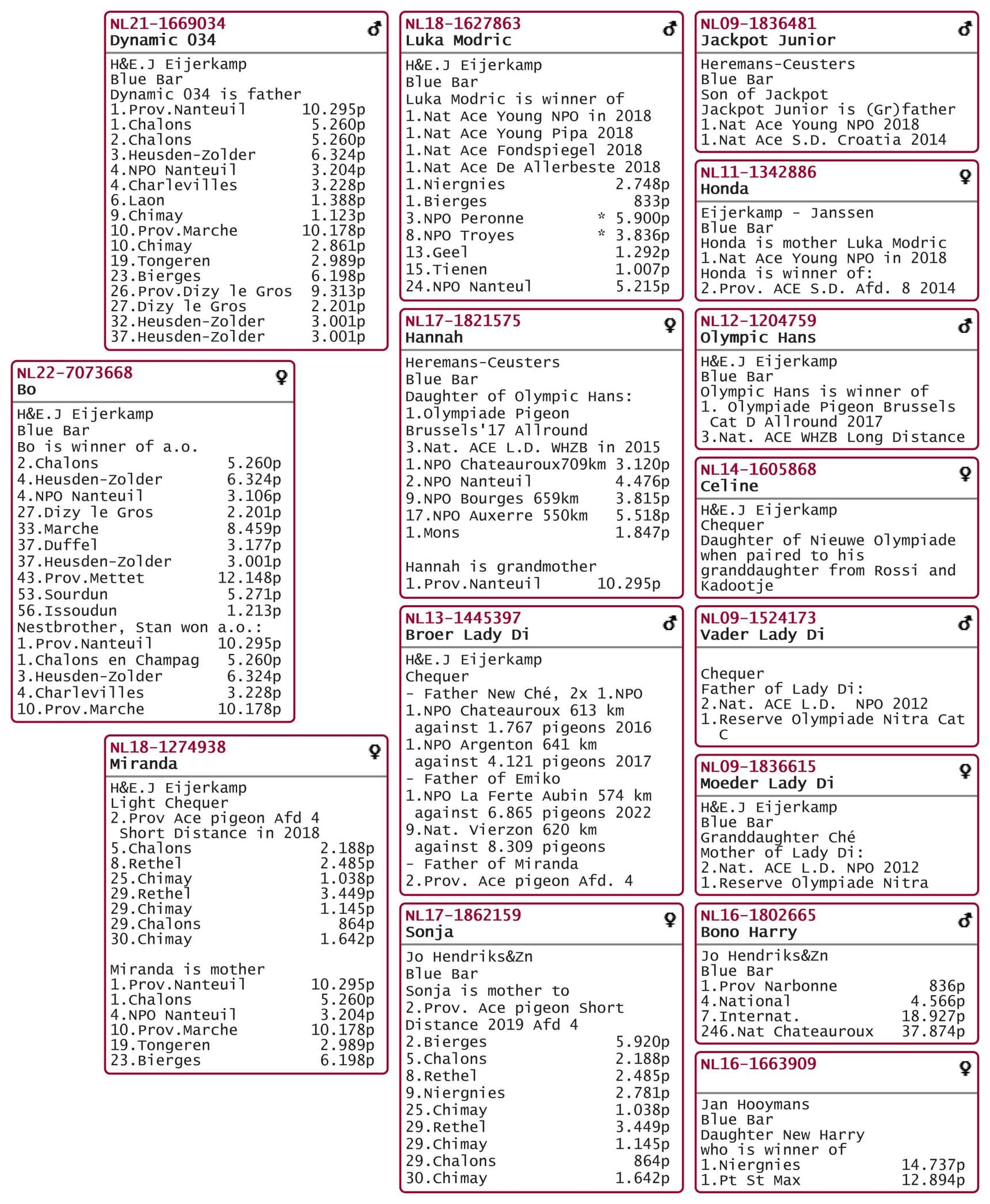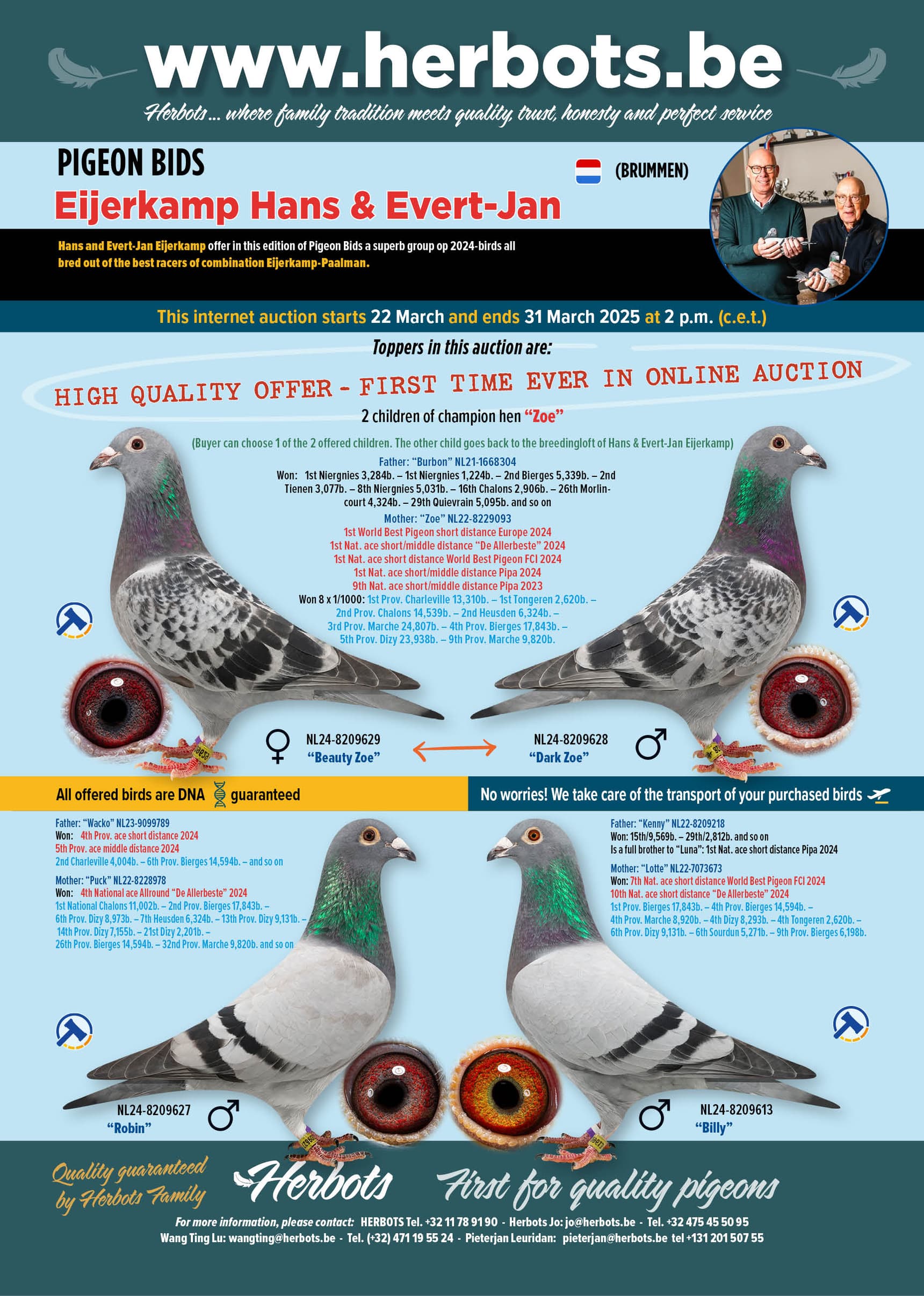 Hans et Evert-Jan Eijerkamp proposent à la vente par internet Pigeon Bids un magnifique groupe de 2024 pigeons, tous issus des meilleurs reproducteurs de la combinaison Eijerkamp-Paalman.