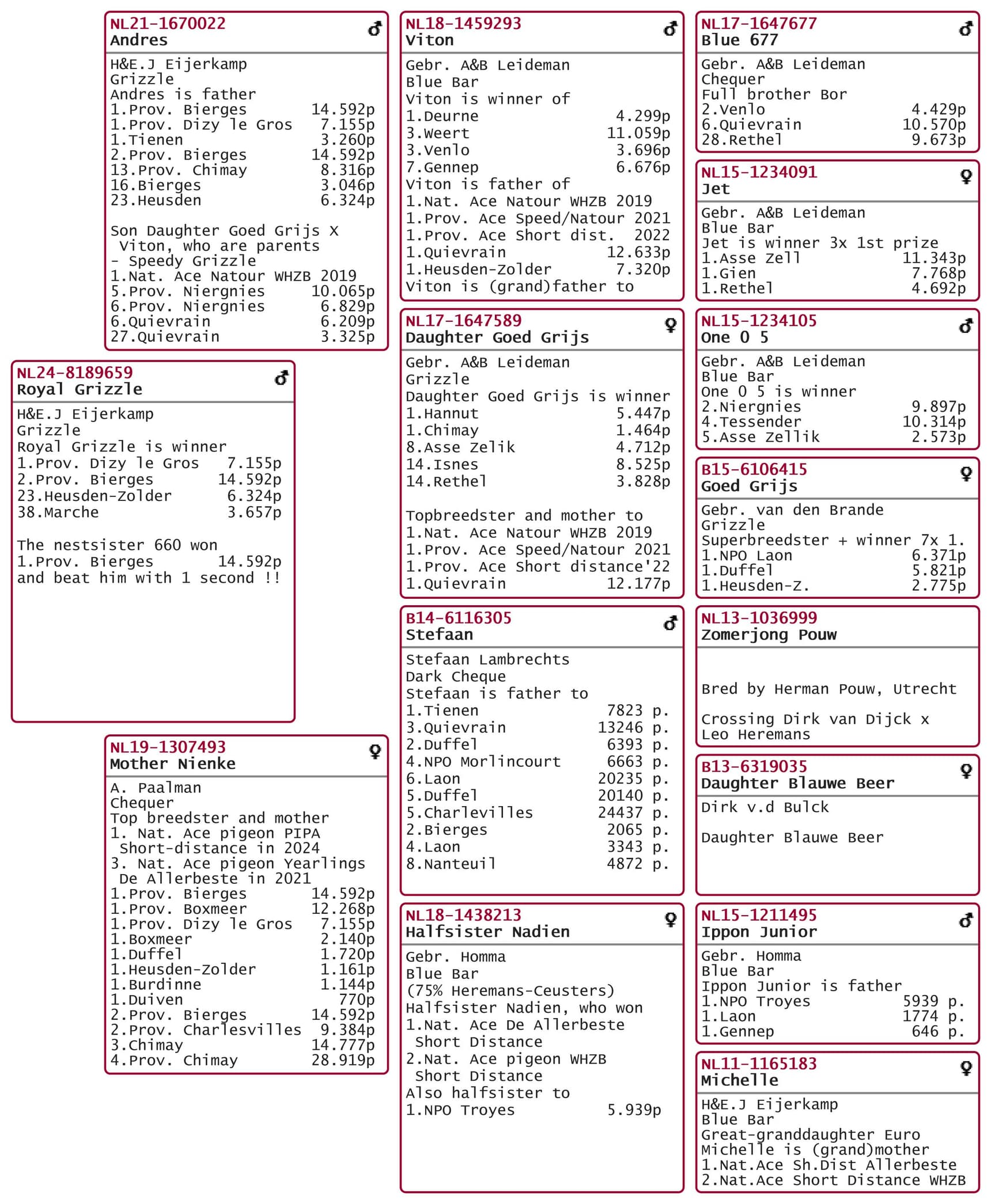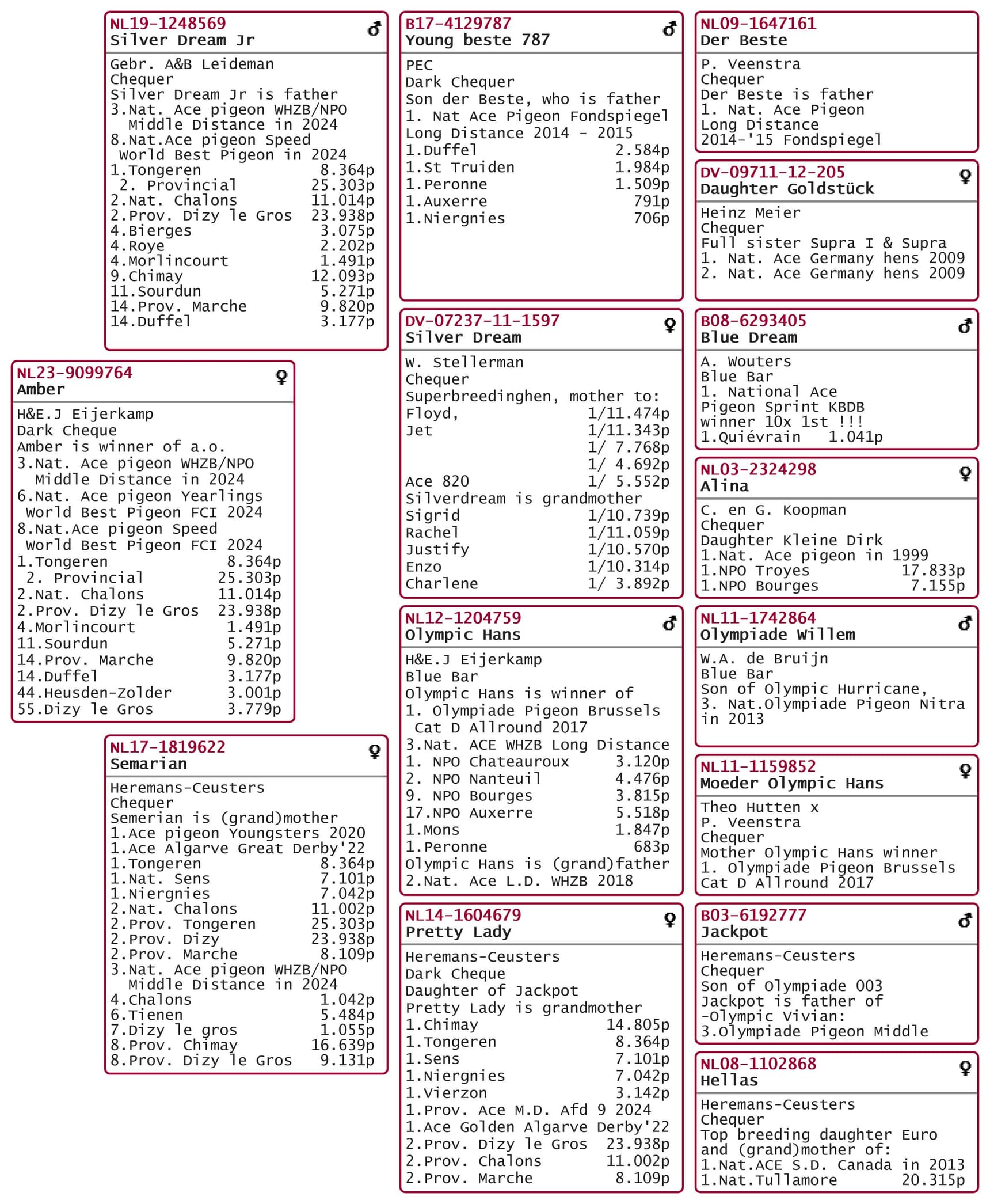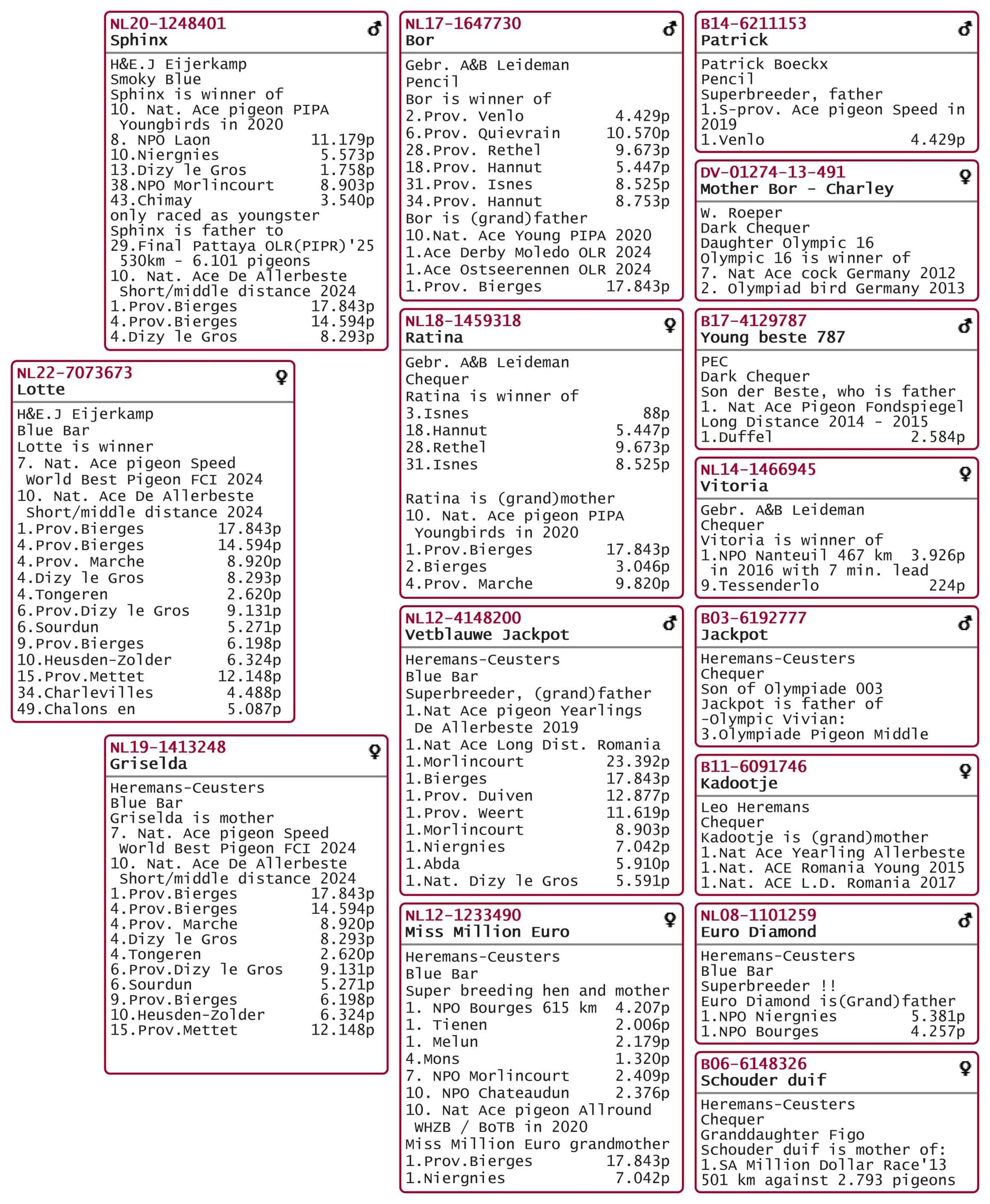 "Puck": 4e Nat. asduif Allround "De Allerbeste" 2024 – 1e Nat. Chalons 11.002d. – 2e Prov. Bierges 17.843d. - 6/8.973d. - 7/6.324d. – enz…
