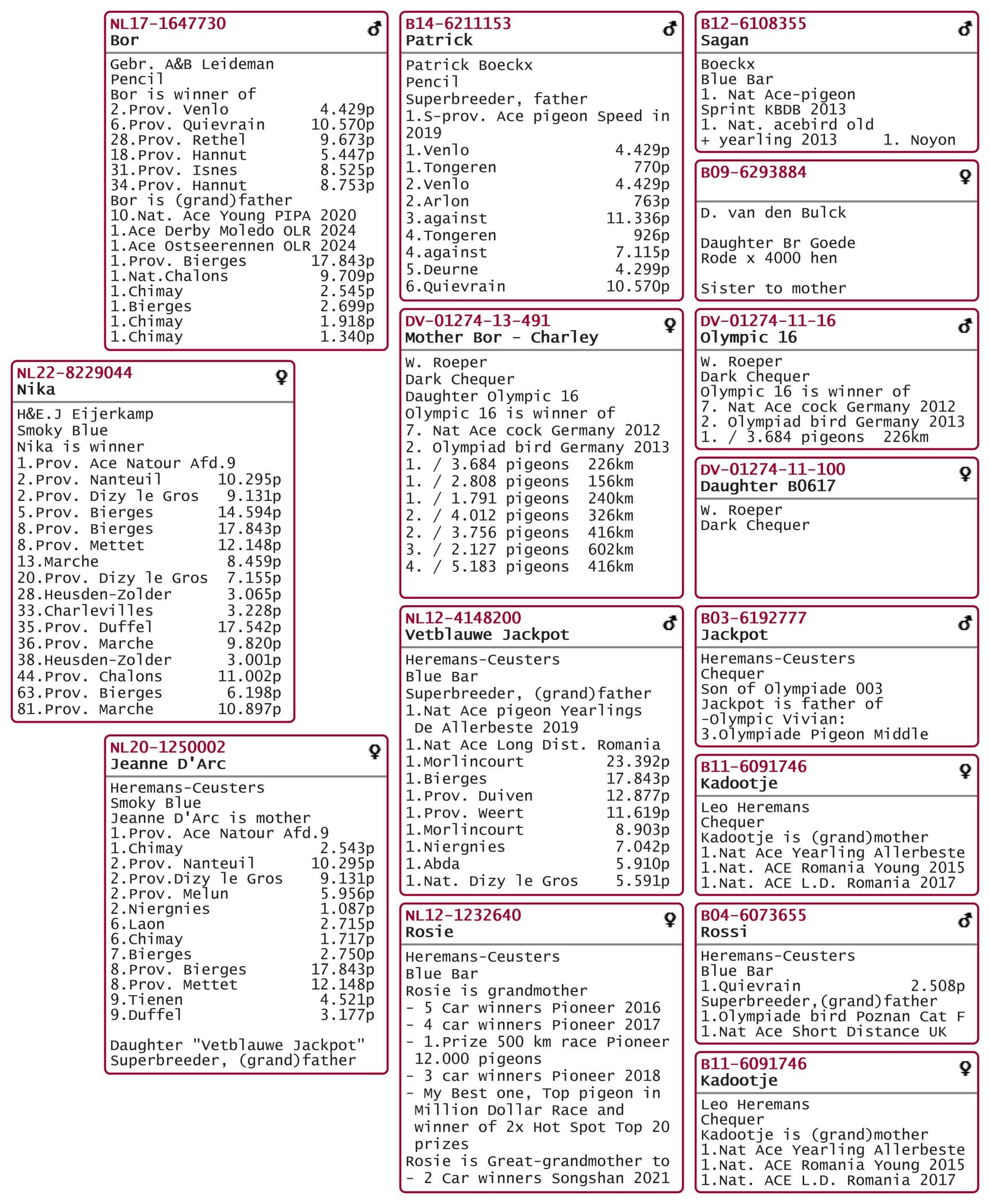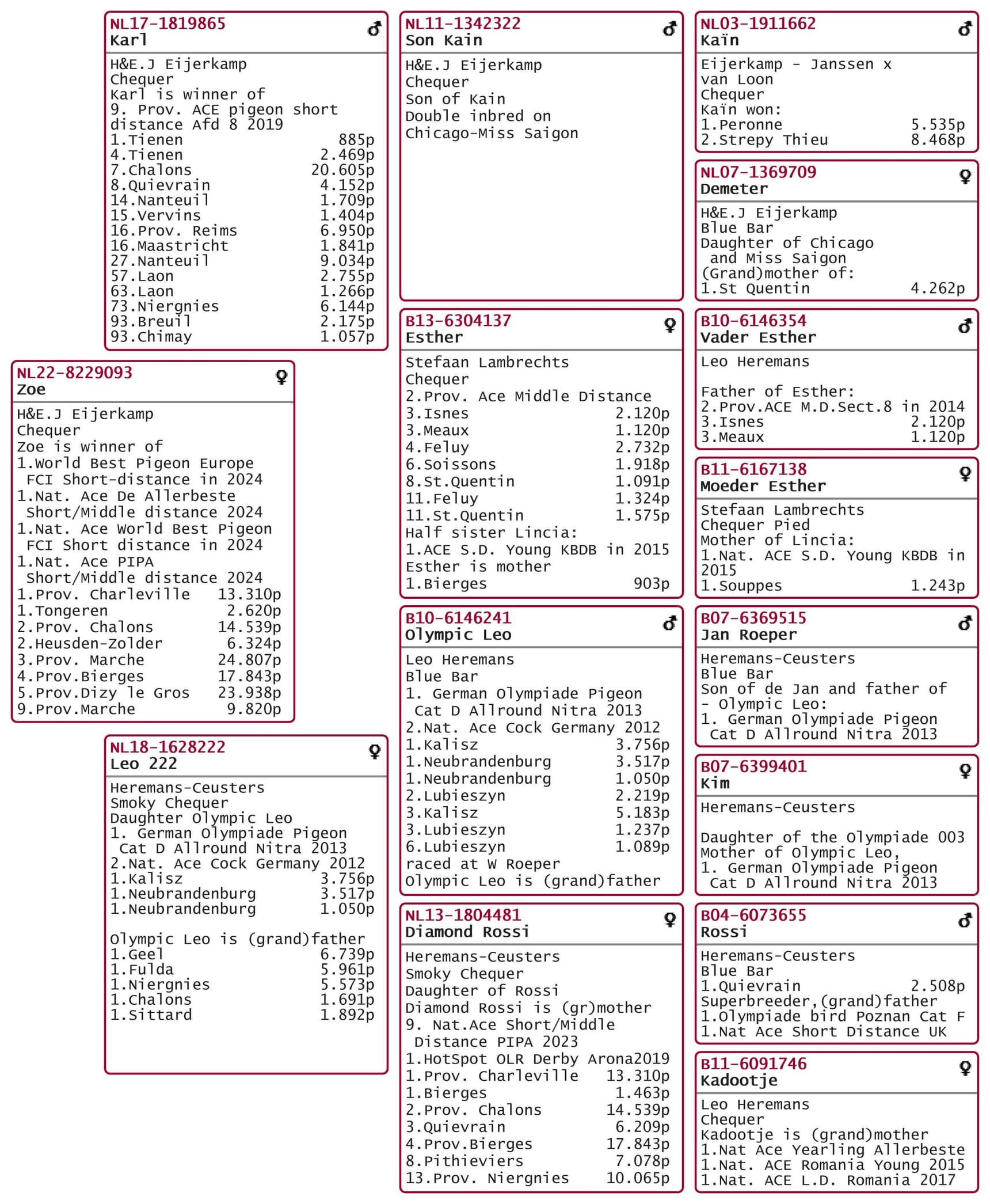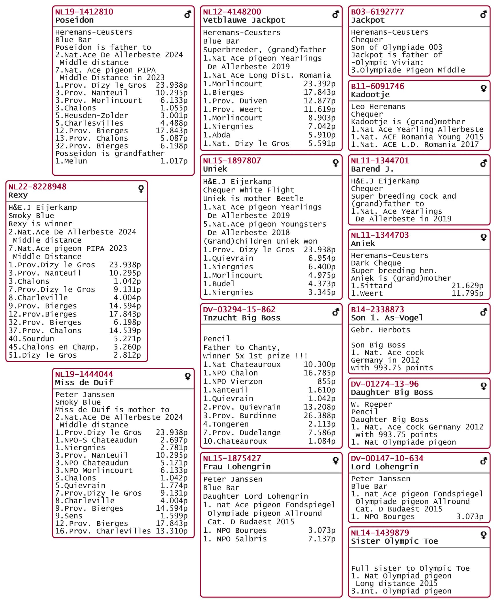 "Puck": 4e Nat. asduif Allround "De Allerbeste" 2024 – 1e Nat. Chalons 11.002d. – 2e Prov. Bierges 17.843d. - 6/8.973d. - 7/6.324d. – enz…