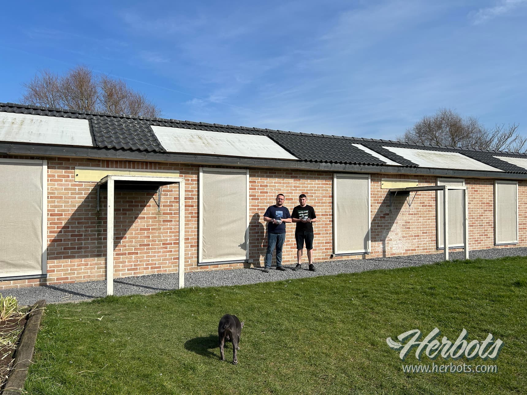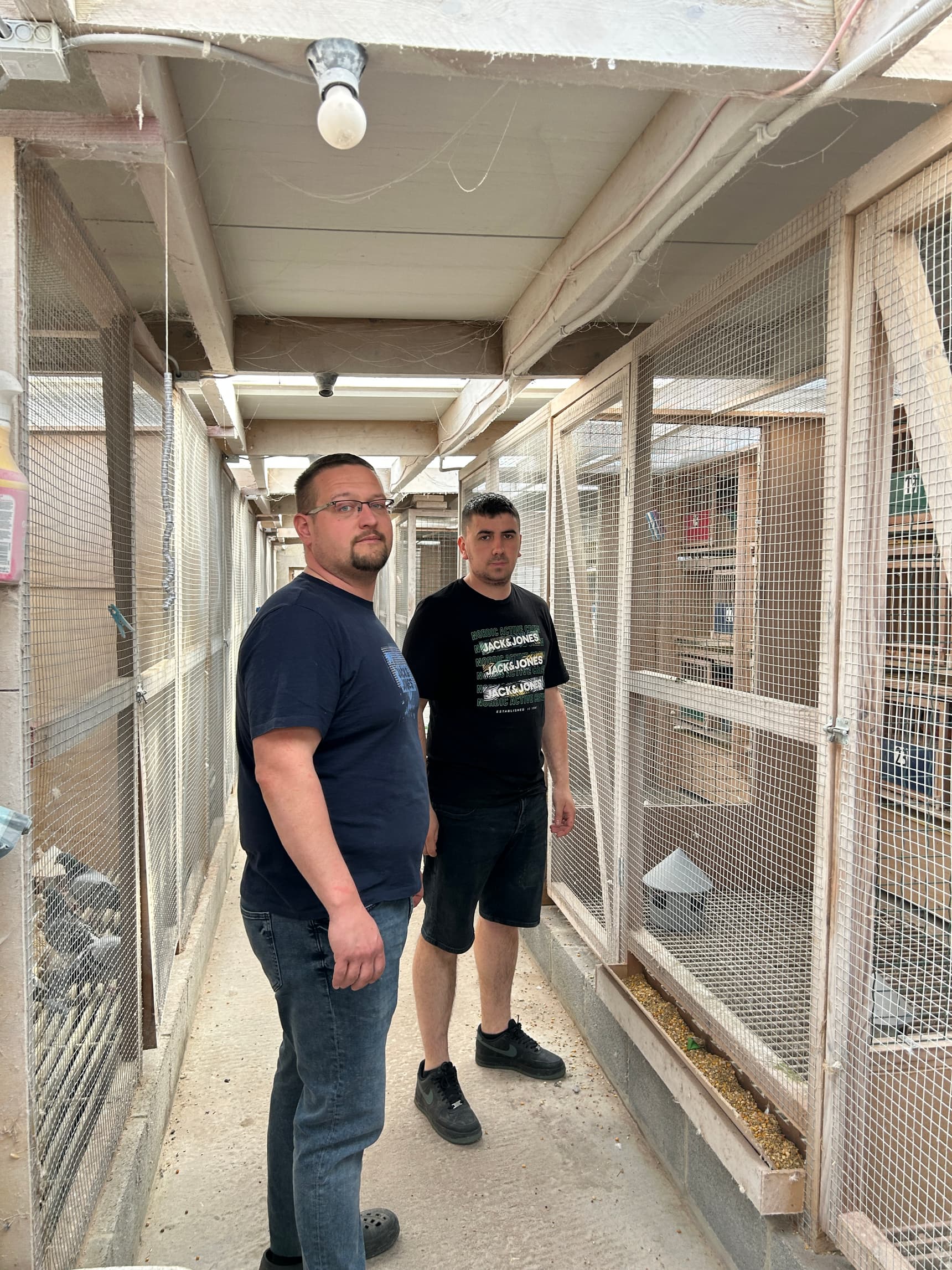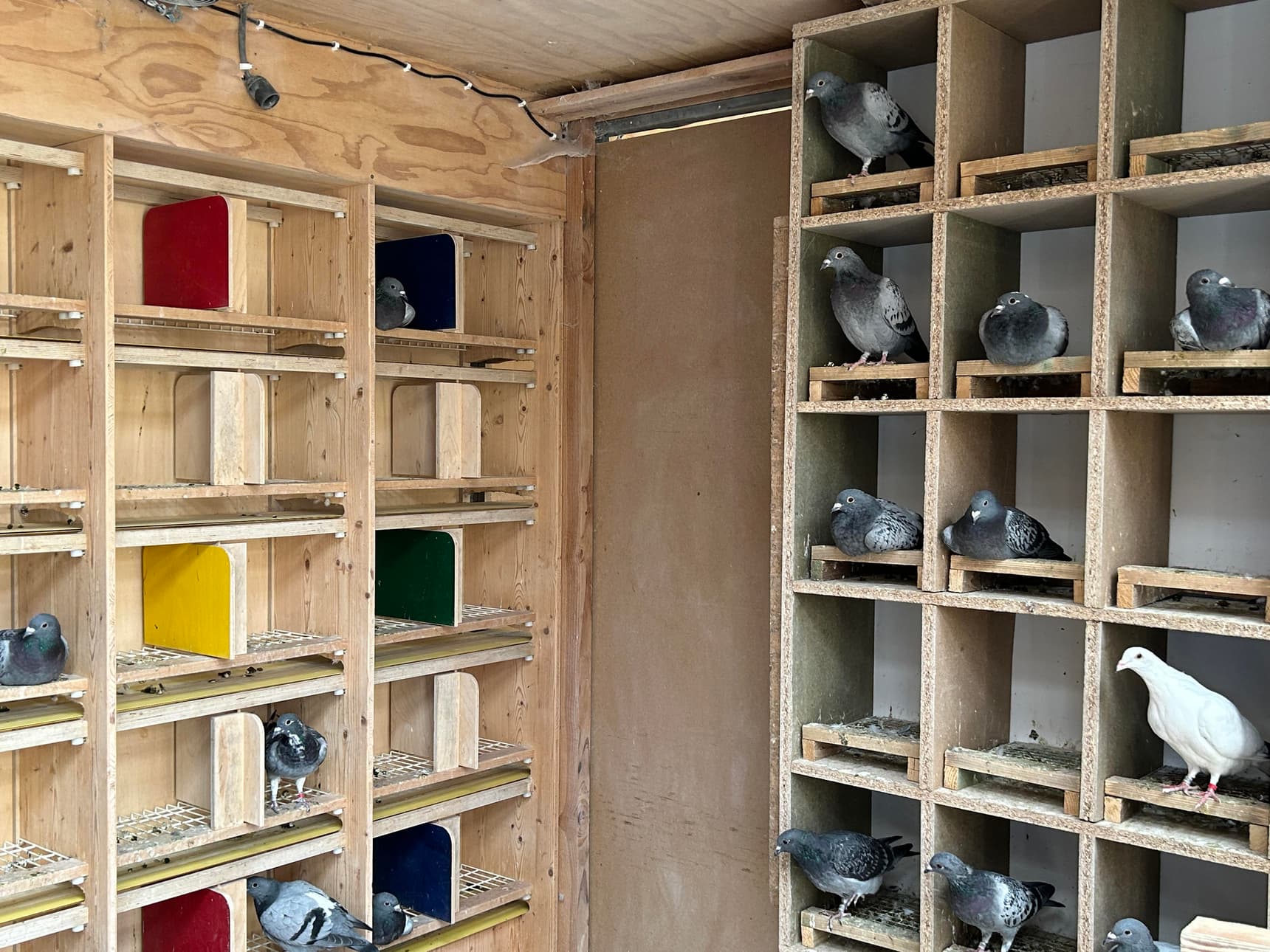 Kévin et Noah ont bâti, de leur propre main, le nouveau pigeonnier en briques (21m de long sur 9m de large) qui regroupe l’ensemble de leurs pigeons, les voyageurs se trouvant à l’avant et les reproducteurs à l’arrière. Tout a été bien pensé et conçu par Kévin pour le bien être des pigeons et le côté pratique. Ce long pigeonnier de jeu contient, 5 compartiments pour les veufs, 2 pour les veuves, et 2 pour les pigeonneaux, mais ne dispose que de 2 petites entrées, elles-mêmes divisées en 2 (partie de gauche pour les mâles et partie de droite pour les femelles). Ces 2 entrées donnent sur un couloir, avec porte coulissante permettant de séparer les compartiments (mâles/femelles) et de faire récupérer les pigeons rentrant des concours, avant de rejoindre leur casier, si besoin.