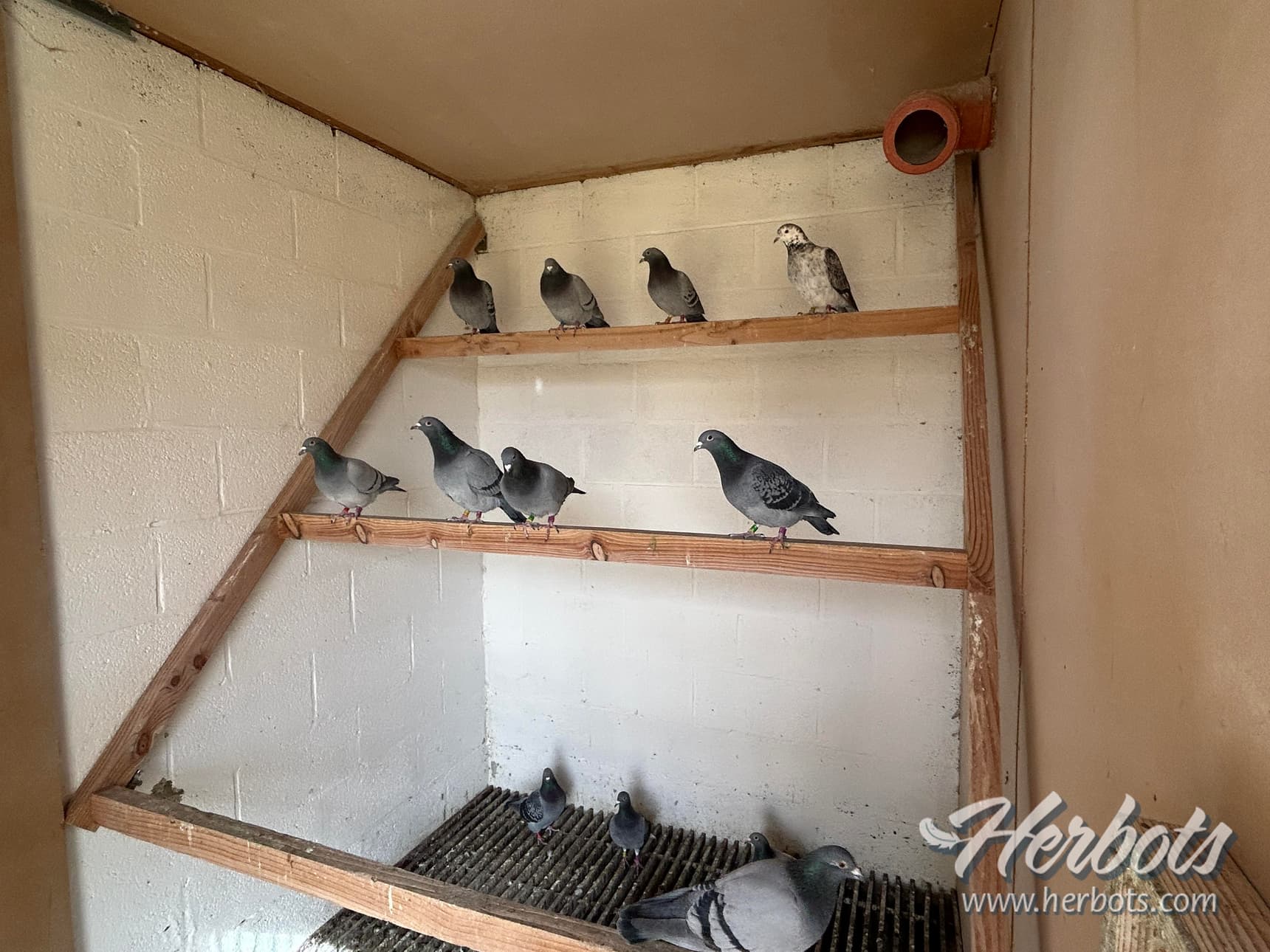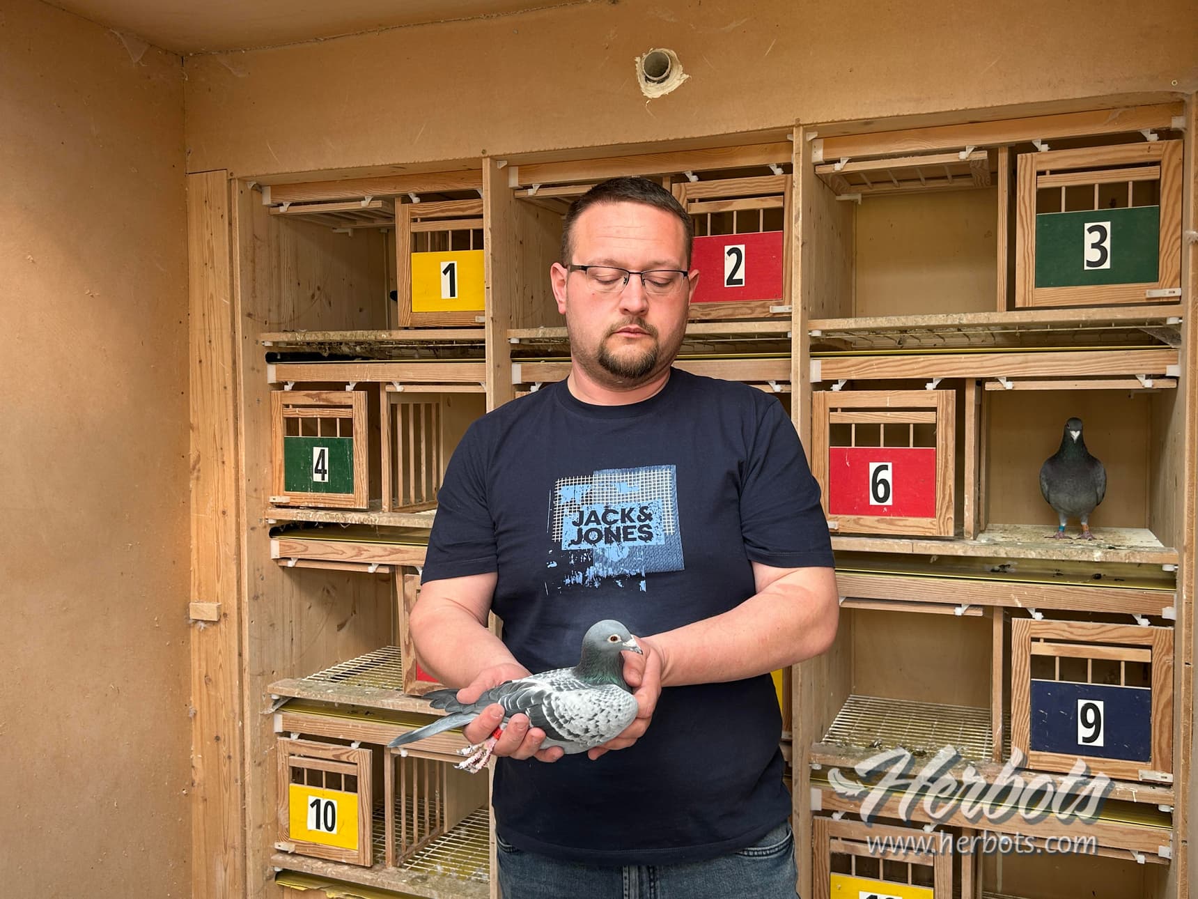 Au niveau alimentation, ce sont les mélanges et produits complémentaires ‘Columbi’ de son ami Frédéric Leclercq (Taintignies) qui sont utilisés. Aux mélanges de graines, Kevin ajoute 5% de ‘Top Granulé’ (produit riche en vitamines, minéraux et protéines, qui sert à améliorer la digestion, la flore intestinale et à évacuer les toxines). Le ‘Grit Mix’ est aussi distribué chaque jour aux pigeons ainsi que des graines énergétiques ‘Tovo’ (Beyers), ‘Top Form’ est ajouté à l’eau régulièrement. Le jour du retour des concours, et le lendemain les voyageurs reçoivent le mélange ‘Récupération et Fond Prestige’ avec ‘Top Biotike’ ainsi que ‘Top électrolytes’ et ‘Air Reboost’ dans l’eau de boisson. Les 2 jours suivants, ‘Top Clean’ est mélangé à l’eau pour nettoyer l’organisme ainsi que ‘Top Air’ et le mélange ‘Léger Prestige’ est donné. A partir du mercredi, on repasse au mélange ‘Récupération et Fond Prestige’ auquel est ajouté ‘Top Huiles’ avec ‘Top betteraves rouges en poudre’ sur les graines. Le jeudi, jour de la mise en panier, les voyageurs sont nourris à de nombreuses reprises pour bien gonfler leur batterie, avec ‘Récupération et Fond Prestige’ et à l’eau est ajouté soit ‘Top électrolytes’ si les températures sont élevées, ou ‘Top Air’ si ce n’est pas le cas. Les plateaux sont ensuite placés dans les casiers des mâles et les portes coulissantes ouvertes pour que les femelles rejoignent les mâles.