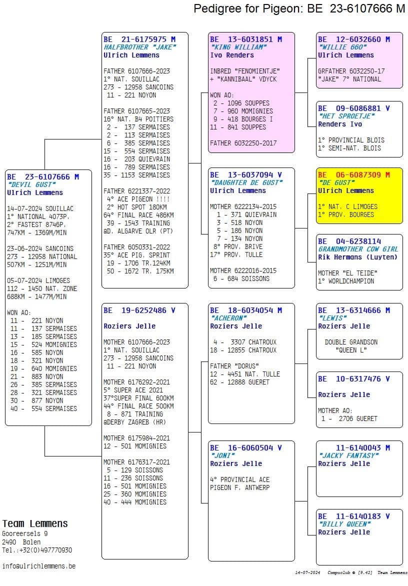 Les trois derniers numéros de la bague étant "666", son nom "Devil Gust" a été rapidement trouvé. "Devil Gust" est un jeune de l'été 2023 et durant son année de naissance, il n'a été basqueté que pour la "Ronde Van België". Sa seule expérience en tant que jeune mâle fut d'être lâché dans toutes les directions du vent.