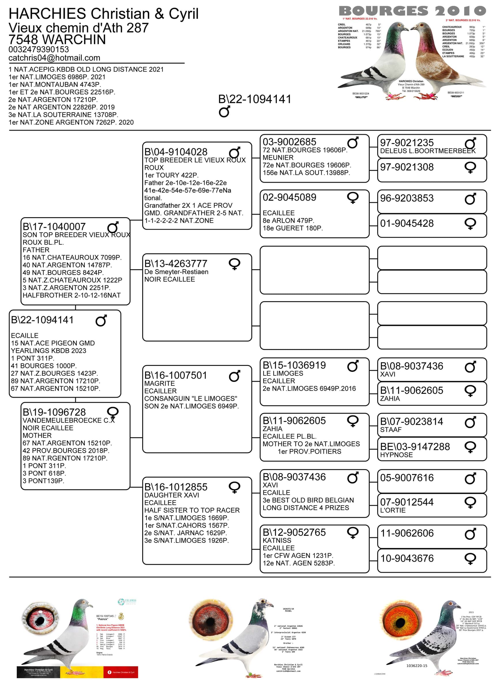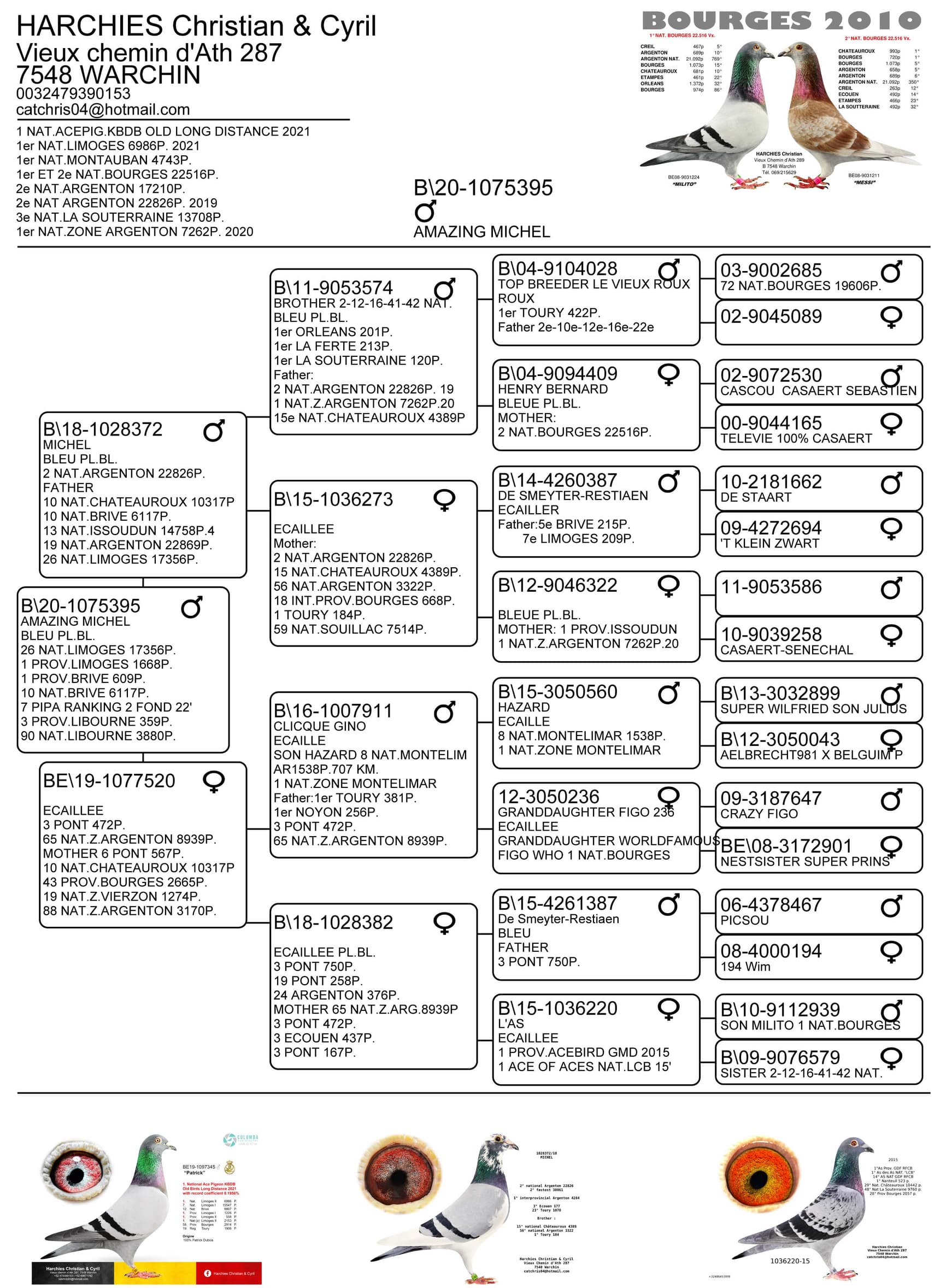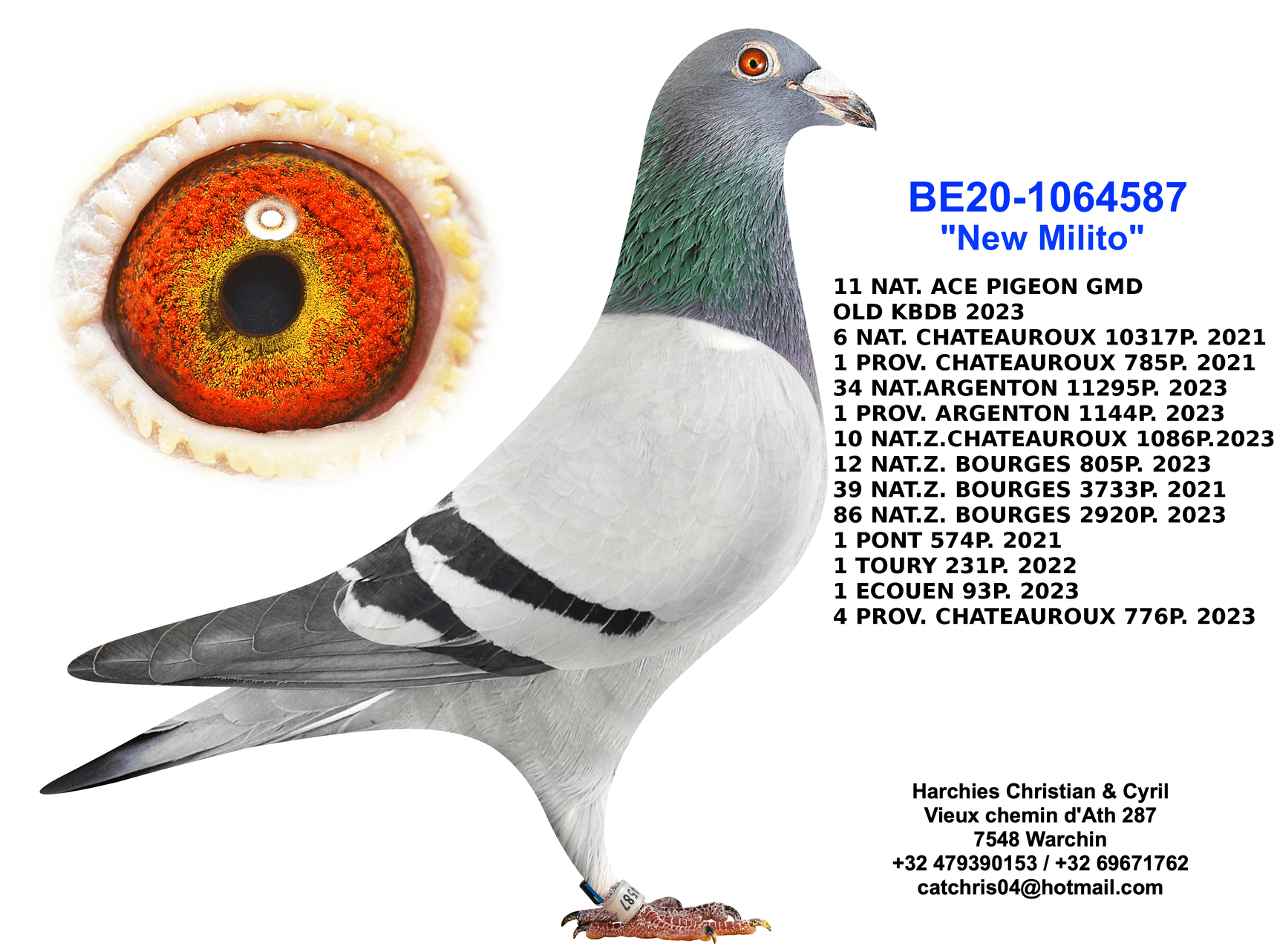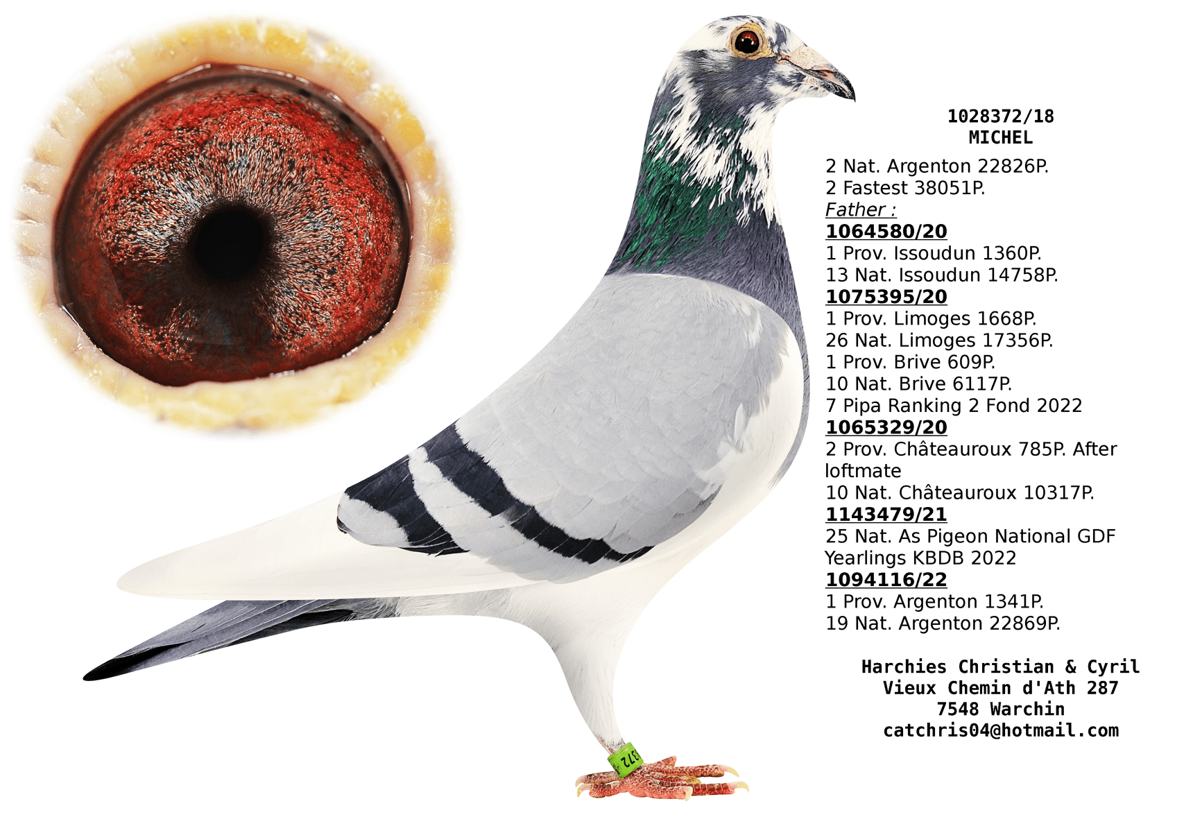 Avant la formation en 2021 du tandem composé de Christian et Cyril, le nom ‘HARCHIES’ était déjà bien connu en Belgique, car Christian, colombophilie depuis 1989, avait déjà réalisé le 1er national Montauban en 1996 ainsi que le 1er et 2ème National Vieux Bourges en 2010. De son côté, Cyril, passionné par le sport colombophile depuis la naissance, a pris sa 1ère licence en 2013, à l’âge de 10 ans et est passé tout près du 1er National en réalisant en 2019, le 2ème National Argenton dans 22.826 Yearlings, avec le pigeon BE18-1028372 (petit fils du ‘Vieux Roux’ de Christian), baptisé ‘MICHEL’, en souvenir du prénom de son grand-père aussi colombophile et décédé malheureusement en cette même année. MICHEL’ BE18-1028372 est devenu, par la suite, un des meilleurs reproducteurs de la colonie. Cyril est donc la 3ème génération de colombophilie dans la famille ‘Harchies’.