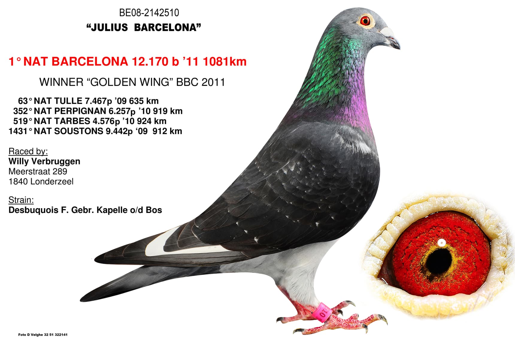 « Julius » (08-2142510) prouve que les pigeons Desbuquois ne sont pas seulement capables de remporter un 1er National Barcelone dans leur propre colombier. Ce mâle bien bâti, noir à chair blanche, au plumage très doux et à l'œil brillant, est un pur Desbuquois. Les frères offrirent un couple de vieux pigeons à leur ami Willy Verbruggen (Londerzeel), et c'est de ce couple que naquit le champion « Julius ». Après sa victoire, « Julius » rejoignit le colombier de Michel et Didier, et il constitue lui aussi une lignée unique au sein du colombier Desbuquois.