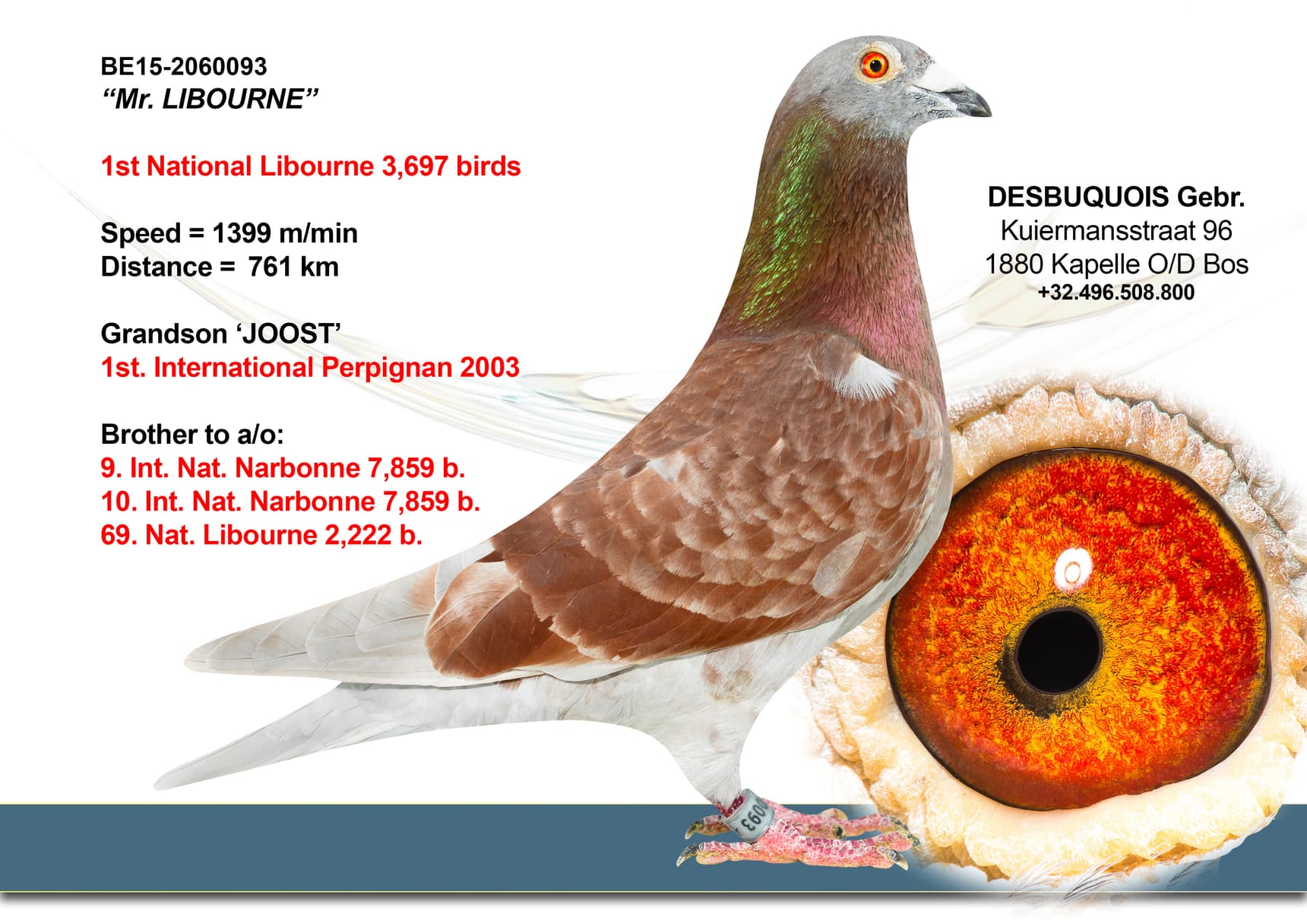 Vainqueur national de Libourne face à 3 699 yearlings. « Mister Libourne » est un véritable bijou : un pigeon très puissant, de taille moyenne à grande, bref, une force incroyable.