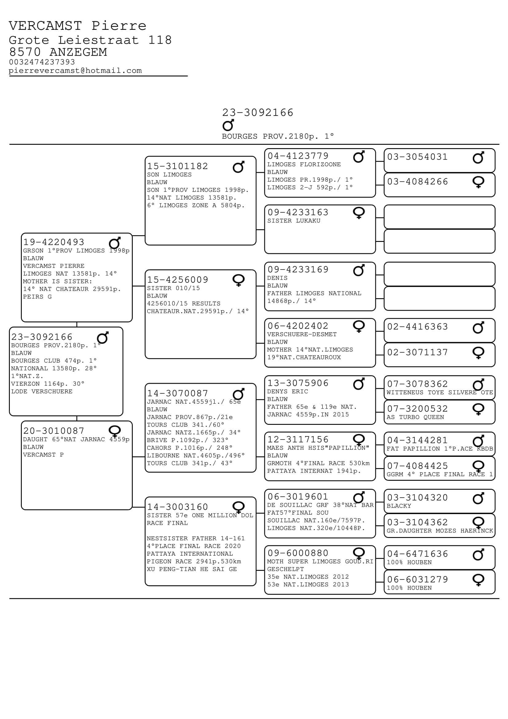 Le pigeon gagnant est le BE23-3092166, un petit mâle bleu issu de la troisième tournée de 2023. En tant qu’année, il avait déjà concouru à deux nationales, et cette saison, il est transféré au colombier des vieux pigeons. Après trois fois Clermont, Vierzon et Limoges, il signe sa grande performance : 1er Provincial Bourges II contre 2.180 vieux, 1er Nat.Z Bourges contre 1.730 vieux et 1er du club sur Bourges (474 b.). Il a également terminé 28ème national contre 13.580 vieux. Ce n'était pas non plus sa première performance de haut niveau, puisqu'il avait déjà obtenu une 30ème place à Vierzon contre 1.164 pigeons.
