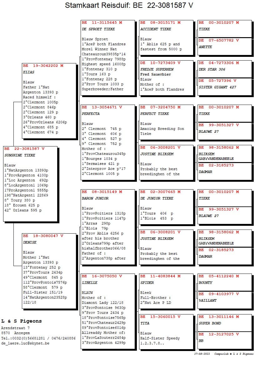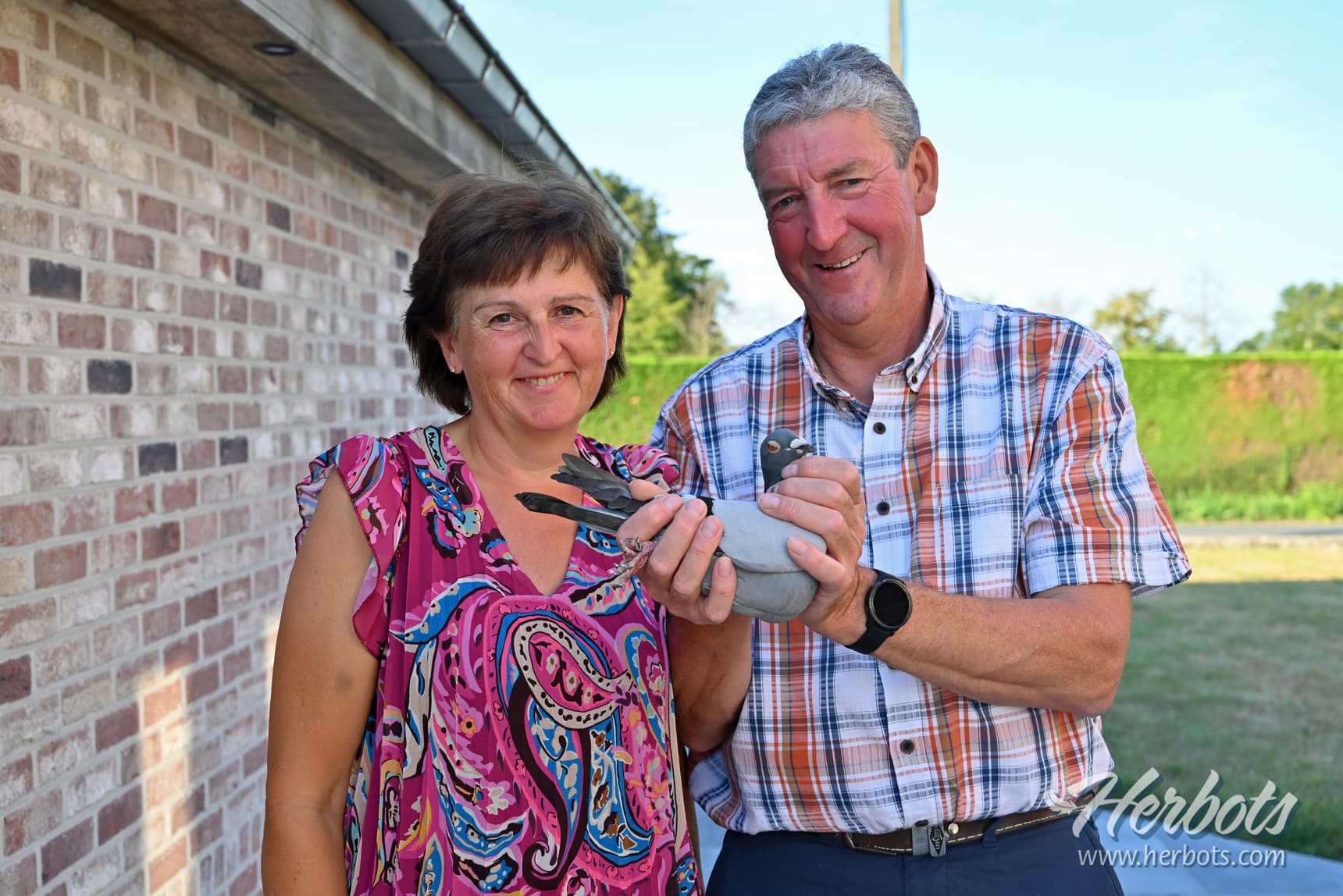On ne le dira jamais assez, la saison 2022 a été d'un niveau exceptionnel pour Luc et un bel hommage à son père Maurice. Un mot spécial pour remercier Sybille, l'épouse de Luc. Il y a quelques années, Luc a fait une lourde chute d'une échelle sur son lieu de travail. Il s'en est suivi de nombreuses fractures, une longue convalescence et une longue période de douleur. Luc est rarement indolore dans son corps et, depuis, Sybille l'aide beaucoup à s'occuper des pigeons. Apparemment, sa contribution se fait également sentir dans les résultats. Alors que dans le passé, ils étaient déjà au top, l'année dernière, ils peuvent être qualifiés de super. Le feeling de Sybille et de ce nouveau tandem a-t-il été la recette miracle de ce succès ? Seuls les pigeons qui ont participé peuvent le confirmer.