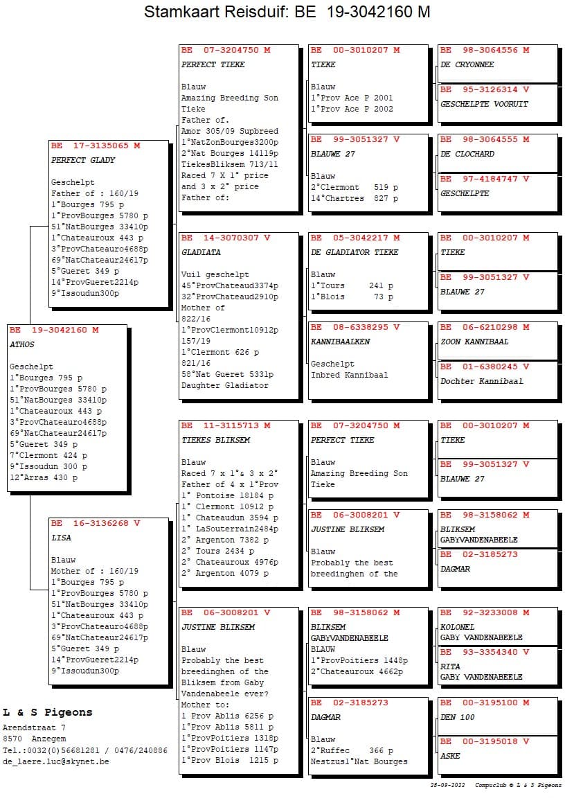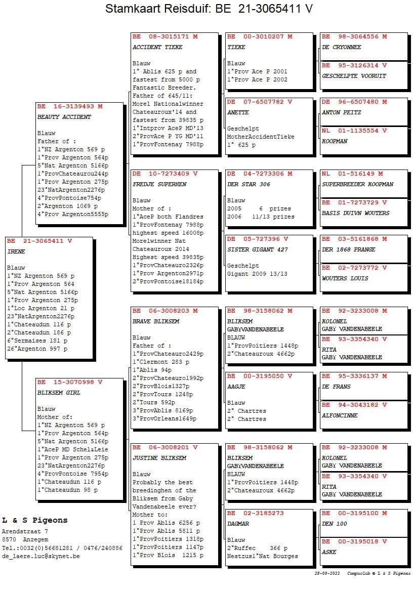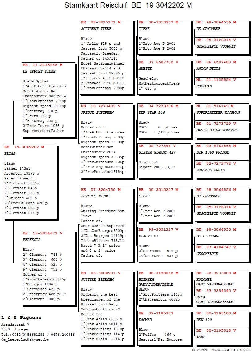 Il n'est donc pas surprenant que les descendants du "Tieke" jouent un rôle important dans la construction de la souche actuelle. Mais Maurice et Luc ont également cherché du matériel de croisement pour la dynastie "Tieke". La célèbre lignée "Bliksem" de Gaby Vandenabeele était à leurs yeux le choix le plus évident... un choix en or qui s'est avéré par la suite. Avec la "Justine Bliksem", une fille de la célèbre "Bliksem", nos éleveurs de Flandre occidentale ont apporté à Anzegem une mère reproductrice d'envergure. Ce que "Justine Bliksem" et un fils de "Tieke" ont produit est tout à fait phénoménal : 1er Provincial Ablis 6.256 pigeons. - 1er Provincial Ablis 5.811 pigeons. - 1er Provincial Poitiers 1 318 pigeons - 1er Provincial Poitiers 1 147 pigeons. - 1er Provincial Blois 1.215 pigeons - 1er Provincial Orléans 1.974 pigeons - 1er Provincial Bourges 1.003 pigeons - 1er Provincial Ablis 4.680 pigeons.
