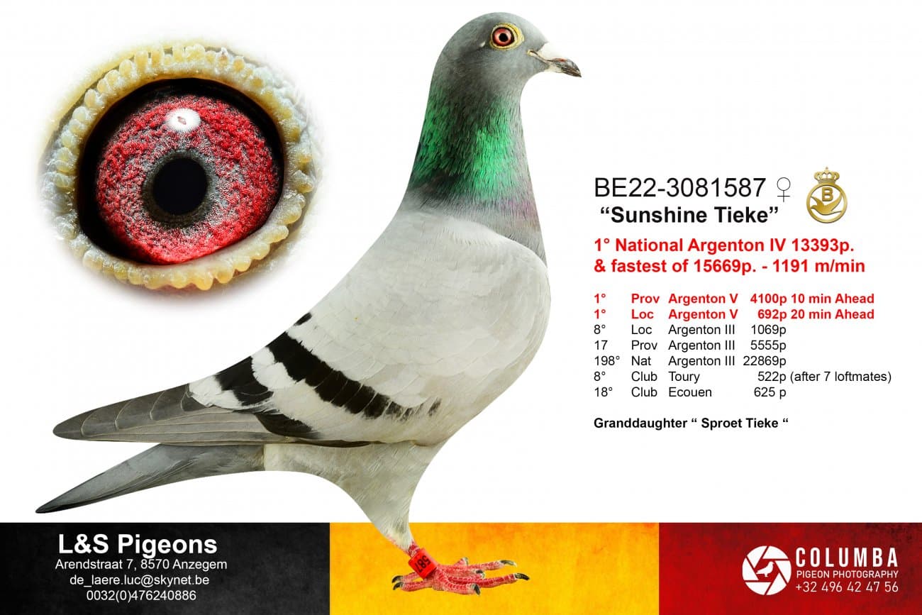 Le père et le fils De Laere ont découvert un excellent couple reproducteur en 1998 : le "Jonge Bonten" x "Blauw Renterghem". Ce couple est devenu entre autres les parents de "Crayonnee" (a gagné le 1er Blois avec 10 min d'avance) et de "Tieke", un grand coureur... et si possible encore meilleur éleveur ! Un super pigeon qui a réussi à être couronné "As pigeon provincial demi-fond KBDB Flandre occidentale" pas moins de 2 années de suite ! C'est ce même "Tieke" qui a aussi largement contribué à être couronné 1er Champion National Demi-Fond KBDB 2002 !