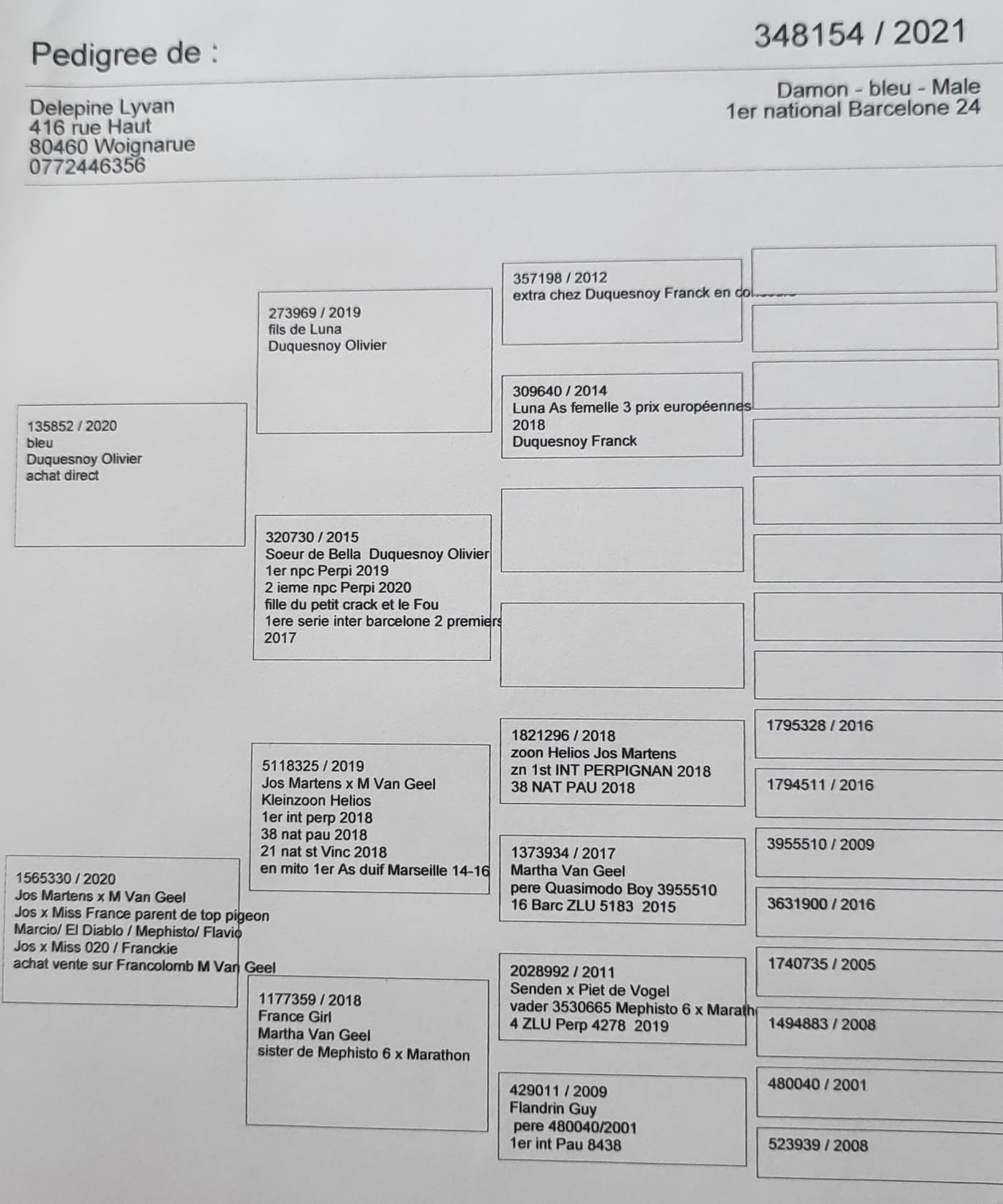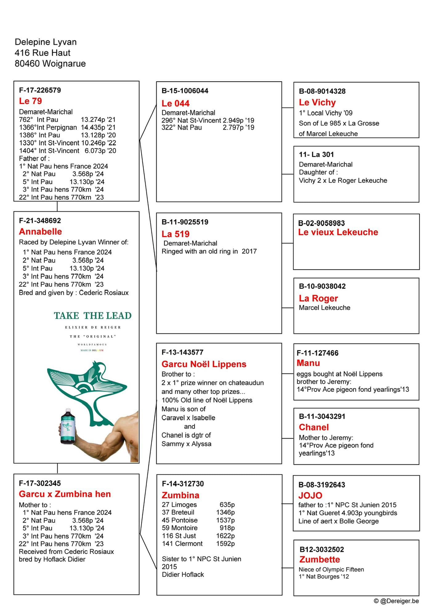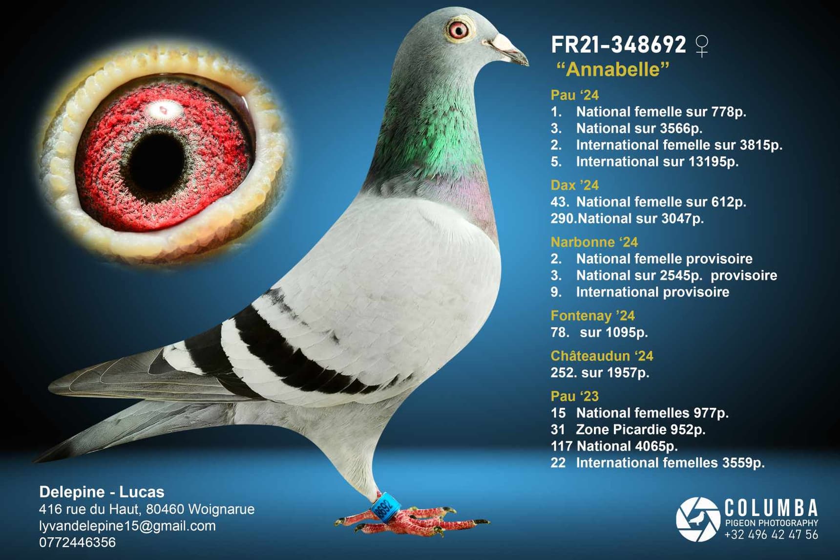 C’est ici que nous rencontrons, une des colonies françaises les plus en vue des deux dernières saisons : Lyvan Delepine. Après son 2e national Barcelone de 2023, il rempile en début de saison 2023 avec un 1er + 2e National femelle Pau 2024 et deux semaines plus tard il remporte le graal avec le 1er national de Barcelone 2024 ! L’histoire ne s’arrête pas là, puisque le 29/07/24 sa femelle victorieuse de Pau, se classe 3e National de Narbonne. Ainsi cette extra voyageuse avec 5e international Pau et 9e International Narbonne a de fortes chances de se classer 1er international As Pigeon 2024.