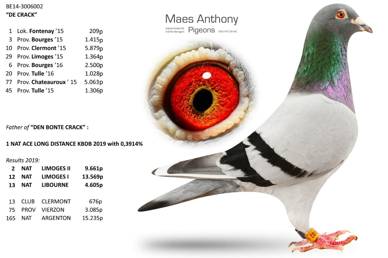When we have a look at the pedigree of the “Den Bonten Crack” we see that his father “De Crack” (3006002/14) was a top racer himself with amongst other a 1st Provincial Bourges and in the meantime one of the current base breeders of the Maes colony. We also find him as grandfather to base breeder r “Den Bonten Provinciaal” . Aside that we see the old strains from Jacques Catteeuw, Charles Matthijs and André Debeouf. Mother to the “Den Bonten Crack” has as name “Bontje Staf” (3073396/11) and is a full sister to the father of “Serosero”. This pigeon is directly from Chris Debacker and goes mainly back to the old strain of Gaby Vandenabeele with amongst other descendants from “Bieke” via Rik Cools.