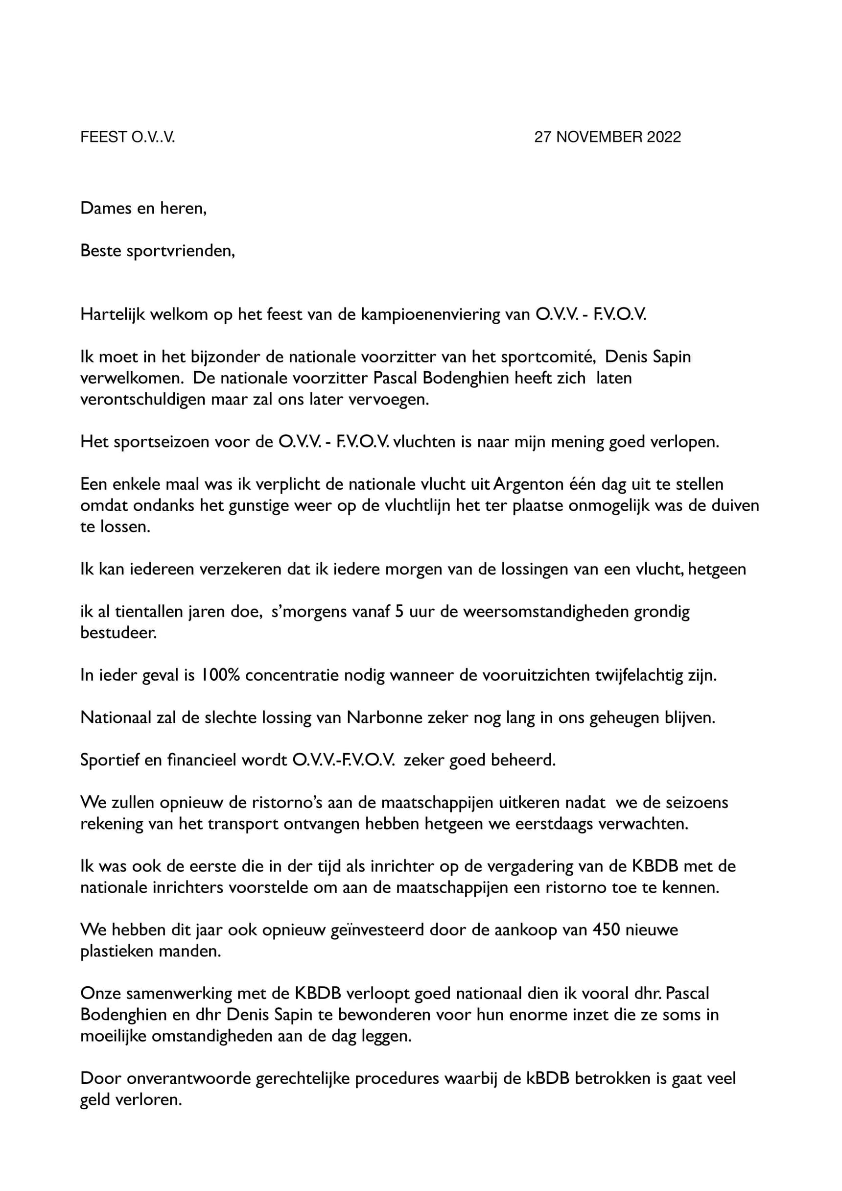 Maar bovenal eerde en respecteerde hij iedereen die organiseert, helpt, dirigeert van de kleinste uitvoerende taak tot de meest finale beslissing om de duivensport verder levendig te houden en een zekere toekomst te behouden.
