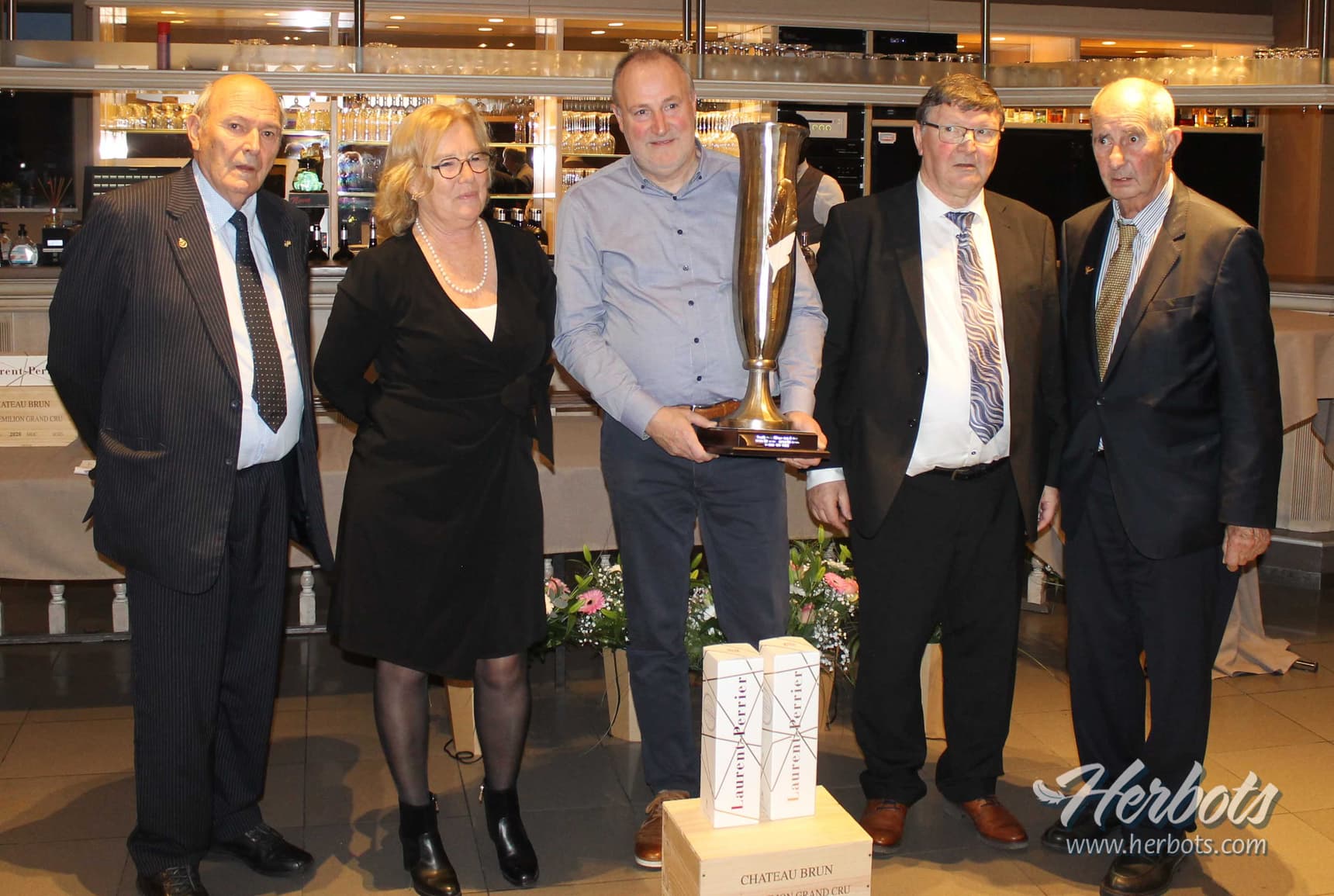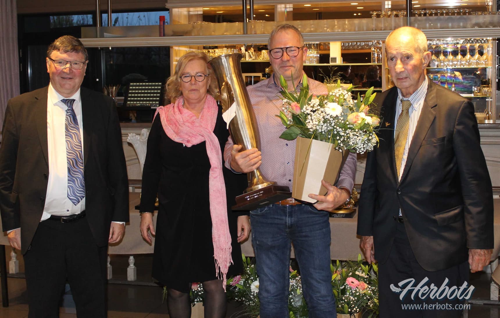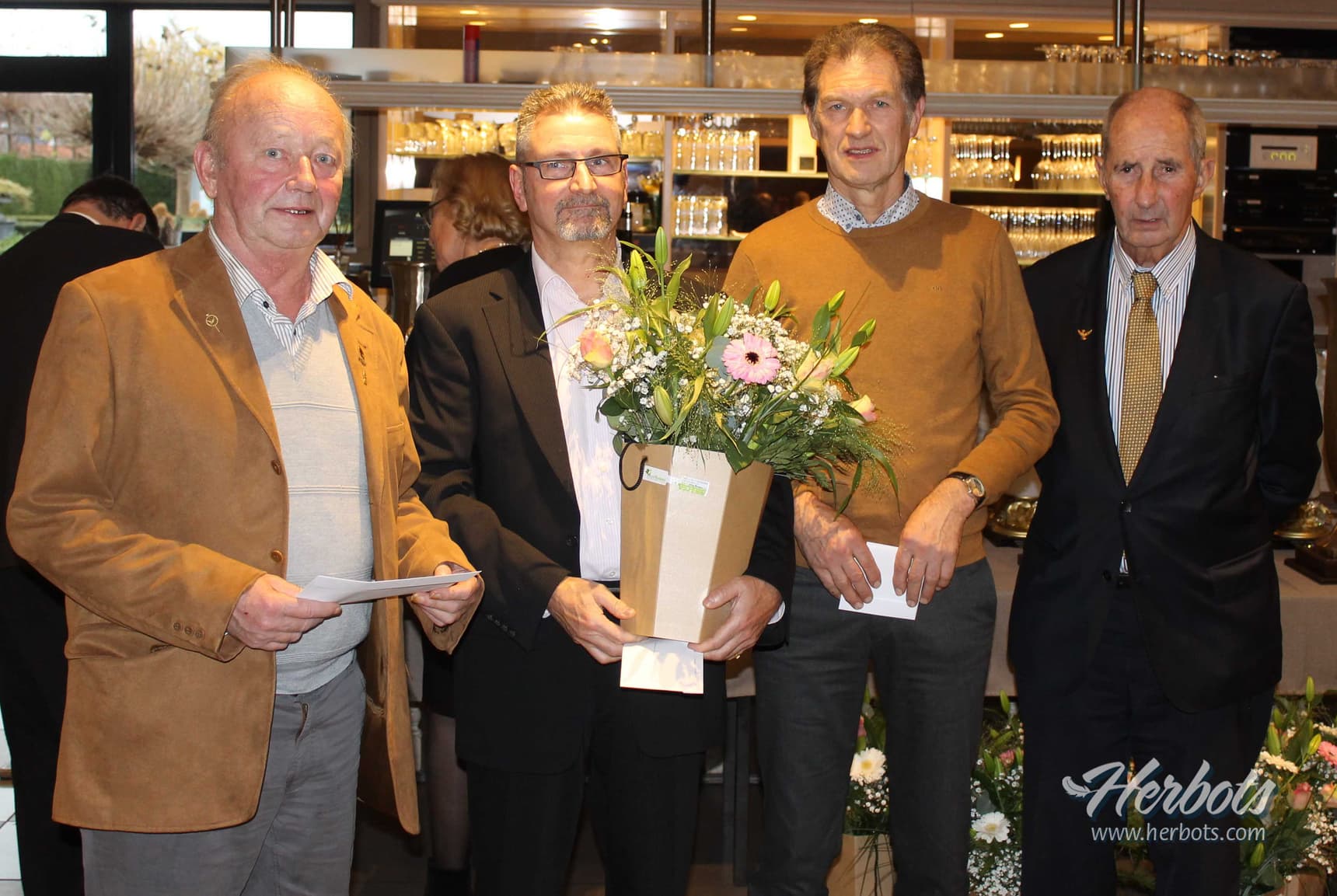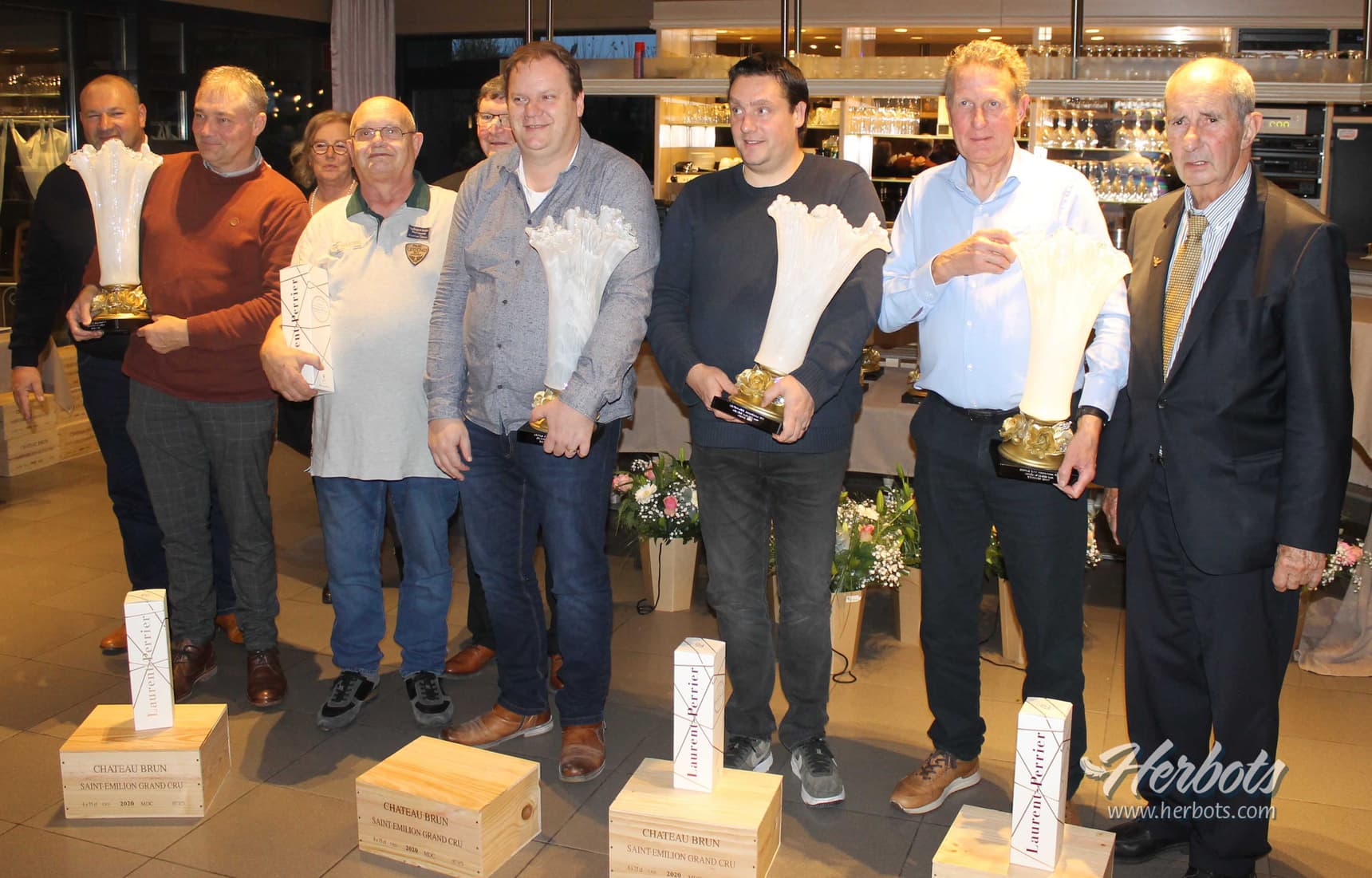 Voorzitter Daniël Aerens geflankeerd door zijn bestuursploeg (Mark De Backer, Geert De Clercq, Herman Roels) en zijn partner Hélène hadden voor een prachtig prijzenpakket gezorgd voor de winnaars en laureaten.