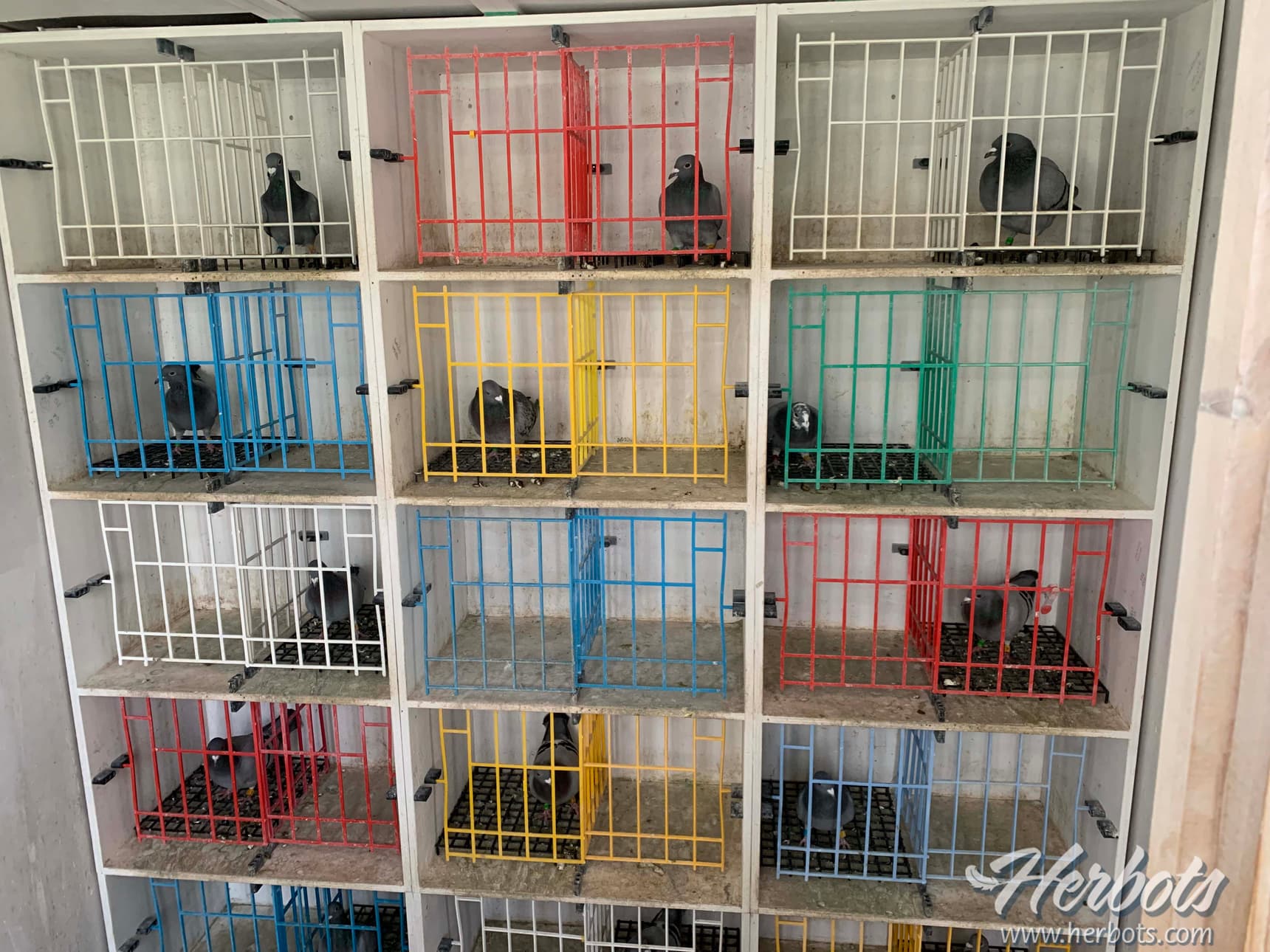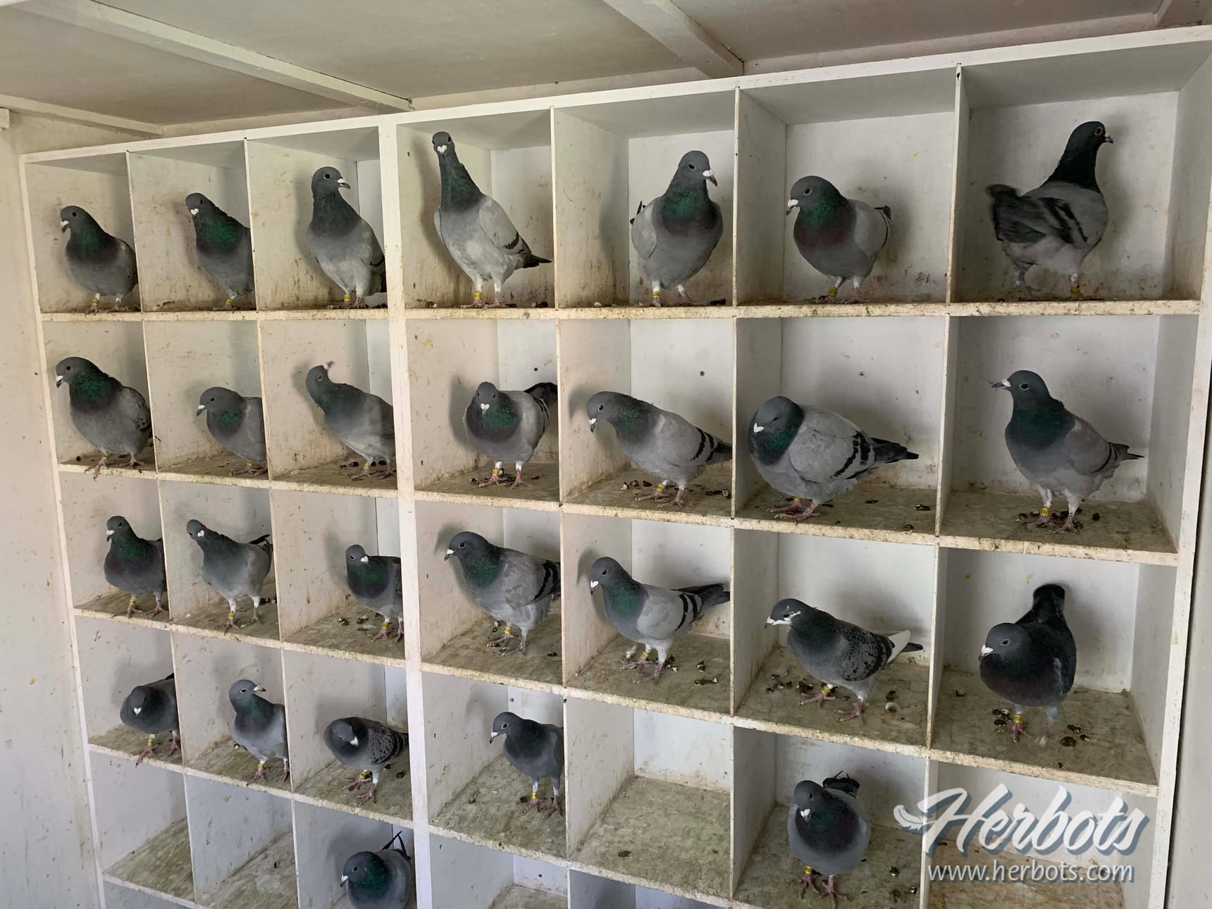 La colonie compte une vingtaine de couples de reproducteurs qui ont été accouplés le 18 décembre cette année et qui ont pu bénéficier d’éclairage artificiel pour stimuler l’élevage. Les voyageurs élèvent également une fois leurs propres jeunes qui seront joués. Olivier et Justin nous cache pas que ces accouplements des voyageurs résulte bien souvent dans de très belles surprises ! En ce qui concerne les équipes de jeu, Olivier et Justin peuvent compter sur une solide équipe de 50 femelles qui est répartie comme suite ; environ 30 femelles d’un an et le reste de vieilles, plus expérimentées. Ces dernières pourront rester dans l’équipe jusqu’à l’âge de 3ans avant qu’elles puissent profiter d’un repos bien mérité. A cet âge là, certaines intégreront l’équipe de reproduction ou deviendront à leur tour, partenaire pour les voyageurs. Les femelles possèdent toutes leur poste où elles passent la journée au calme et sont occultées jusqu’au 10 mai. A partir de fin juin/ début juillet les journées seront à nouveau allongées artificiellement.  Tous les partenaires restent à la maison et ne sont pas joués. Ceci nécessite un travail supplémentaire mais la répartition des compartiments est bien pensée afin d’être plus efficace et rapide. Le compartiment de mâles se situe entre les différentes équipes des femelles. Il suffit donc simplement d’ouvrir les portes coulissantes afin que les partenaires puissent rejoindre les femelles. Le travail est également bien réparti entre les deux hommes et c’est un travail acharné qui est mené tous les jours, dès le matin, dans le noir, même à la frontale en tout début de saison avant de partir au travail. Cette petite anecdote nous prouve néanmoins que rien n’est laissé au hasard et qu’ils travaillent dur pour y arriver. Il en va de même pour les veufs (équipe de 30 mâles dont 10 vieux), qui ont également leur partenaire qui ne voyage pas. Il est important d’avoir le partenaire présent à la rentrée du concours et des entraînements selon le binôme. Les partenaires ne sont jamais montrés avant un concours ou entraînement mais le seront toujours présent lors des retours de concours et des entraînements !  Avant la saison les femelles et veufs commencent à voler à domicile vers début mars. Et, sans surprises, comme chez la plupart des amateurs, ici aussi on n’a pas échappé aux attaques des rapaces qui a déjà fait 6 victimes depuis le début de saison. En début de saison ils volent au drapeau et lors ce qu’ils volent une heure, les premiers entraînements peuvent commencer. Les pigeons seront entraînés 4 à 5 fois jusqu’à Vervins pour ensuite débuter la saison. Quant aux jeunes, une équipe de 120 jeunes (2 tournées) est constituée tous les ans afin d’assurer les renforts pour l’avenir. Les jeunes sont également occultés et les sexes sont séparés environ 3 semaines avant le premier concours national pour les jouer à la porte coulissante. Le premier tour est joué « à fond » et le deuxième tour sera un peu plus préservé. Ils seront entraînés une quinzaine de fois avant de partir au premier concours.
