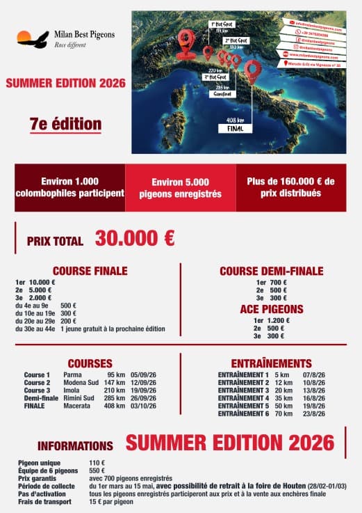 Les frais d’inscription pour 1 pigeon s’élèvent à 110 €, auxquels s’ajoutent 15 € pour l’expédition vers l’Italie.