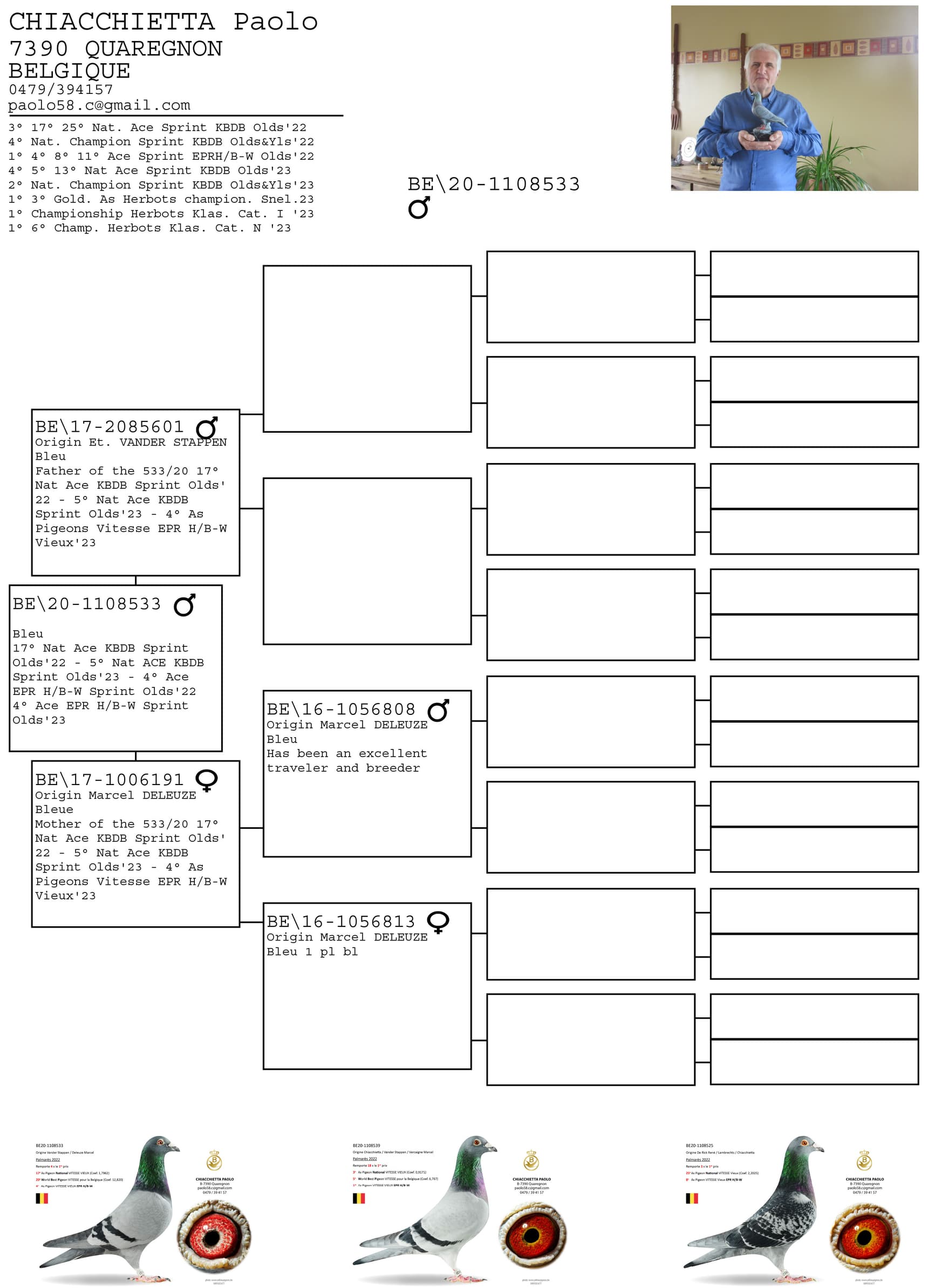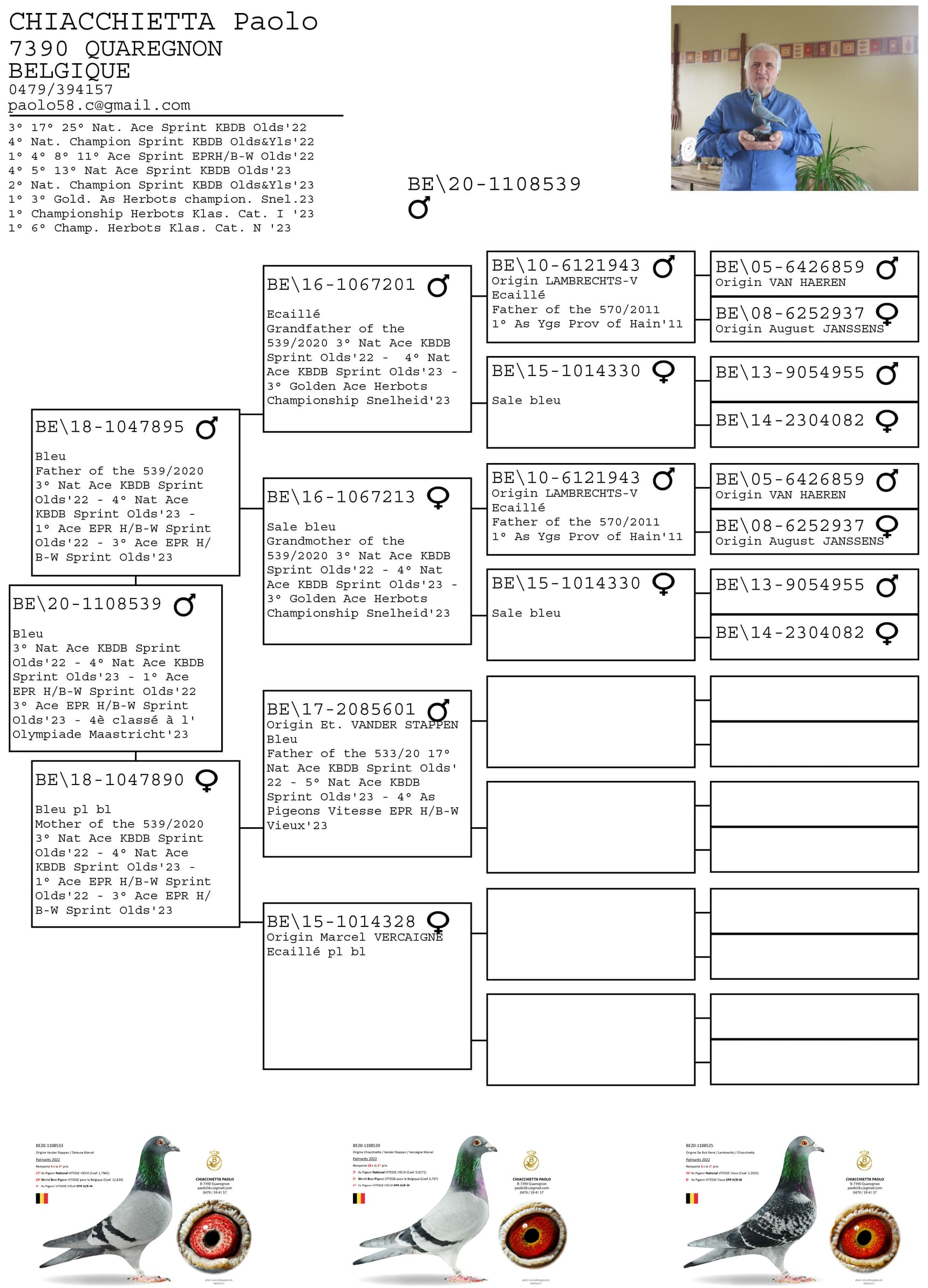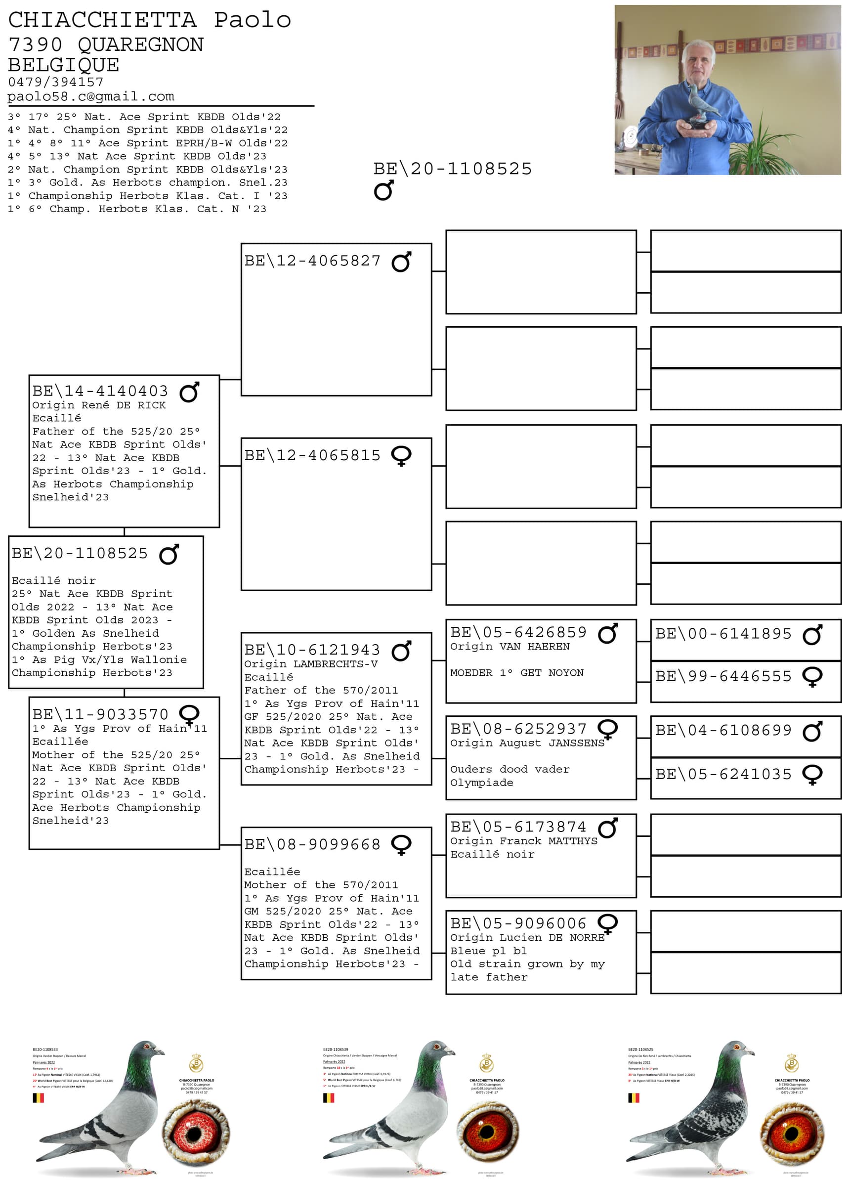 Le nom Paolo Chiachietta ne signifie peut-être pas grand-chose pour beaucoup d'entre nous, mais les habitants de la région de Quaregnon savent depuis 2020 à quel point Paolo est un colombophile fort. Paolo vivait auparavant à Hautrage (une sous-commune de Saint-Ghislain) dans la province du Hainaut, mais a déménagé à Quaregnon dans la même province en 2020. En 2020, il a élevé ses premiers jeunes pigeons sur ce nouveau site, qui étaient désormais les meilleurs pigeons de la saison 2022 et 2023. Un nouveau talent émergent qui a toujours préféré les vols de vitesse. Paolo est devenu 3e Champion National Vitesse RFCB lors de la saison 2022 et comptait ensemble 4 as pigeons nationaux vieux et yearlings. La saison dernière, il a poussé sa colonie encore plus loin et a remporté l'argent dans cette compétition. Quand on voit à quel point les courses de vitesse ont vraiment le vent en poupe et à quel point les coefficients sont si proches les uns des autres, il faut vraiment être issu d'un bon milieu pour monter sur le podium ici 2 années de suite. Dans les as pigeons nationaux, il a obtenu les 4ème, 5ème et 13ème places. Lors de nos championnats Herbots, il a remporté les 1er et 3e Golden As Sprint et à l'Olympiade de Maastricht, il a été honoré des 2e et 4e Olympiades Pigeon Cat.A pour la Belgique. Une pure super classe que nous aimerions vous présenter avec un homme extrêmement sympathique qui ne planera pas et qui aime simplement la colombophilie comme passe-temps.