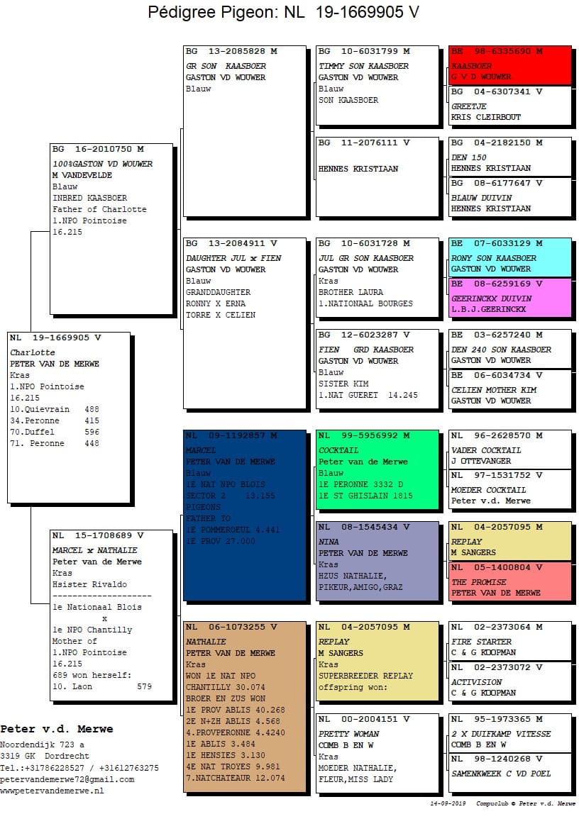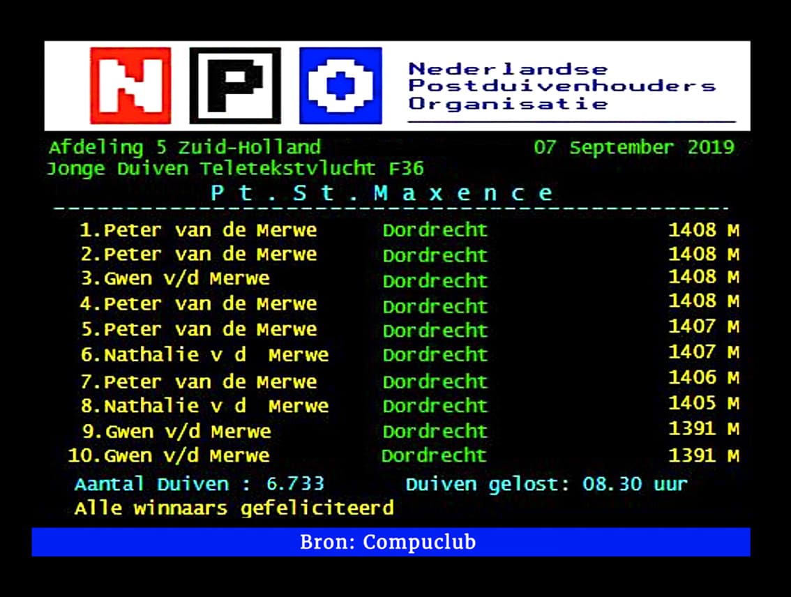 About 4 weeks before the stunt on Pont St. Maxence, the Van de Merwe family could already celebrate a victory. It was ‘Charlotte’ that won the NPO race out of Pontoise against 16,215 pigeons !