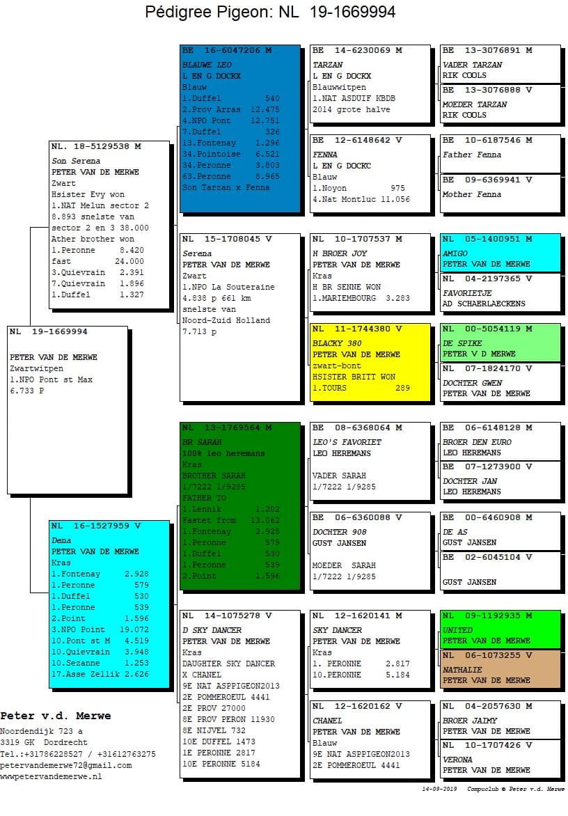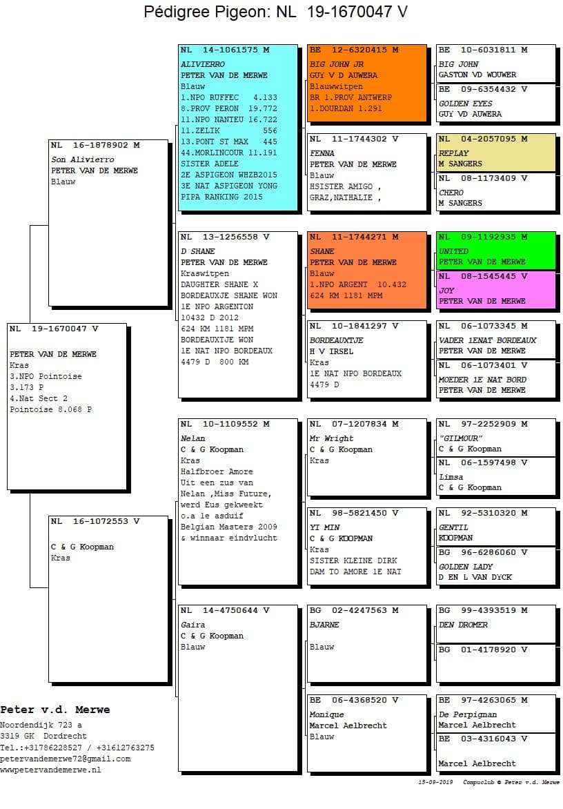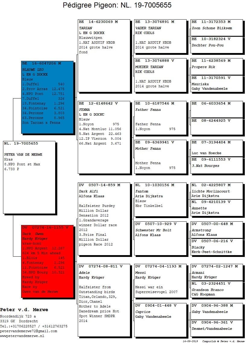 Peter is a proven asset within the Dutch pigeon sport. From the beginning on he races on the highest level possible. The love for pigeon sport is to be found in his entire family. In 1985 uncle Piet Van de Merwe, introduced Peter to pigeon sport. Until then Peter was interested in almost every kind of animal. His real love for pigeons started when Peter found an injured pigeon and nursed him until he was ready to fly home. From that moment on he lost his hart to pigeon sport. Uncle Piet saw the potential and gave Peter 11 young pigeons. Father Arie built the first loft and Dordrecht had an extra pigeon fancier. The origin of the Van de Merwe colony lays at his uncle. Later more pigeons came from the brothers De Wit (Klak/Tournier – it is a public secret that the brothers De Wit are also at the foundation of other top lofts in Holland). At Van Loon they got back then some eggs which turned out to be golden eggs. Other names that you can find in one way or the other within his strain got there by buying or co-breeding with other fanciers : Ottevanger, Ad Scharlaeckens, Cees Van de poel, Comb B&W, Marcel Sangers (100% Koopman) and the past few years he invested successfully in pigeons from Guy Van Der Auwera (especially the Goovaerts blood from Gaston Van de Wouwer) and Leo Heremans. Very recent the ‘Kittel’ – pigeons from Dirk van der Bulck were crossed in the Van de Merwe strain and the first results are more than promising and off course we can’t forget about the “Blauwe Leo” (raced himself superb and breeds real champions from Leo and Gerry Dockx) and “Dark Gwen” (another racing- and breeding wonder from Hardy Kruger).