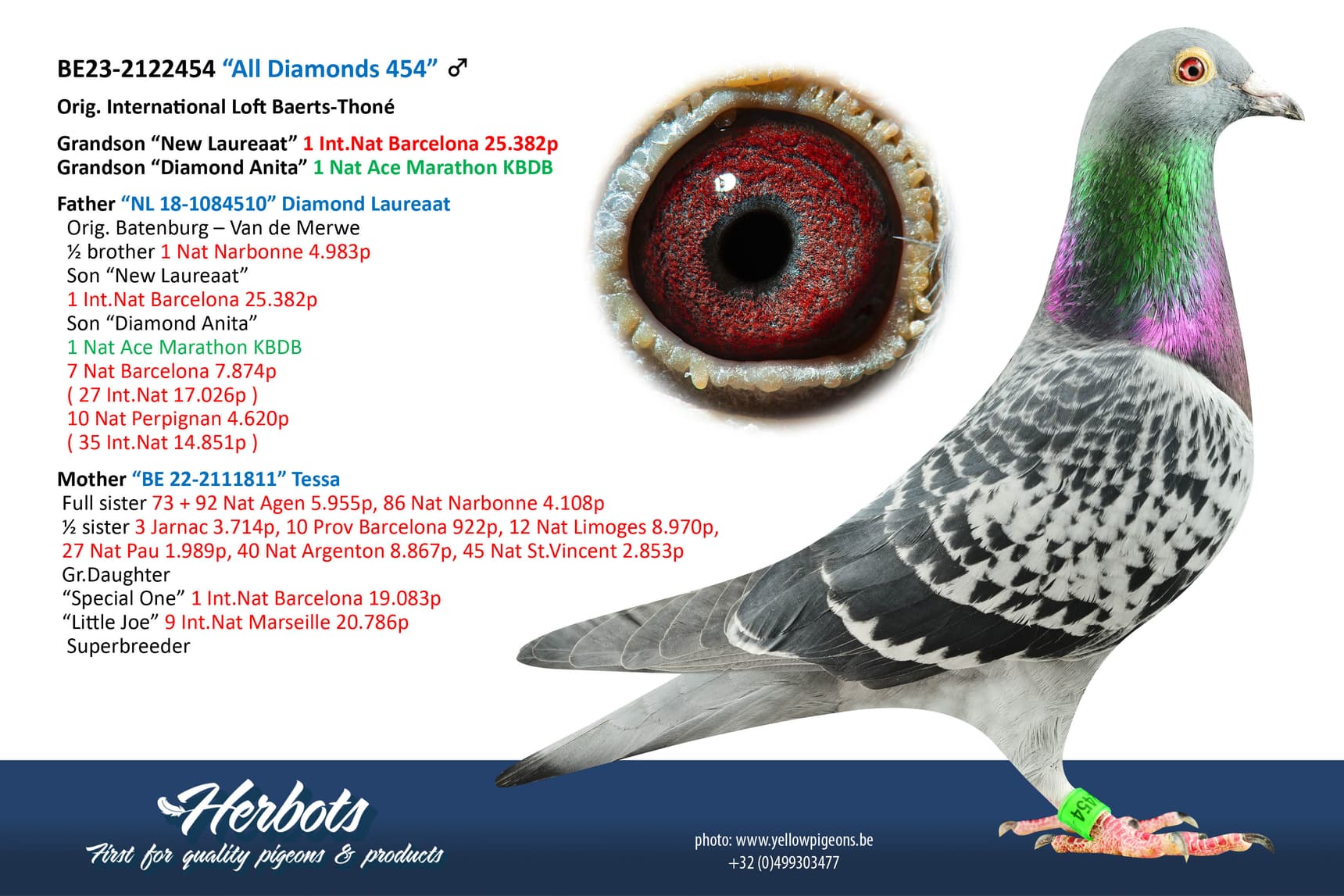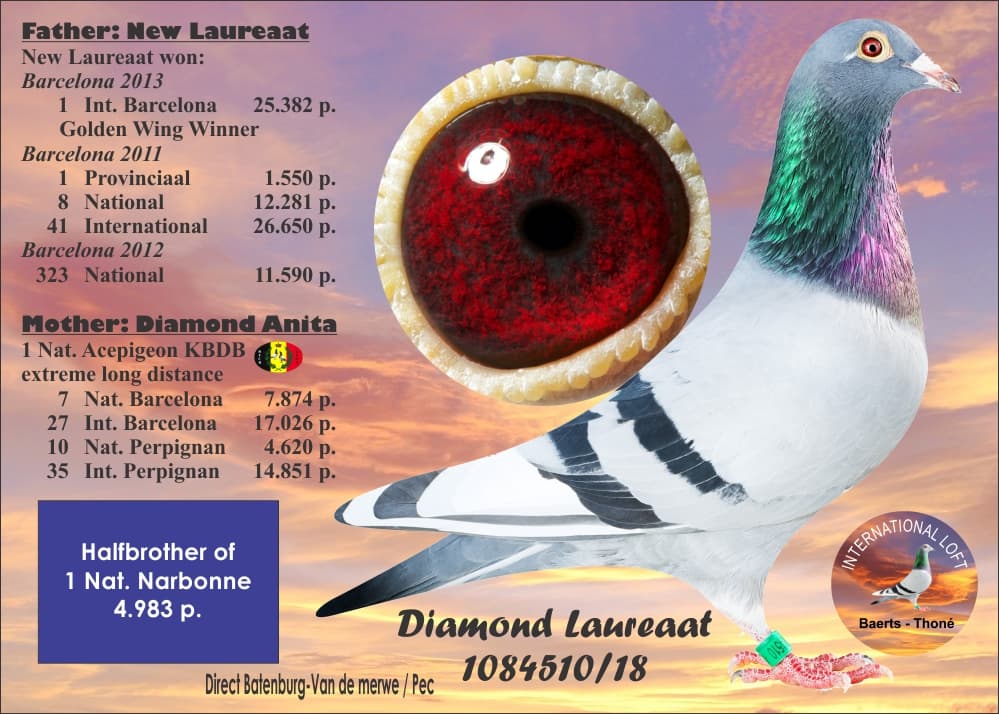 That is why they turned to Batenburg – Van de Merwe in the Netherlands, which had almost all national and especially international winners from Barcelona in its loft. Therefore, several children of New Laureaat, Jef, Special One, Queen of the Night and Lloyd moved to Grazen in Brabant and later also children of Loyd Laureaat (1 Int. Pau), Ad (1 Nat. Perpignan) and Jana (1 Int. Perpignan hens).