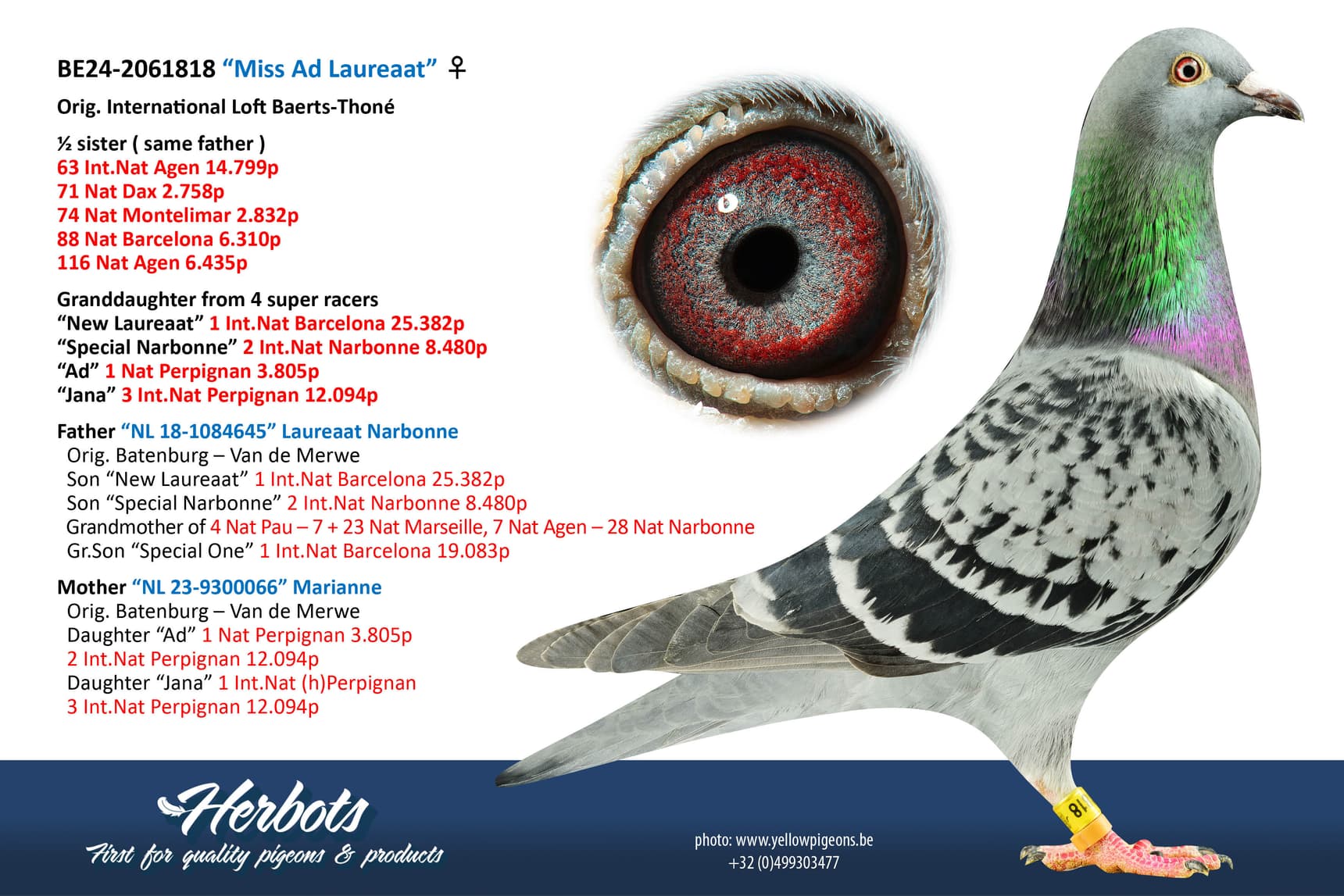 ½ sister of 4 x top 100 national in the extreme long distance and a daughter of top breeder “Laureaat Narbonne”