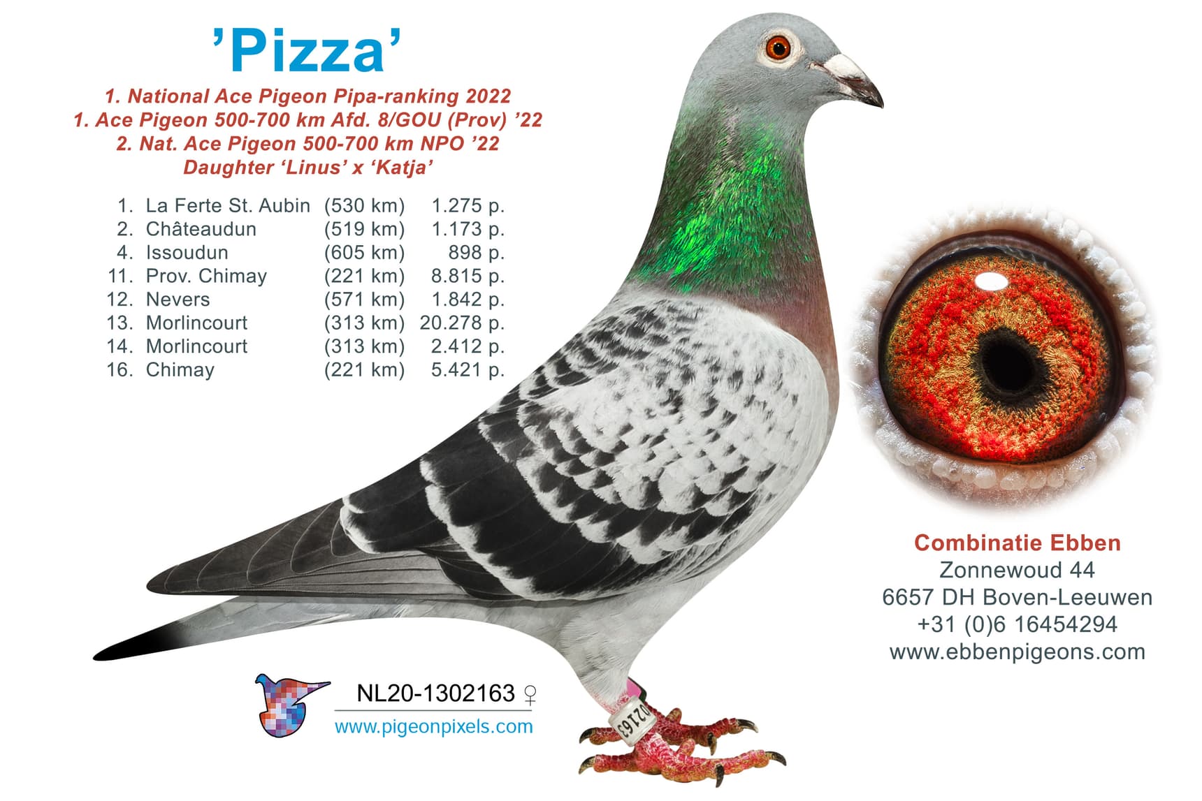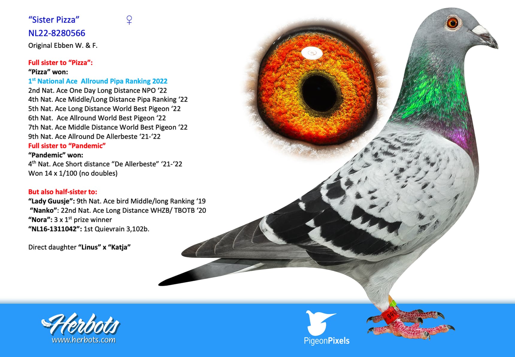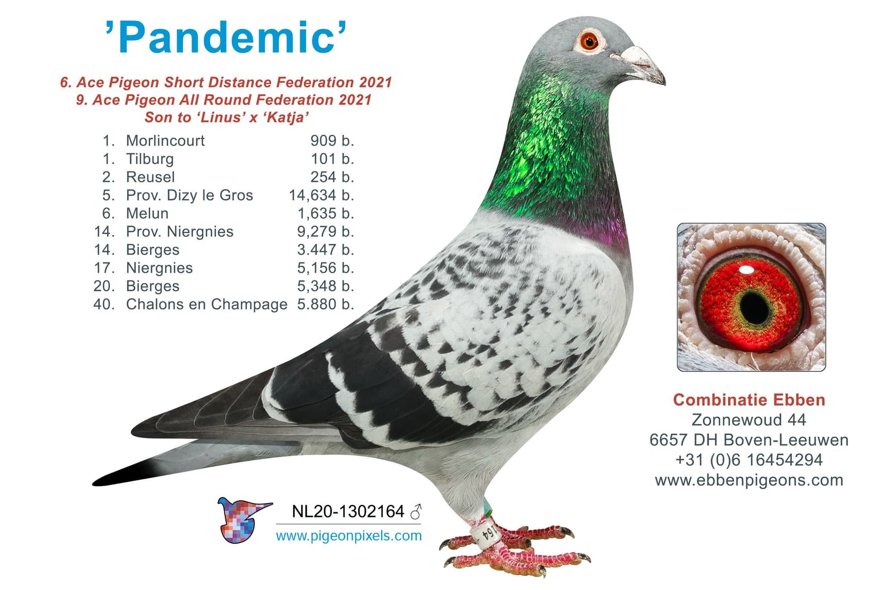 'Pandemic' is a son to NL16-1310994 'Linus' mated to NL15-1875429 'Katja'. 'Pandemic' is still in the racing loft of Combination Ebben, Boven-Leeuwen, and won 11 x 1:100 up till 21.05.2022: