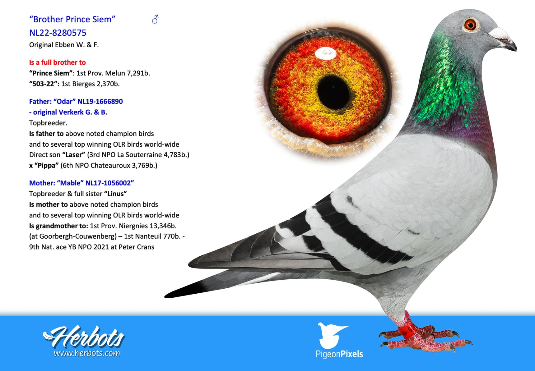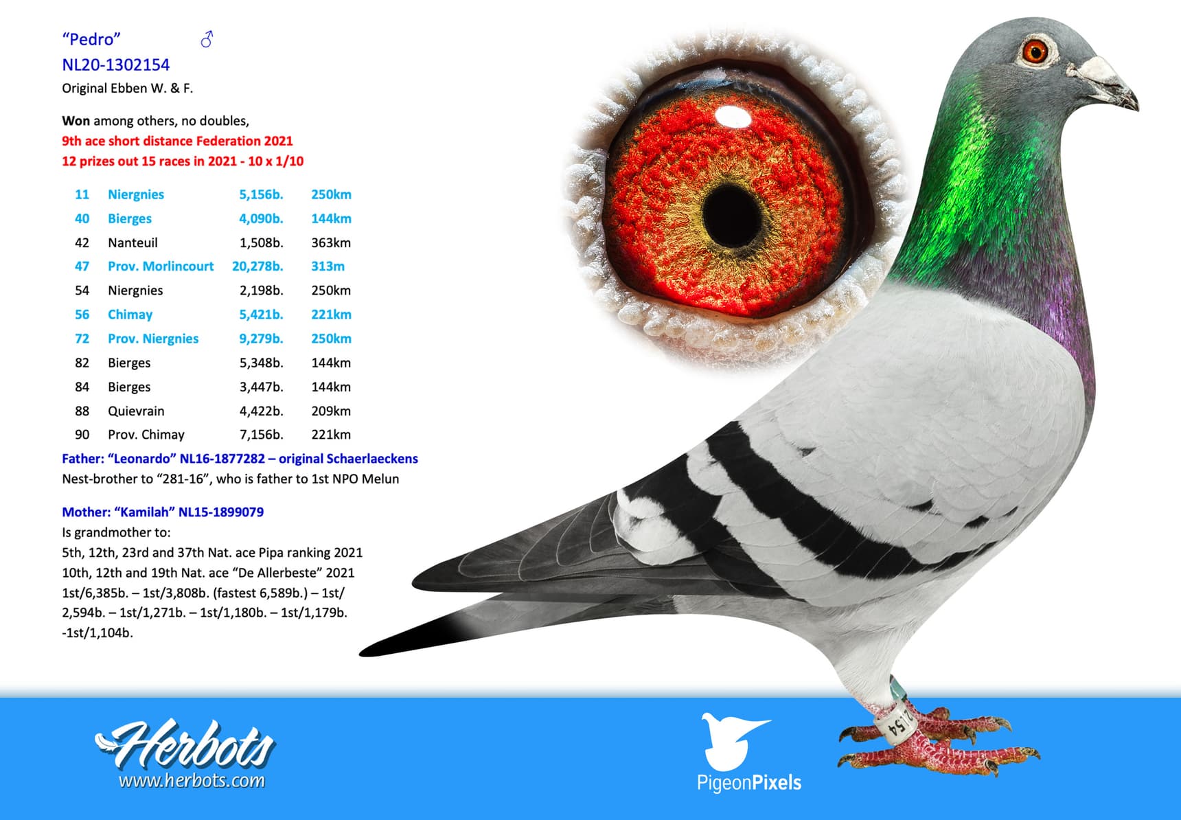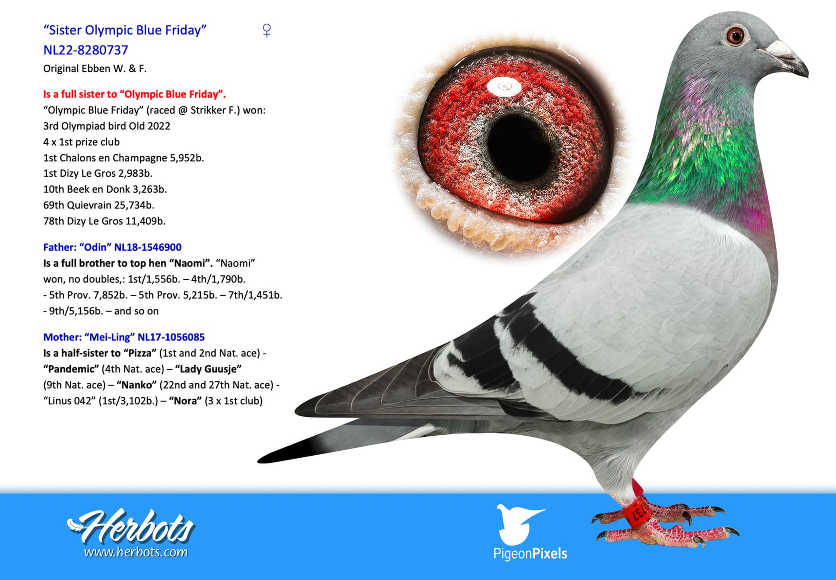 'Pandemic' is a son to NL16-1310994 'Linus' mated to NL15-1875429 'Katja'. 'Pandemic' is still in the racing loft of Combination Ebben, Boven-Leeuwen, and won 11 x 1:100 up till 21.05.2022: