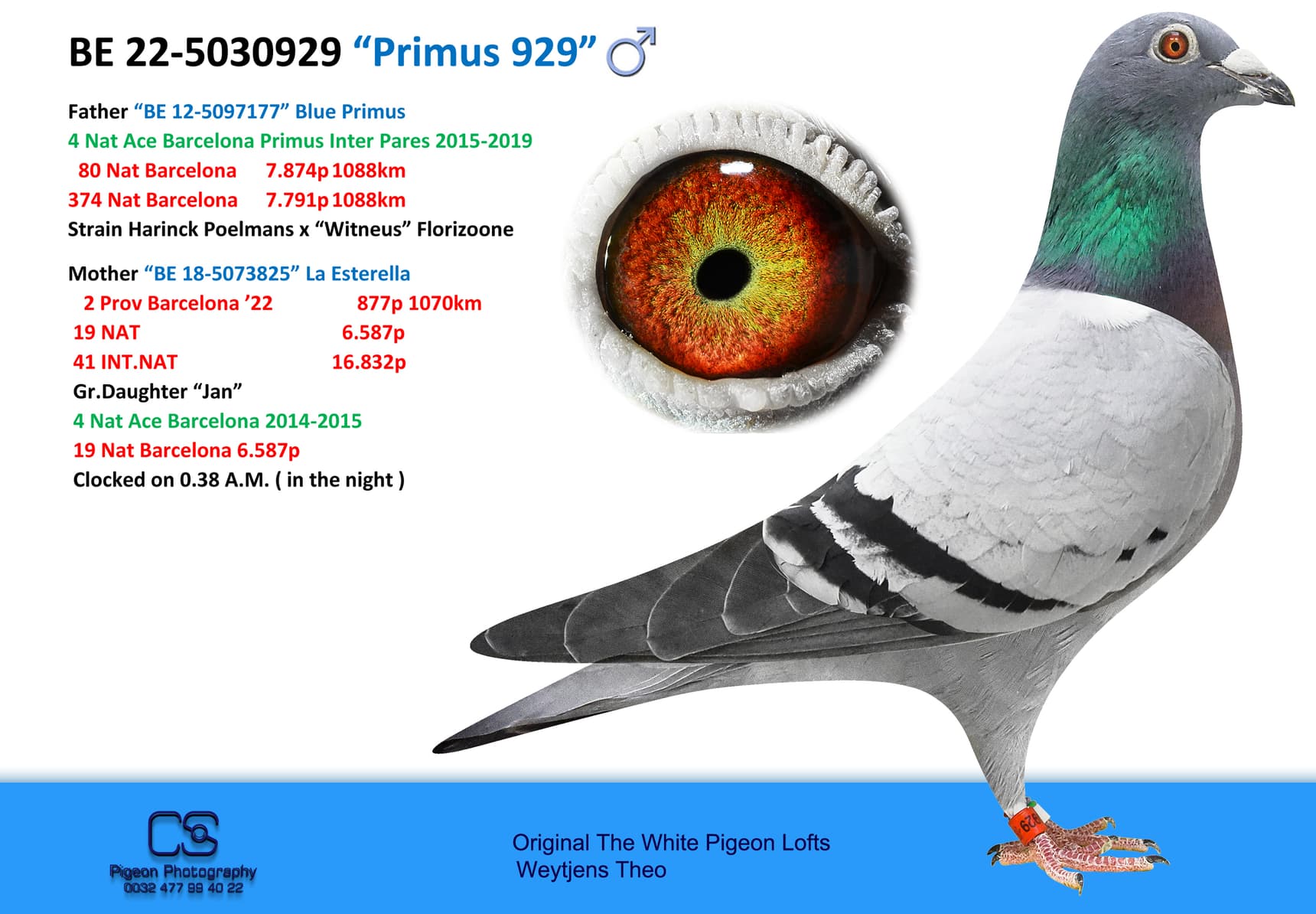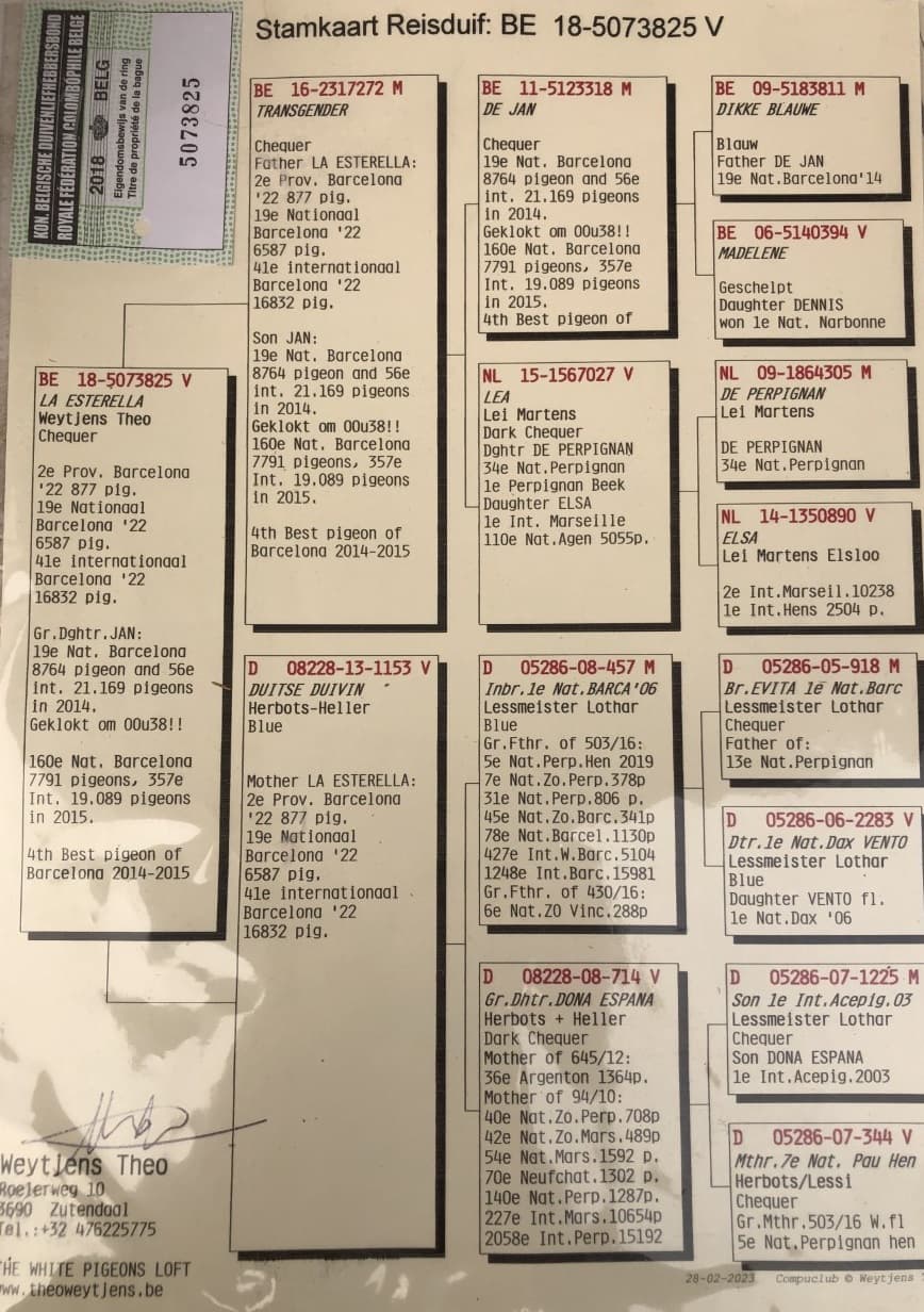 Theo Weytjens de Zutendaal dans le Limbourg n'est pas seulement un spécialiste des jeunes pigeons, mais il a également perdu son amour pour Barcelone depuis les années 1990. Là où l'accent était mis davantage sur Barcelone que sur les jeunes, les rôles sont désormais inversés et il ne joue ce classique espagnol qu'avec une équipe plus petite. Au cours de ses meilleures années, il a remporté plusieurs pigeons dans le top 100 national, le point culminant étant les 2 toppers qui avaient tous deux "177" à l'arrière comme numéros de bague. Au cours de la période 2015-2019, ils ont brillamment couru année après année à Barcelone et dans d'autres courses de fond extrême. Ils sont devenus 4e et 5e Primus Inter Pares en 2019 en brillant 5 années de suite. La base de ces pigeons est venue de Harinck Poelmans et Roger Florizoone. C'était un vrai couple de haut niveau qui a produit plusieurs super coureurs.
