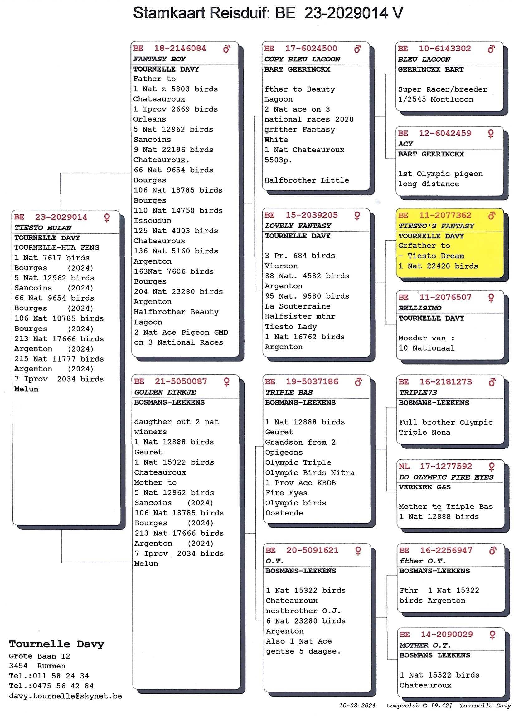 Le nom fait référence d'une part au pigeon « Tiësto » (l'éleveur de base de Davy) et d'autre part à « Mulan », une figure mythique de l'histoire de la Chine. Et que « Tiësto Mulan » soit tout simplement en lice pour le championnat national des as de la KBDB. Avec ce 1er prix national, elle affûte son coefficient et terminera sur la 3ème place du podium.