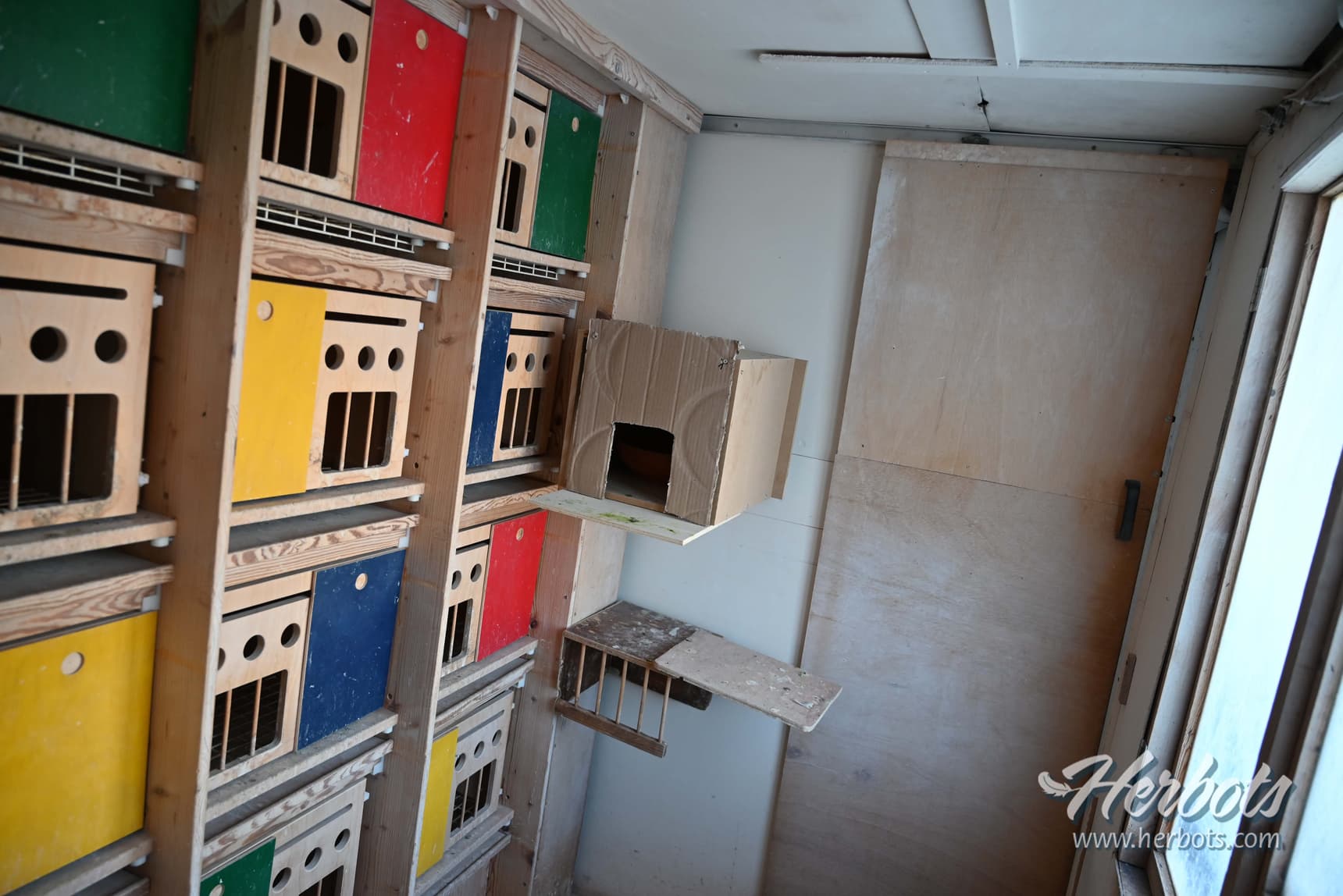 Début mars, dès que le temps l'a permis, nous avons commencé l'entraînement. De l'attelage, beaucoup d'attelage. Pendant 2 à 3 semaines, ils ont été conduits tous les jours jusqu'à la frontière (120 km). Après cette période d'entraînement, elles partent chaque semaine. Pendant la saison, les semaines où il n'y a pas de concours national, les pigeons sont également conduits à la frontière. À la maison, ils s'entraînent une fois et de préférence deux fois par jour. Les mâles peuvent s'entraîner librement et les femelles sont maintenues en vol avec le drapeau. Avant le vol, les femelles peuvent voir leur partenaire, mais pas les mâles. Au retour, les mâles sont autorisés à rester avec leur partenaire jusqu'à l'heure du dîner à 17h, puis ils se séparent. Les femelles peuvent voir leurs partenaires, mais elles ne peuvent pas les atteindre.