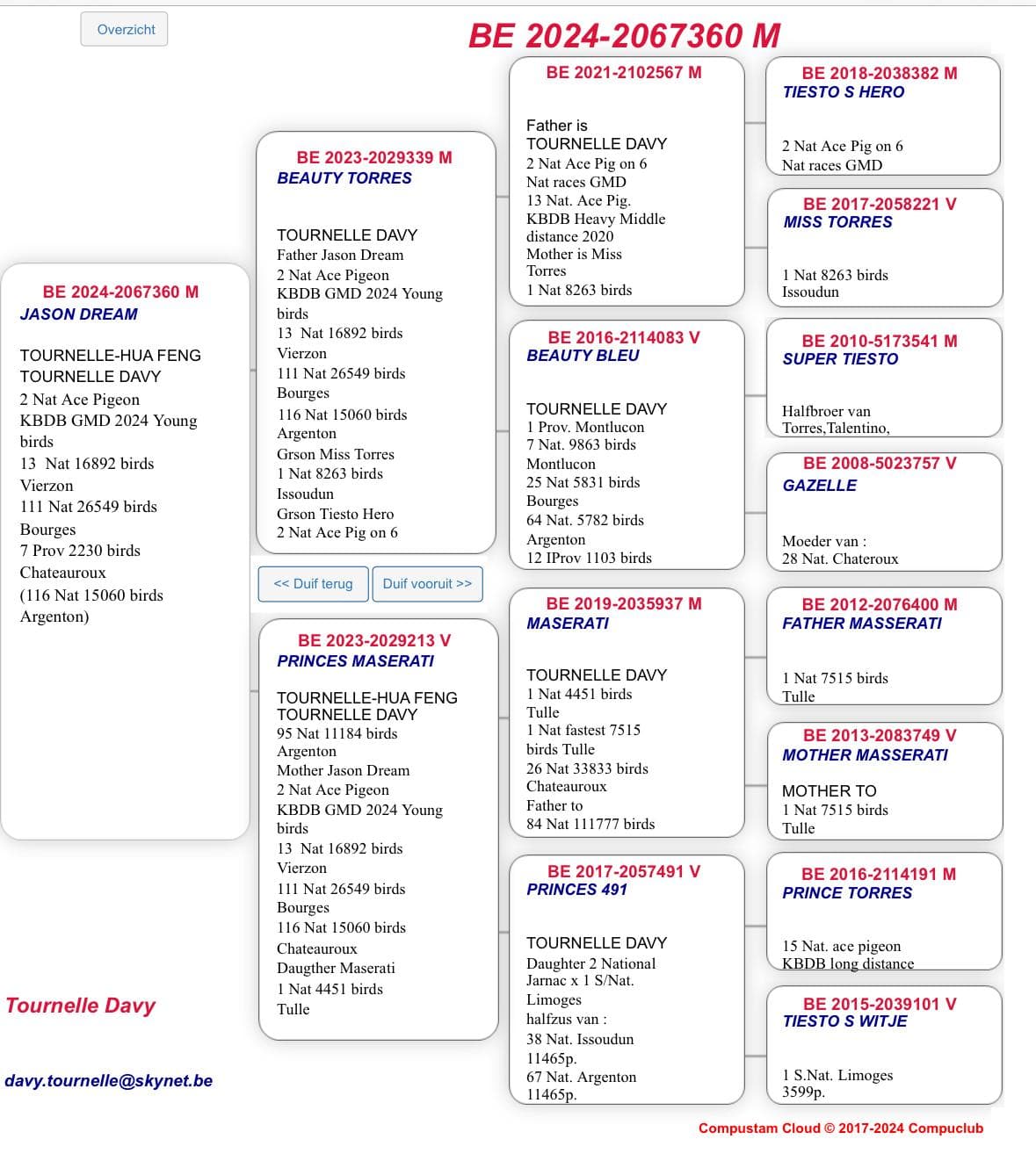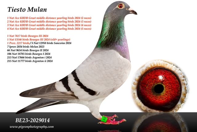 Son of “567/21” Son of Tiesto's Hero 2 Nat. Ace Pigeon GMD ( 6 KBDB races ) x “Miss Torres” 1 Nat Issoudun 8,263p