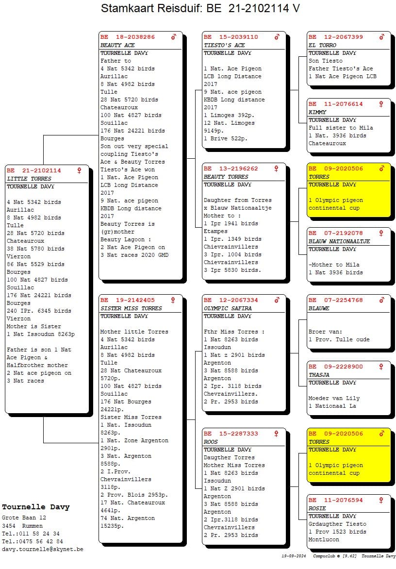 Son of “BE 15-110” Tiesto’s Ace – 9th Nat Ace Pigeon Long Distance KBDB 2017 and won 12th Nat Limoges 9,149p x “BE 13-262” Beauty Torres is grandmother of “Blue Lagoon” 2nd Nat Ace Pigeon Zw.H.F. 2020 over 3 races