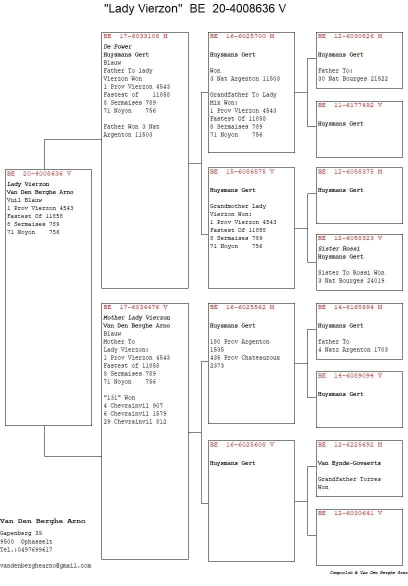 Après quelques bonnes saisons sur les courses de courte distance, son objectif a changé et il se concentre plus sur les courses de moyenne distance et de moyenne distance supérieure. Pour cette raison il a cherché le renfort nécessaire et ceux-ci ont été trouvés en premier lieu chez Gert Huysmans (Balen). En 2015, des jeunes sont nés parmi les coureurs (nés en août) mais l'erreur a été commise en essayant de les faire voyager. Les jeunes inexpérimentés ont été jetés devant les lions trop rapidement avec comme résultat que beaucoup d'entre eux se sont perdus. Néanmoins, la foi dans la force des pigeons Huysmans était grande et c'est pourquoi il a acheté des jeunes des voyageurs à nouveau en 2017, mais maintenant ils ont obtenu un billet directement vers le pigeonnier d'élevage. Une bonne décision puisque le gagnant provincial de Vierzon est un produit 100% Huysmans.