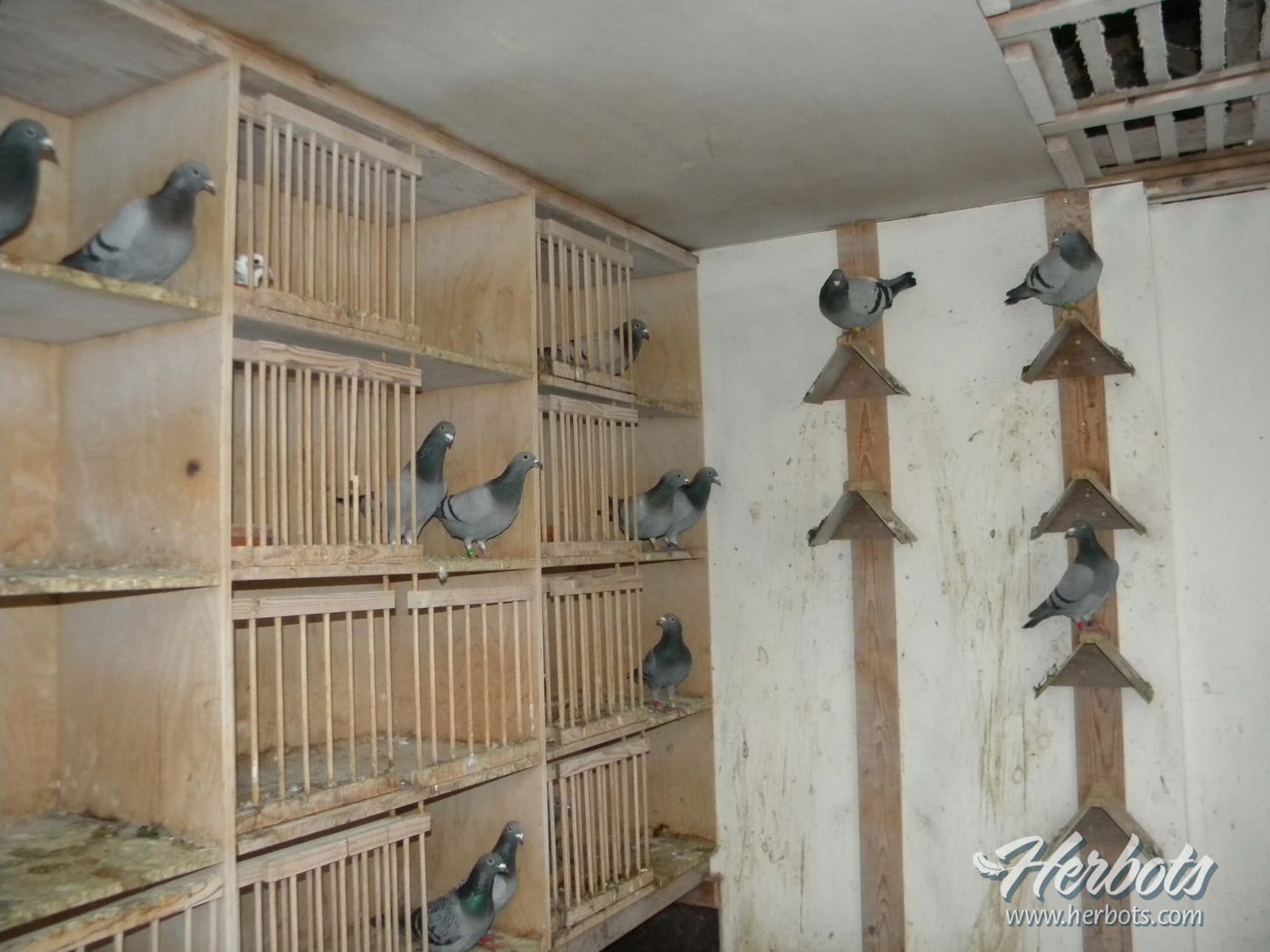Les pigeonniers sont orientés vers le sud et disposent d'une petite volière. Il est remarquable que les femelles ne passent pas beaucoup de temps dans le parcours extérieur. Les femelles sont dans de petites boîtes et le sol est recouvert de grilles en bois. Les boîtes sont nettoyées tous les jours, ce qui se fait également dans le grenier des jeunes. Il y a un couloir devant les pigeonniers et la ventilation se fait par le plafond où une bande d'environ 50 cm est ouverte.