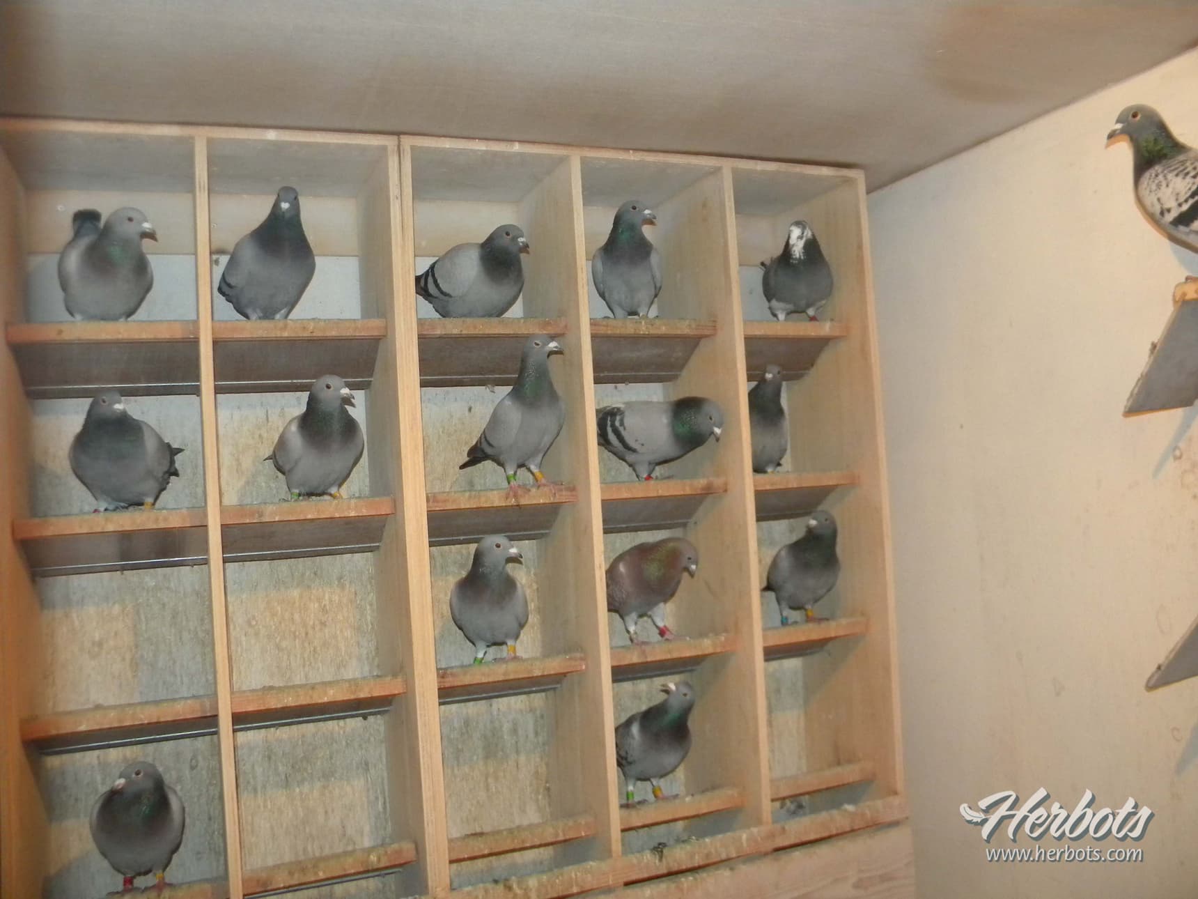 La différence entre aujourd'hui et hier est que sur les courses de vitesse, seules les femelles étaient utilisées en veuvage classique. Aujourd'hui, les courses lourdes de moyenne distance sont disputées exclusivement avec des femelles. A la fin du mois de novembre, des couples de reproducteurs et de femelles de course ont été constitués. 18 couples de reproducteurs plus 8 couples de reproducteurs où sont placés les œufs des meilleurs couples de reproducteurs. Les œufs des meilleures femelles de course sont déplacés et elles peuvent alors pondre à nouveau et élever ce nid elles-mêmes. Lorsque les jeunes atteignent un certain âge, les femelles sont retirées du pigeonnier et rejoignent leur pigeonnier de course. Les femelles reçoivent une alimentation légère le dimanche et le lundi et sont nourries à partir du mardi. Le mercredi et le jeudi, le mélange sportif est complet. Le mélange Vaessen, introduit par Franky Appelmans, est un autre aliment utilisé pour les reproducteurs lorsqu'ils se reposent. Celles de Probelfly sont utilisées comme sous-produits.