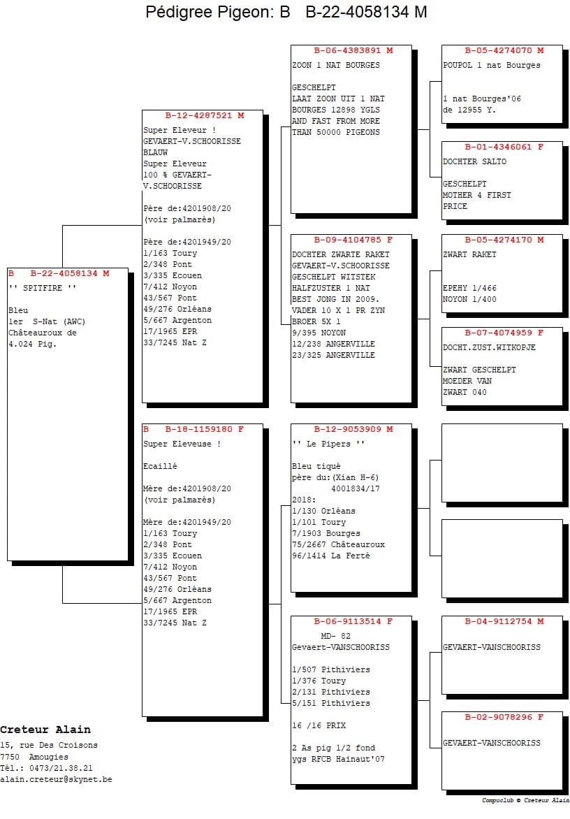 Alain Créteur, enseignant âgé de 55 ans, peut compter sur l’aide précieuse de son épouse Emmanuelle et de leurs 2 garçons (Arnaud 22 ans et Antoine 26 ans), car ceux-ci n’hésitent pas à donner un coup de main, pour la bonne gestion de la colonie. Et il tient à associer à cette victoire le tandem Gevaert-Van Schoorisse de Renaix, car cela fait plus de 30 ans, que Jean-Pierre Gevaert et Alain Créteur se sont liés d’amitiés (Jean-Pierre assistant régulièrement aux arrivées des pigeons d’Alain, depuis qu’il a arrêté la colombophilie). La majorité des pigeons sont donc d’origine ‘Gevaert-Van Schoorisse’, grand champion belge, qui a aussi remporté 2 premiers nationaux (Bourges et Argenton). Dans le pédigrée du vainqueur de Châteauroux, coule d’ailleurs le sang de ‘Poupol’ vainqueur du 1er Nat. Bourges en 2006. Dernièrement des sujets de la colonie ‘Patrick Cherain’ (Bleid) ont aussi été introduits pour allonger la distance.