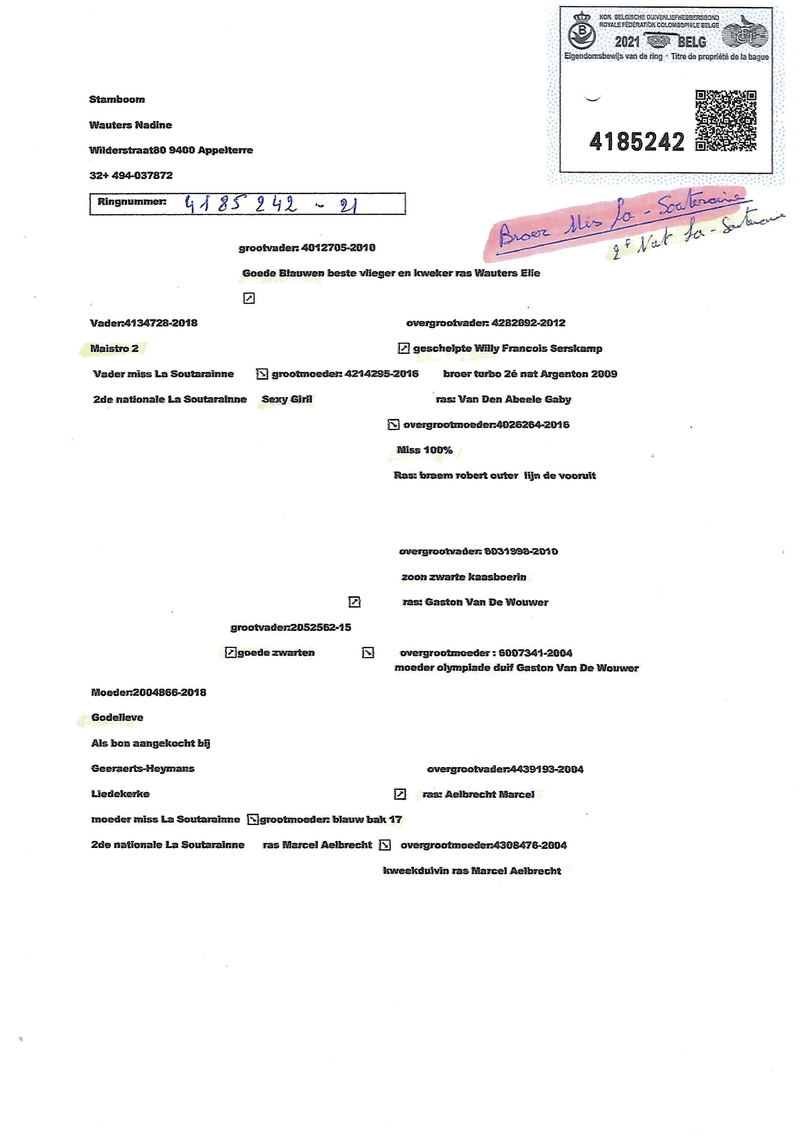 C'est le nom du lauréat national de Brive. "Papa's Friend" est comme dit précédemment un plein frère de "Miss La Souterraine" et provient du couplage "Maistro 2" (B18-4134728) x "Godelieve" (B18-2004866). Ainsi, nous voyons dans le père de "l'ami de papa" le "Goeden Blauwen", le pigeon de réserve de feu Elie Wauters. Il a été croisé avec la variété de Willy Francois et Robert Braem. La mère de ce gagnant national a été achetée comme coupon chez Geeraerts-Heymans. Elle a dans ses gènes le sang noble de Gaston Van De Wouwer et de Marcel Aelbrecht.
