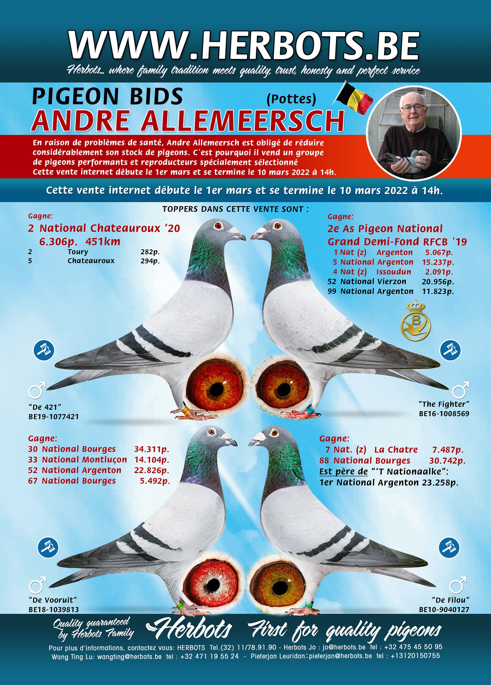 Pour des raisons de santé, Andre Allemeersch est obligé de réduire fortement le nombre de pigeons. Pour cette raison, il met en vente un groupe strictement sélectionné de pigeons de performance et de reproduction.