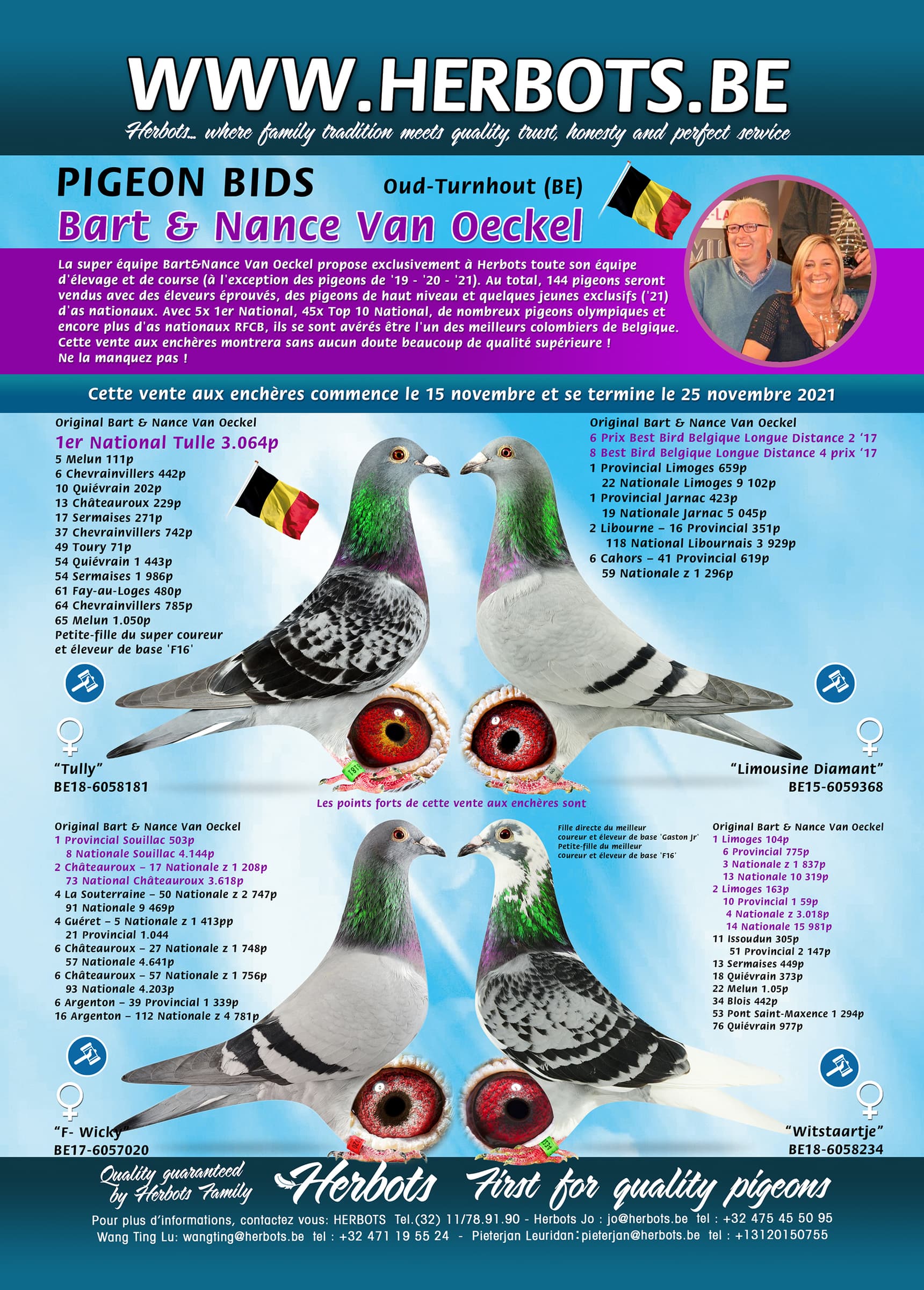 La super équipe Bart&Nance Van Oeckel propose exclusivement à Herbots toute son équipe d'élevage et de course (à l'exception des pigeons de '19 - '20 - '21). Au total, 144 pigeons seront vendus avec des éleveurs éprouvés, des pigeons de haut niveau et quelques jeunes exclusifs ('21) d'as nationaux. Avec 5x 1er National, 45x Top 10 National, de nombreux pigeons olympiques et encore plus d'as nationaux RFCB, ils se sont avérés être l'un des meilleurs colombiers de Belgique. Cette vente aux enchères montrera sans aucun doute beaucoup de qualité supérieure ! Ne la manquez pas !