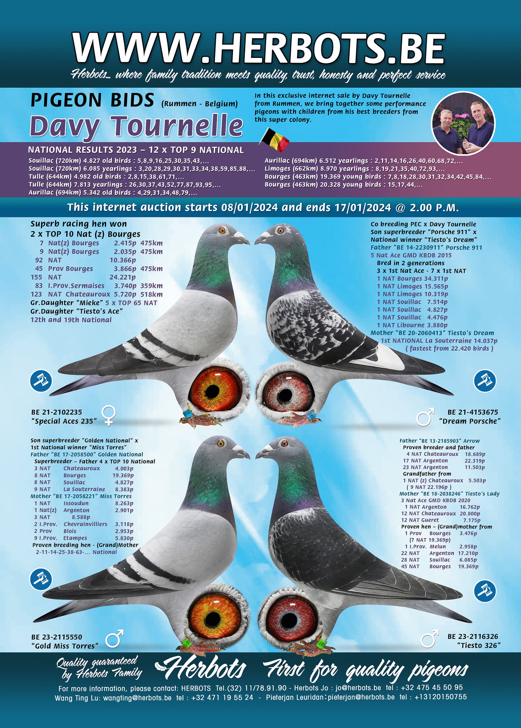 Dans cette vente Internet exclusive de Davy Tournelle de Rummen, nous réunissons quelques pigeons de performance avec des enfants de ses meilleurs reproducteurs de cette super colonie.