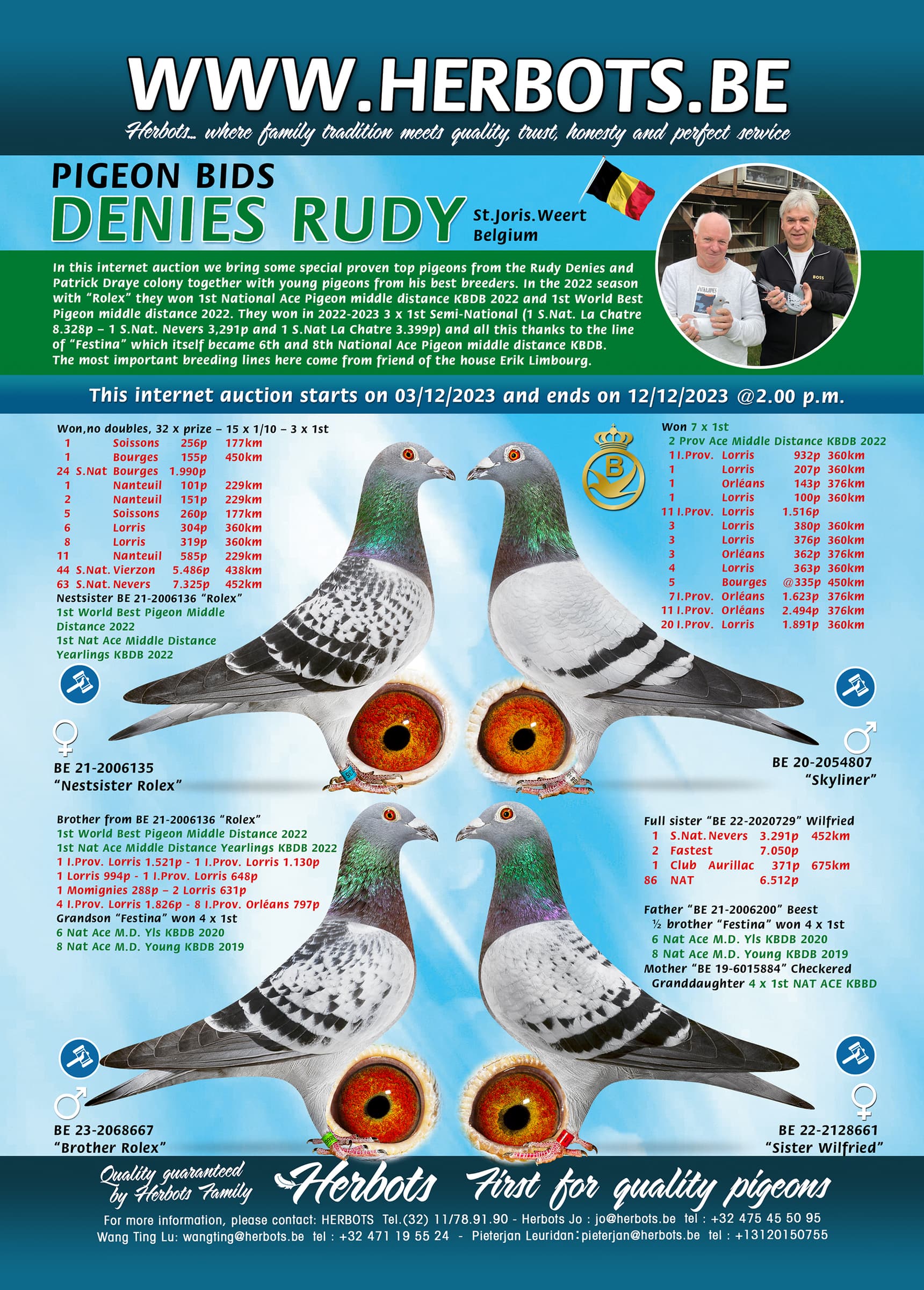 Dans cette vente sur Internet, nous réunissons quelques pigeons passionnés de la colonie de Rudy Denies et Patrick Draye ainsi que des jeunes pigeons de ses meilleurs éleveurs. Lors de la saison 2022 avec « Rolex », ils ont remporté le 1er As Pigeon National demi-fond RFCB 2022 et le 1er Meilleur Pigeon du Monde demi-fond 2022. Ils ont remporté 3 x 1er Semi-National (1 S.Nat. La Chatre 8,328d – 1 S) en 3 saisons..Nat Nevers 3.291d et 1 S.Nat La Chatre 3.399d) et tout cela grâce à la lignée de « Festina » qui elle-même est devenue 6ème et 8ème As Pigeon National demi-fond RFCB. Les lignées d'élevage les plus importantes ici proviennent de l'ami de la maison Erik Limbourg.