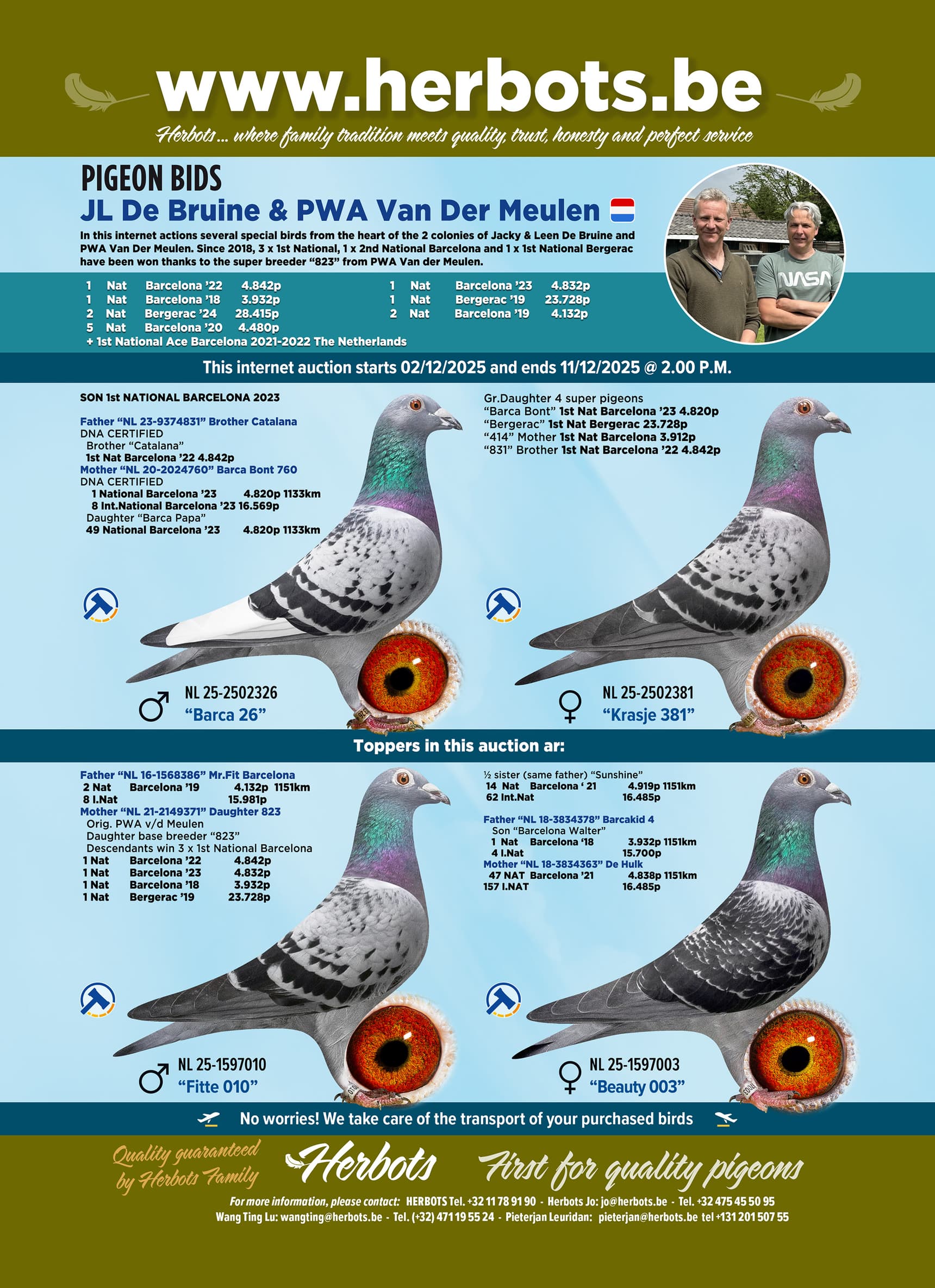 Dans cette vente internet joyaux du cœur des 2 colonies de Jacky & Leen De Bruine et PWA Van Der Meulen. Depuis 2018, 3 x 1er National, 1 x 2e National Barcelone et 1 x 1er National Bergerac ont été remportés grâce au super éleveur « 823 » de PWA Van der Meulen.