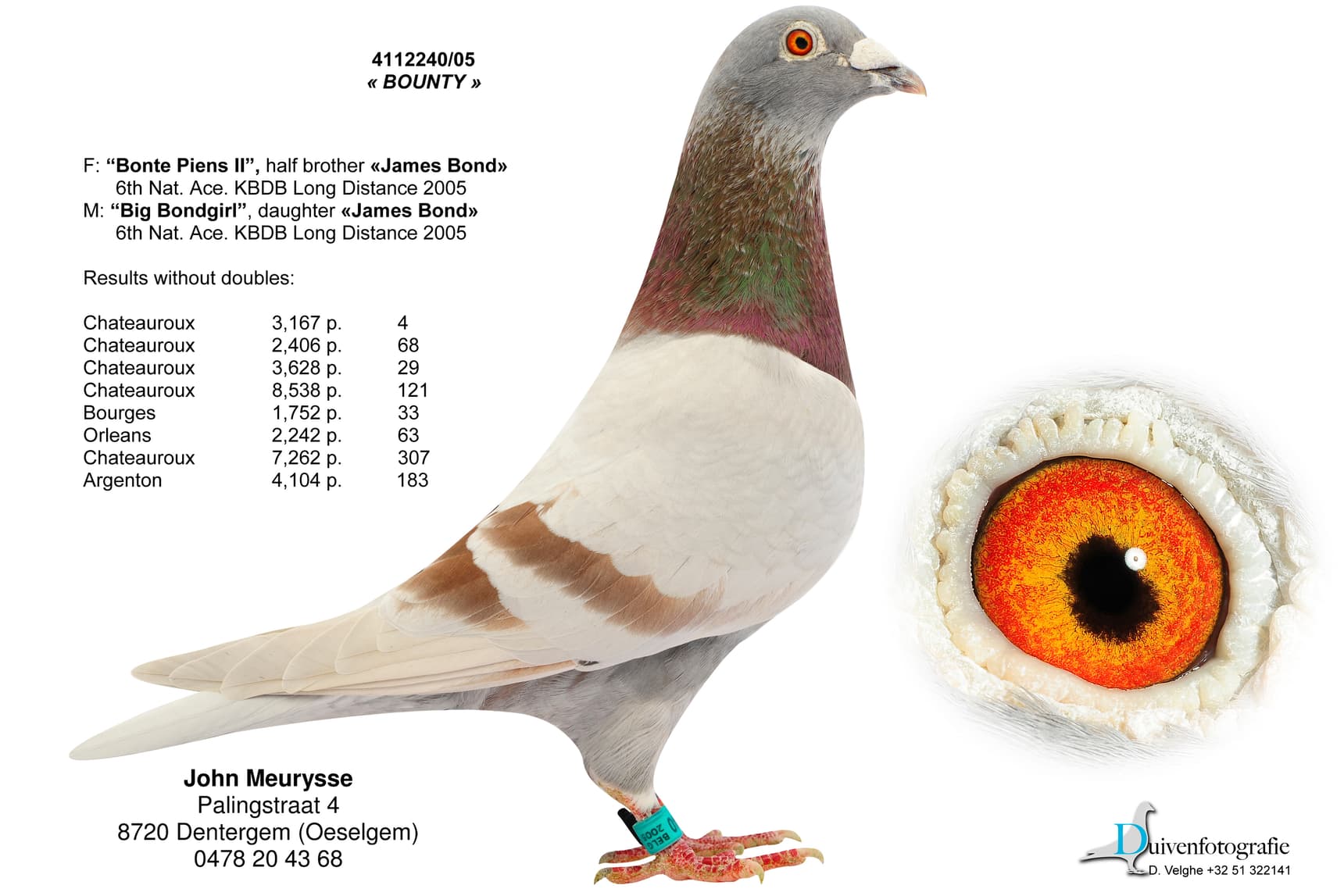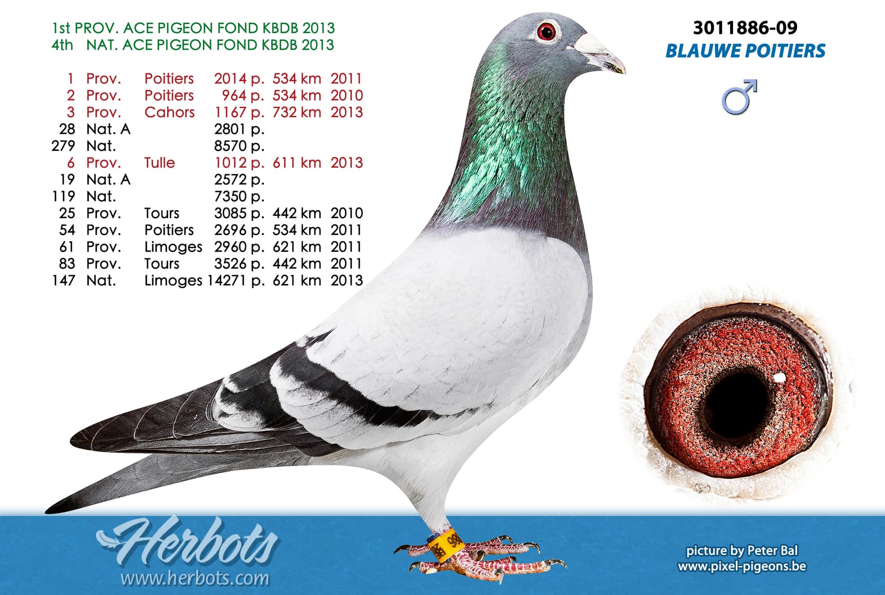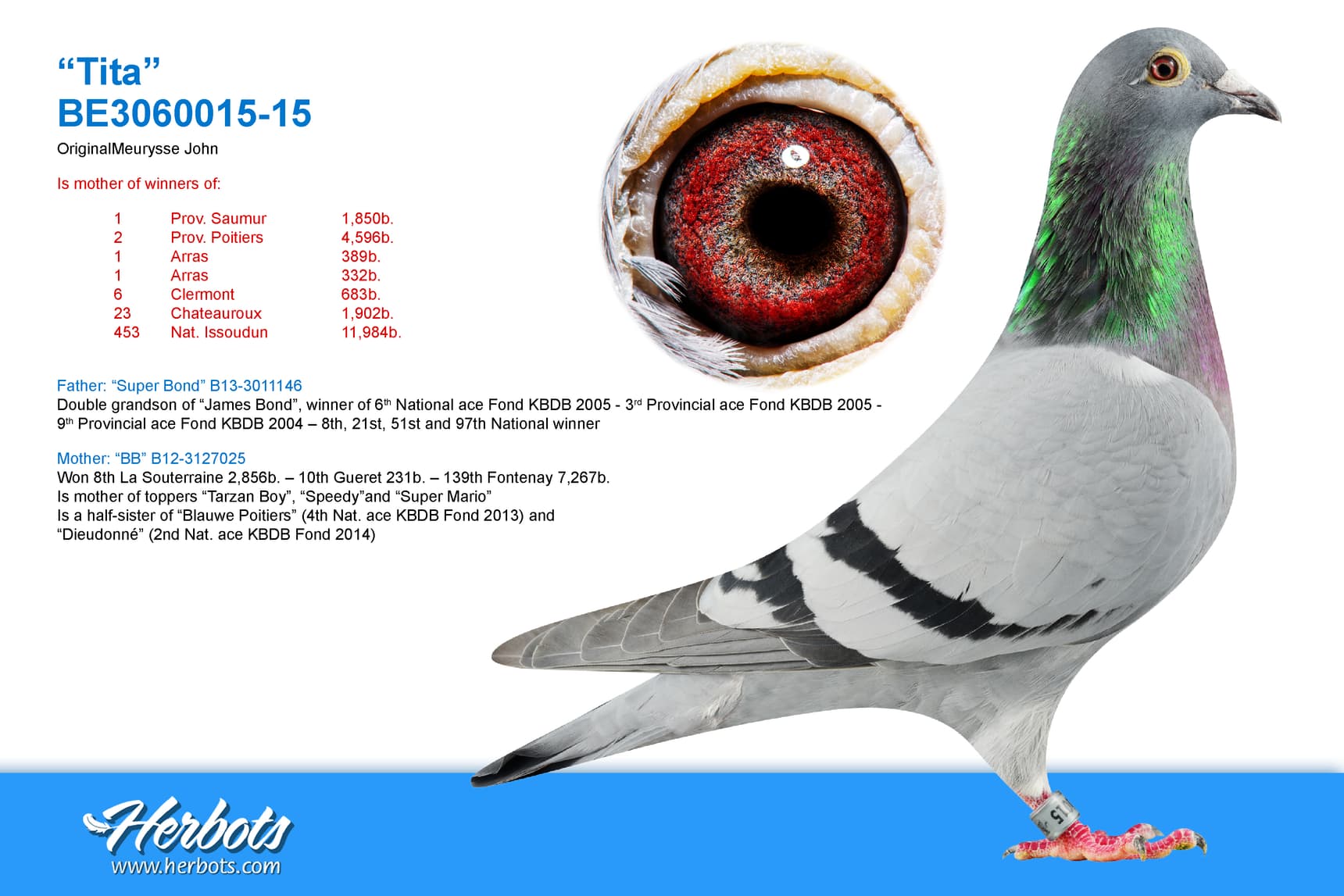 Half-sister of “Tita”, mother of: 1 Prov. Saumur 1,850b. - 1 Club Poitiers 492b. - 2 Prov. Poitiers 4,596b. - 1 Arras 389b. - 1 Arras 332b. - Half-sister of “Speedy” : winner of 1st, 2nd, 3rd, 7th and 8th prize winner in ‘14 - Half-sister of “048”: 1st, 4 x 2nd and 3rd prize winner in ‘15